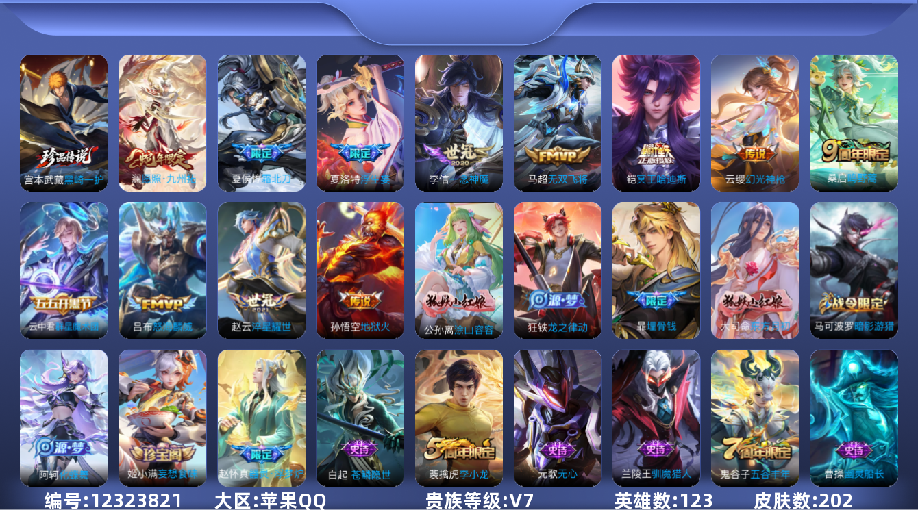 [12323821]V7 1珍品传说 12传说 123英雄 202皮肤 可修改实名 优质装备:黑崎一护,一念神魔,地狱火,淬星耀世,无双飞将,浮生妄,云中君群星魔术团,涂山容容 传说皮:铠冥王哈迪斯,幻光神枪 珍宝阁皮:妄想食味,蔷薇恋人 限定皮:愿照·九州拓(澜年限),鸣野蒿,夏侯惇霜北刀,怒海麟威,五谷丰年,梁祝,李小龙 史诗皮:苍鳞隐世,器灵·浮梦炉,化蝶舞,星界战将,龙之律动,东方月初,埋骨钱,芈月浮光幕影,上官婉儿群星魔术团,特工魅影,江河有灵,偶像歌手,猫狗日记-孙策,水果甜心,星夜王子,德古拉伯爵,暗隐猎兽者,幽灵船长,纤云弄巧,繁星吟游(呼啦呼啦),金属风暴,原初追逐者,圣诞恋歌,鹰眼统帅,魅力维加斯,黎明之约,无心