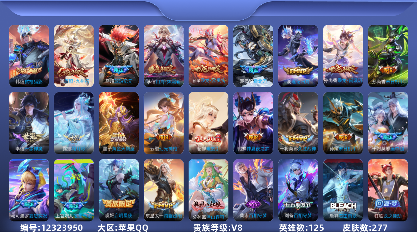 - [12293089]V8 1典藏 1珍品传说 23传说 124英雄 287皮肤 可修改实名 优质装备:弑枪猎影(韩信典藏),黑崎一护,黄金狮子座,云鹰飞将(小将军),炽阳神光,一念神魔,地狱火,地狱之眼,无双飞将,山海·炽霜斩(李信年限),山海·苍雷引(电光曜子),惊梅引 传说皮:乘龙·铭钟鼎(赵云年限),典韦战鼓燎原 珍宝阁皮:优雅恋人,蔷薇恋人,玩趣恶龙 限定皮:愿照·九州拓(澜年限),愿照·山河定(司空震年限),鸣野蒿,至尊宝,傲雪梅枪,时雨天司(水龙头),飞衡(韩信年限),影龙天霄,高山流水,诗剑行,齐天大圣,怒海麟威,五谷丰年,青龙志(铠年限),梁祝,岱宗(典韦年限),李小龙,孙行者,大圣娶亲,引擎之心,寅虎·赤拳(老虎年限),深海之息(深海大菠萝),山海·玄木吟(马可年限) 史诗皮:器灵·浮梦炉,星界战将,龙之律动,石田雨龙,茶境仙,怒海争锋,破空之剑,百相守梦-百里守约,百相守梦-黄忠,紫霞仙子,黄金分割率,特工魅影,千年之狐,江河有灵,百解令(蒙犽),蒙恬荣光圣徽,匿光破解者,偶像歌手,电玩·爆裂旋风,百相守梦(刘备),龙骑士(小龙虾),猫狗日记-孙策,乱世虎臣,节奏热浪,修罗,女仆咖啡,摇滚巨星,水果甜心,星夜王子,功夫厨神,德古拉伯爵,暗隐猎兽者,幽灵船长,鬼剑武藏,暗渊魔法,心灵战警,舞动绿茵,地狱岩魂,拒霜思,乘风破浪,水晶猎龙者,热力回旋,金属风暴,原初追逐者,圣诞恋歌,鹰眼统帅,魅力维加斯,赏金猎手,无心,未来纪元-赵云