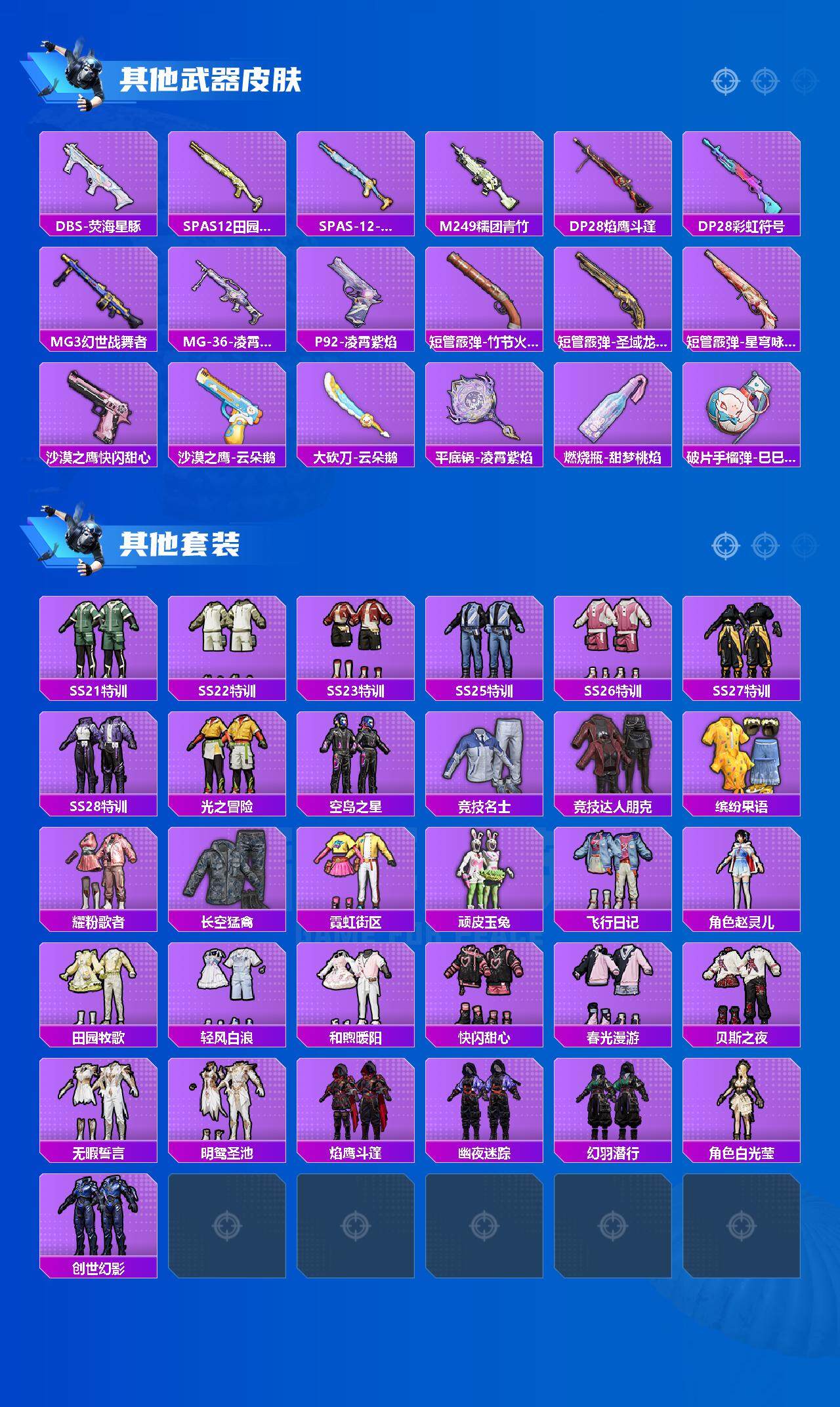 【稀有枪皮】:AKM-彩虹符号,AKM-破晓战魂,AKM-霓虹街区,M16A4-最终圣卫者,SCAR-L-炫彩节奏,SCAR-L-玉兔迎春,SCAR-L-红色方程式,SCAR-L-冷漠罗丽,M416-红色方程式,M416-蓝色火焰,M416-萌萌史莱姆,GROZA-田园牧歌,AUG-耀粉歌者,QBZ-彩虹符号,M762-天降萌叽,M762-彩虹符号,M762-云朵鹅,G36C-星穹咏叹调,AC-VAL-天降萌叽,AC-VAL-快闪甜心,蜜獾-天降萌叽,ARX-凌霄紫焰,UZI-啾咪啾咪,UZI-天降萌叽,UMP45-蓝色火焰,Vector-焰鹰斗篷,Vector-生命誓言,Vector-田园牧歌,汤姆逊-耀粉歌者,汤姆逊-幻星舰长,JS9-凌霄紫焰,P90-快闪甜心,P90-巳巳如意,Kar98K-彩虹符号,Kar98K-红色方程式,Kar98K-星穹咏叹调,M24-幻彩电音,AWM-焰鹰斗篷,VSS-田园牧歌,Mini14-耀粉歌者,AMR-镜光幻境,MK20-H-快闪甜心,MK20-H-圣域龙灵,SVD-云朵鹅,S686-彩虹符号,S686-生命誓言,S686-巳巳如意,S12K-玩趣呆呆,S12K-破晓战魂,S12K-智耀战神,