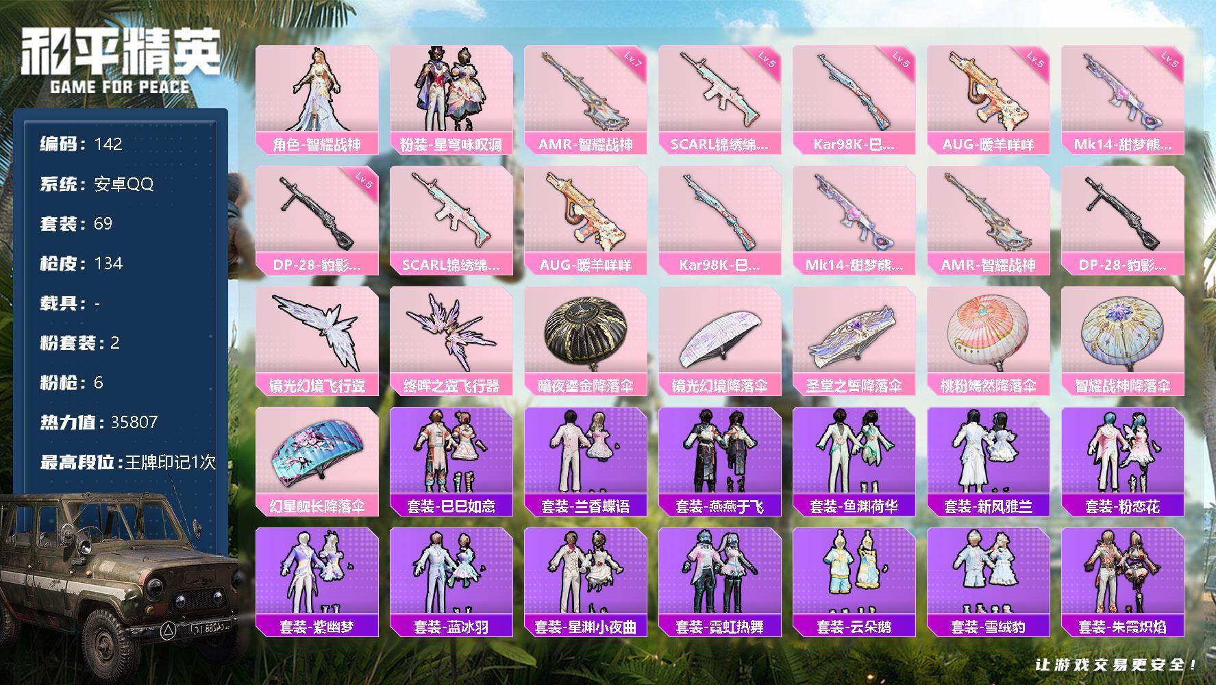 [12324460]【商品标题】:安卓 手Q-2粉装-6特效枪-0载具-2粉色飞行器-35807热力值-1王牌印记-69套装-134枪皮 【粉色套装】:角色-智耀战神,粉装-星穹咏叹调 【粉色枪皮等级】:SCAR-L-锦绣绵绵(五级),AUG-暖羊咩咩(五级),Kar98K-巳巳如意(五级),Mk14-甜梦熊击(五级),AMR-智耀战神(七级),DP-28-豹影疾电(五级) 【粉色枪皮】:SCAR-L-锦绣绵绵,AUG-暖羊咩咩,Kar98K-巳巳如意,Mk14-甜梦熊击,AMR-智耀战神,DP-28-豹影疾电 【粉色飞行器】:镜光幻境飞行翼,终晖之翼飞行器 【粉色降落伞】:暗夜鎏金降落伞,镜光幻境降落伞,圣堂之誓降落伞,桃粉嫣然降落伞,智耀战神降落伞,幻星舰长降落伞 【稀有套装】:套装-巳巳如意,套装-兰香蝶语,套装-燕燕于飞,套装-鱼渊荷华,套装-新风雅兰,套装-粉恋花,套装-紫幽梦,套装-蓝冰羽,套装-星渊小夜曲,套装-霓虹热舞,套装-云朵鹅,套装-雪绒豹,套装-朱霞炽焰,套装-凌霄紫焰,套装-擎苍青焰,玩偶服-美羊羊,角色-敖闰,角色-绯色魅影 【稀有枪皮】:AKM-彩虹符号,AKM-破晓战魂,AKM-霓虹街区,M16A4-最终圣卫者,SCAR-L-炫彩节奏,SCAR-L-玉兔迎春,SCAR-L-红色方程式,SCAR-L-冷漠罗丽,M416-红色方程式,M416-蓝色火焰,M416-萌萌史莱姆,GROZA-田园牧歌,AUG-耀粉歌者,QBZ-彩虹符号,M762-天降萌叽,M762-彩虹符号,M762-云朵鹅,G36C-星穹咏叹调,AC-VAL-天降萌叽,AC-VAL-快闪甜心,蜜獾-天降萌叽,ARX-凌霄紫焰,UZI-啾咪啾咪,UZI-天降萌叽,UMP45-蓝色火焰,Vector-焰鹰斗篷,Vector-生命誓言,Vector-田园牧歌,汤姆逊-耀粉歌者,汤姆逊-幻星舰长,JS9-凌霄紫焰,P90-快闪甜心,P90-巳巳如意,Kar98K-彩虹符号,Kar98K-红色方程式,Kar98K-星穹咏叹调,M24-幻彩电音,AWM-焰鹰斗篷,VSS-田园牧歌,Mini14-耀粉歌者,AMR-镜光幻境,MK20-H-快闪甜心,MK20-H-圣域龙灵,SVD-云朵鹅,S686-彩虹符号,S686-生命誓言,S686-巳巳如意,S12K-玩趣呆呆,S12K-破晓战魂,S12K-智耀战神,