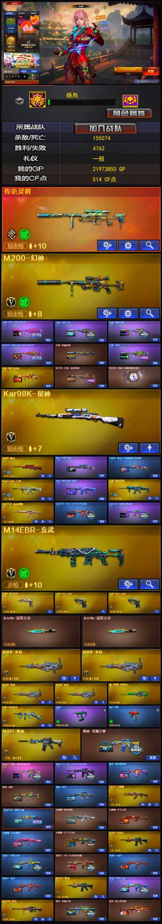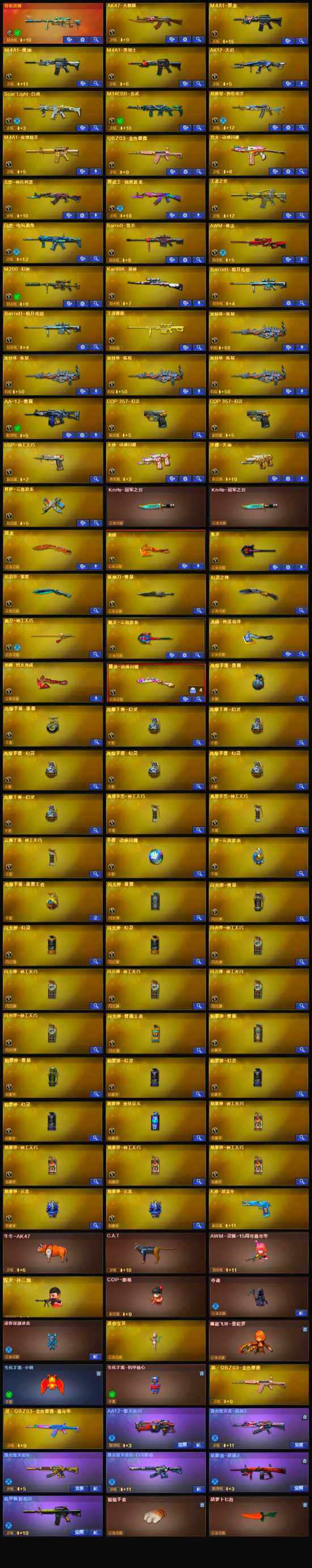 【其他武器】:USP-神工天巧,唐刀-神工天巧,烟雾弹-竞技荣光,COP 357-幻灵*2,幻灵之锋,斩神刀-雷暴,烈火-动感闪耀,天神-动感闪耀,屠龙-动感闪耀,手雷-动感闪耀,无影-神兵利器,M4A1-雷神,M4A1-黑龙,M4A1-玫瑰精灵,M4A1-黑骑士,加特林-炼狱*4,AK47-火麒麟,AK12-天启,Barrett-毁灭,沙鹰-天神,擎天,龙啸,屠龙,AWM-裁决,AA-12-雷霆,Kar98K-星神