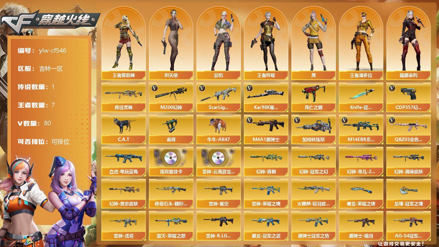 [12326457]【商品标题】:吉林一区-80V-7王者-0炫金 【热门武器】:传说灵眸,QBZ03-金色蔷薇,M14EBR-玄武,Scar Light-白虎,M200-幻神,死亡之眼,白虎-电玩蓝兔,Kar98K-星神,C.A.T,毒蜂,牛牛-AK47,M4A1-黑骑士,加特林-炼狱*4,COP 357-幻灵*2,Knife-冠军之刃*2 【音效卡】:炼狱音效卡,云海游龙音效卡 【稀有皮肤】:M200-幻神-黄忠皮肤,幻神-周瑜皮肤,幻神-冠军之幻,幻神-青鹤,幻神-宠儿-2021MVP,幻神-巅峰荣耀,M200-幻神-N9-2022MVP,幻神-纸灯龙皮肤,QBZ03-AG-CFPLS19冠军,QBZ03-巅峰荣耀皮肤,雷神-荣耀之魄,雷神-星空,雷神-虎将,雷神-R.LGD-CFPLS18冠军,火麒麟-轻羽皮肤,传奇石头-横秒之巅,火麒麟-平天大圣,火麒麟-心动糖果,黑骑士-暗月*2,黑骑士-冠军之势,黑骑士-AG-S4冠军典藏,黑龙-冠军之武,毁灭-荣耀之怒,毁灭-黑大圣皮肤,M200-庆典-CFS 2021,屠龙-荣耀之锋,龙啸-冠军之啸,龙啸-纸灯龙皮肤 【角色】:王者-葵-貂蝉,王者玲珑,王者潘多拉,鹰,幽,影豹,司雨,炽天使,机械姬,女主播,铁骑荣耀,暗黑审判,青霞仙子,甜心偶像 【人偶武器】:C.A.T,牛牛-AK47,迷你深渊冰龙,迷你超能女侍,AWM-灵狐-15周年嘉年华,COP-旗袍,迷你巨石泰坦-魔花研究所,迷你裂空之翼,迷你牛魔王,迷你波特博士,夺魂,迷你火种,灵狐娃娃手雷,生化手雷-机甲核心,深渊终结者手雷 【暴走生化】:毒蜂,死亡之眼,黑龙吞噬者,超级对讲机 【挑战大师】:机甲撕裂者III,神圣爆裂者-末日III,KAC-圣炎切割者III,惩戒者III,试炼破坏者III,激光毁灭者III,激光毁灭者III-白马银枪,冰龙粉碎者-白马银枪 【其他武器】:USP-神工天巧,唐刀-神工天巧,烟雾弹-竞技荣光,COP 357-幻灵*2,幻灵之锋,斩神刀-雷暴,烈火-动感闪耀,天神-动感闪耀,屠龙-动感闪耀,手雷-动感闪耀,无影-神兵利器,M4A1-雷神,M4A1-黑龙,M4A1-玫瑰精灵,M4A1-黑骑士,加特林-炼狱*4,AK47-火麒麟,AK12-天启,Barrett-毁灭,沙鹰-天神,擎天,龙啸,屠龙,AWM-裁决,AA-12-雷霆,Kar98K-星神