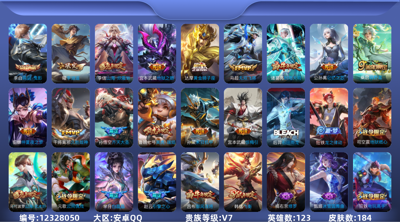 [12328050]【商品标题】:安卓Q-V5-永恒钻石IV段位-123英雄-184皮肤-1典藏-0珍品无双-0无双-0珍品传说-14传说-59史诗