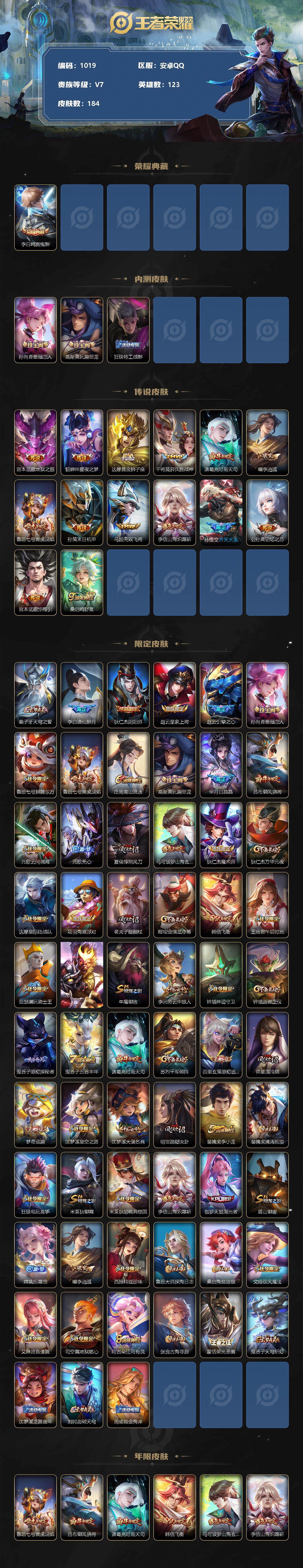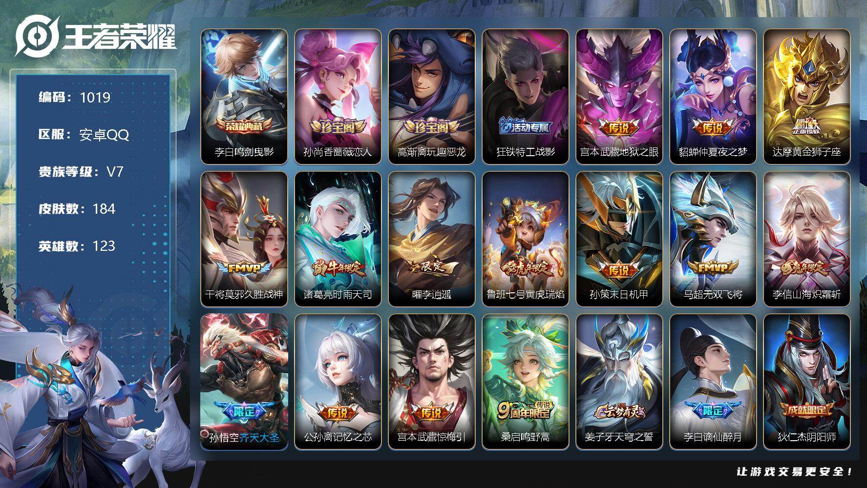 - [12173359]V7 2典藏 9传说 123英雄 202皮肤 可修改实名 优质装备:鸣剑·曳影,银白咏叹调(倪克斯侍卫),云鹰飞将(小将军),炽阳神光,一念神魔,末日机甲-孙策,挚爱之约,无双飞将,诡秘之主,涂山容容 珍宝阁皮:妄想食味,玩趣恶龙 限定皮:愿照·九州拓(澜年限),鸣野蒿,至尊宝,高山流水,圣诞老人,猪悟能,百木心枪 史诗皮:赞萌露比,糖绘人间,化蝶舞,灵蛊蚀心,星界战将,谪仙醉月,龙之律动,藏狐·褐绒,百相守梦-周瑜,茶境仙,撼地雄心,破空之剑,战舞者,百相守梦-黄忠,黄金分割率,千年之狐,永昼,冰冠公主,偶像歌手,暗夜猫娘,猫狗日记-孙策,乱世虎臣,节奏热浪,修罗,功夫厨神,德古拉伯爵,幽灵船长,鬼剑武藏,心灵战警,乘风破浪,水晶猎龙者,曙光守护者,原初追逐者,圣诞狂欢,鹰眼统帅,魅力维加斯,黎明之约,赏金猎手,无心,未来纪元-赵云