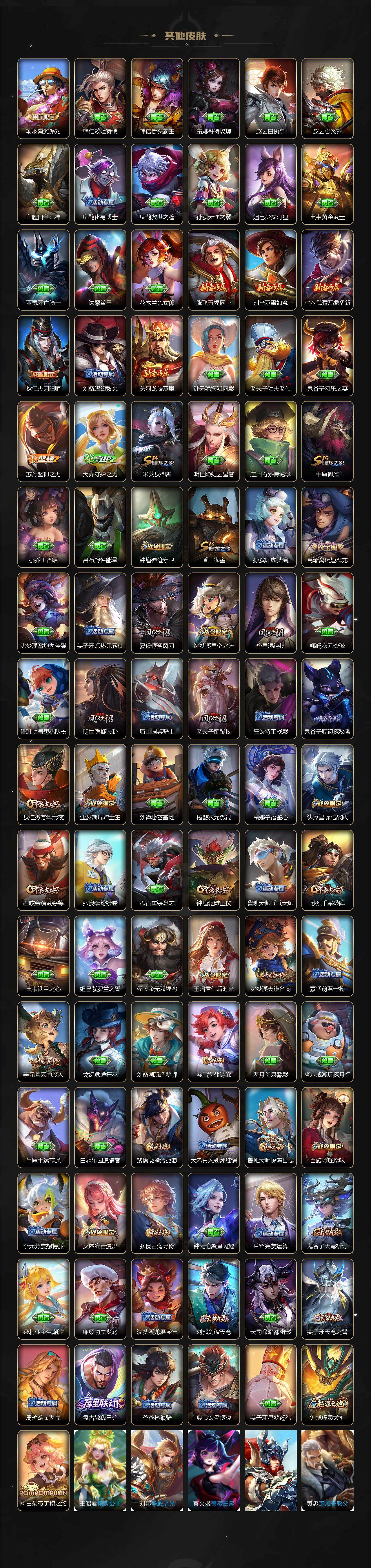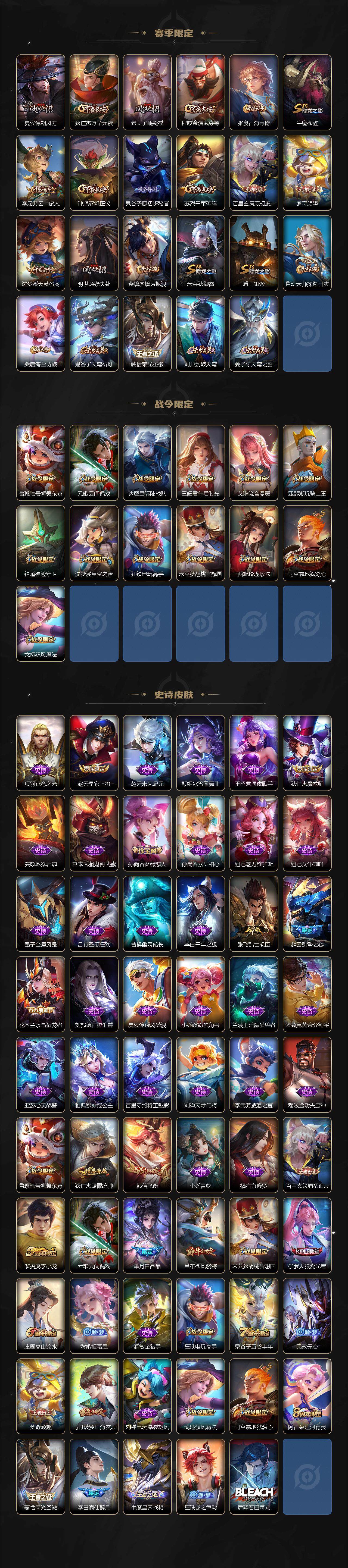 【限定皮肤】:姜子牙天穹之誓,李白谪仙醉月,狄仁杰阴阳师,赵云皇家上将,赵云引擎之心,孙尚香蔷薇恋人,鲁班七号狮舞东方,鲁班七号寅虎瑞焰,庄周高山流水,高渐离玩趣恶龙,芈月白晶晶,吕布御风骁将,元歌云间偶戏,元歌无心,夏侯惇朔风刀,马可波罗山海玄木吟,狄仁杰魔术师,狄仁杰万华元夜,达摩星际陆战队,项羽海滩派对,老夫子醍醐杖,程咬金演武夺筹,韩信飞衡,王昭君午后时光,亚瑟潮玩骑士王,孙悟空齐天大圣,牛魔御旌,李元芳云中旅人,钟馗神迹守卫,钟馗驱傩正仪,鬼谷子原初探秘者,鬼谷子五谷丰年,诸葛亮时雨天司,苏烈千军破阵,百里玄策原初追逐者,弈星混沌棋,梦奇顽趣,沈梦溪星空之诺,沈梦溪大漠名商,明世隐疑决卦,裴擒虎李小龙,裴擒虎擒涛扼浪,狂铁电玩高手,米莱狄御霄,米莱狄胡桃异想国,李信山海炽霜斩,伽罗天狼溯光者,盾山御銮,嫦娥拒霜思,曜李逍遥 ,西施玲珑珍味,鲁班大师探海日志,桑启海盐诗旅,戈娅驭风魔法,艾琳流音漫舞,司空震地狱燃心,阿古朵江河有灵,张良古海寻踪,蒙恬荣光圣徽,鬼谷子天穹祈灯,沈梦溪龙舞盛年,刘邦剑破天穹,周瑜熔金海岸