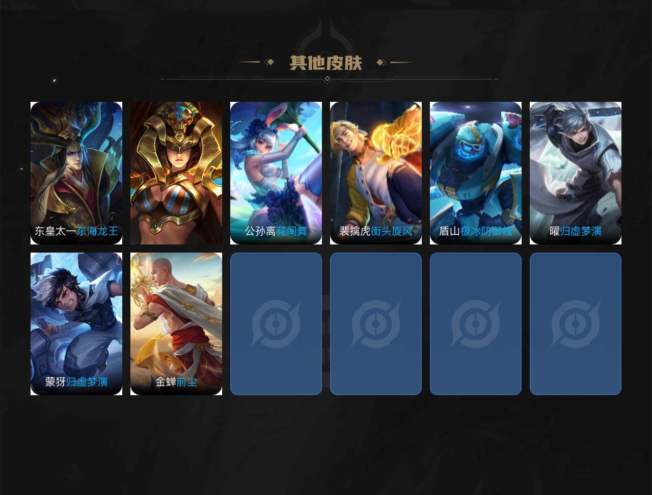 米莱狄御霄,牛魔御旌,盾山御銮,夏侯惇朔风刀,明世隐疑决卦,老夫子醍醐杖,鬼谷子原初探秘者,狄仁杰万华元夜,程咬金演武夺筹,钟馗驱傩正仪,苏烈千军破阵,钟馗神迹守卫,鲁班七号狮舞东方,沈梦溪星空之诺,元歌云间偶戏,弈星混沌棋,沈梦溪大漠名商,李元芳云中旅人,桑启海盐诗旅,裴擒虎擒涛扼浪,鲁班大师探海日志,张良古海寻踪
