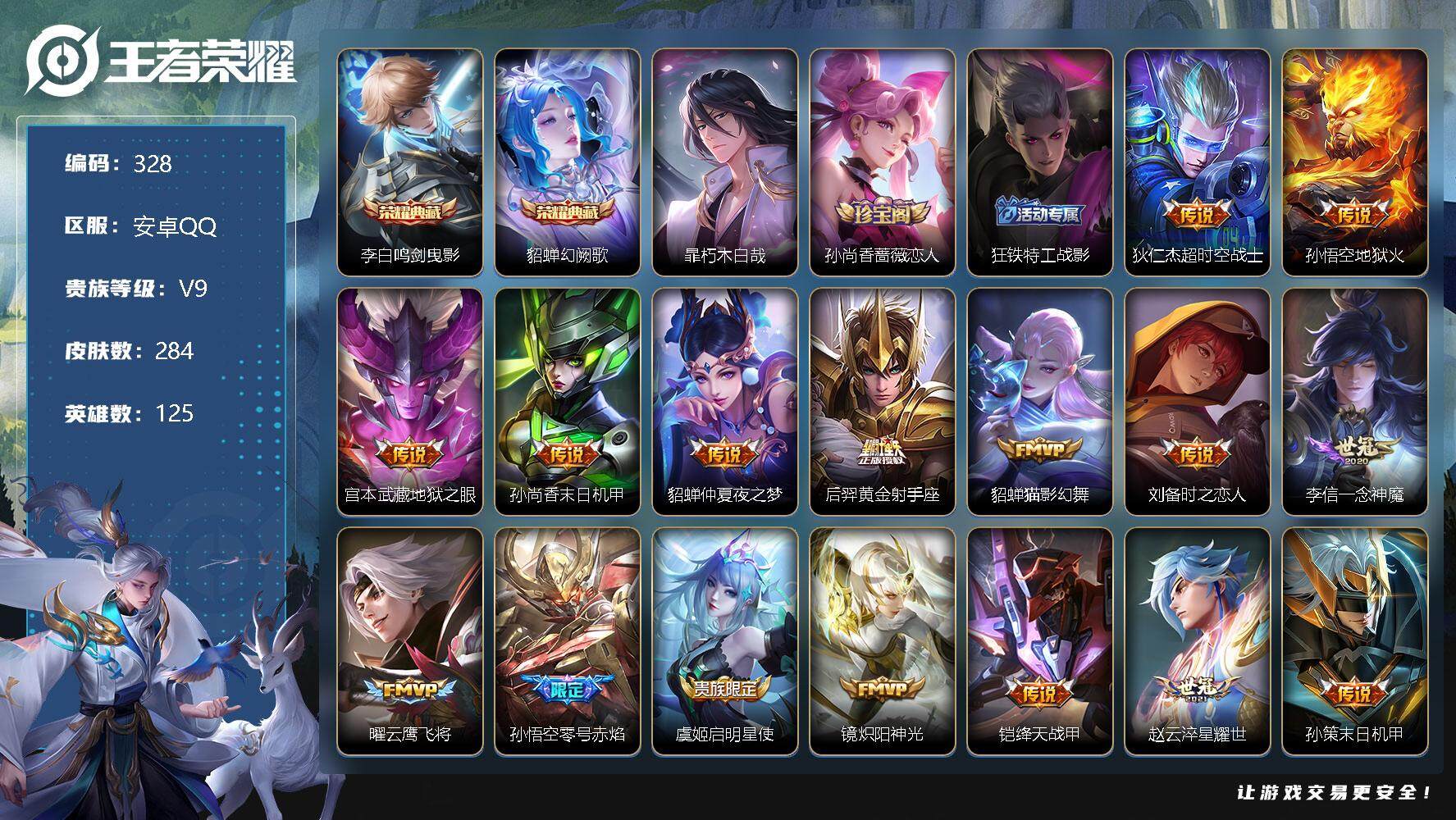 [12328853]【商品标题】:安卓Q-V9-最强王者段位-125英雄-284皮肤-2典藏-0珍品无双-0无双-1珍品传说-30传说-88史诗