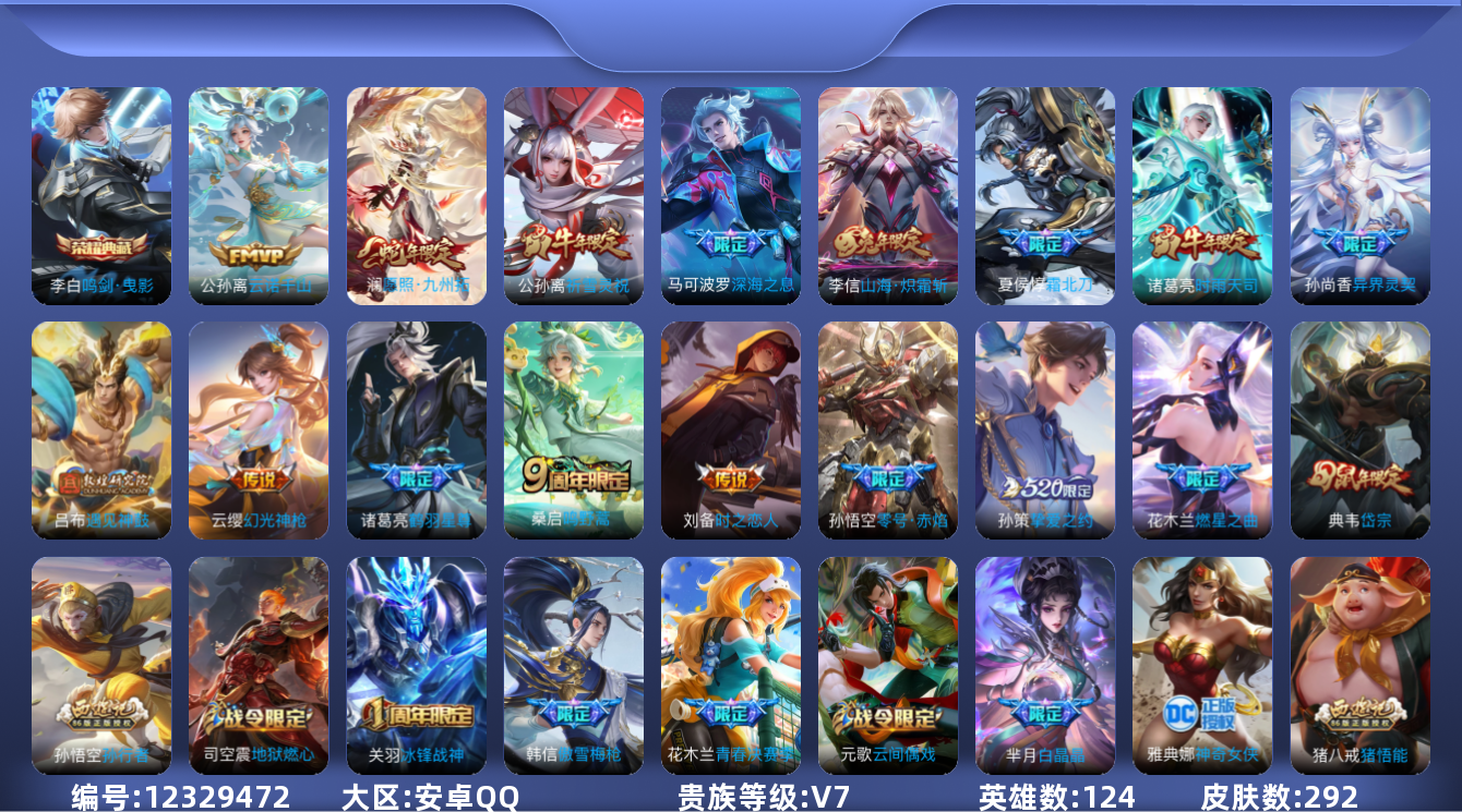 [12329472]【商品标题】:安卓Q-V7-至尊星耀V段位-124英雄-292皮肤-1典藏-0珍品无双-0无双-0珍品传说-16传说-79史诗