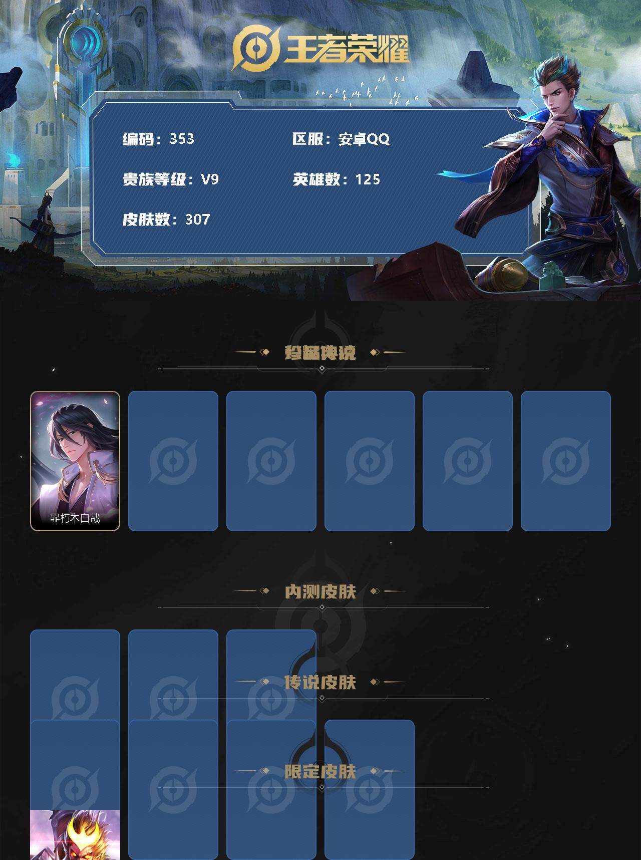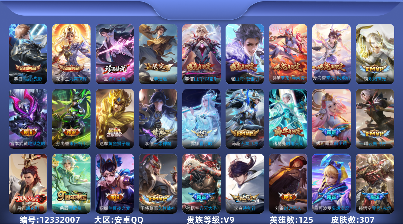 [12332007]【商品标题】:安卓Q-V9-最强王者段位-125英雄-307皮肤-2典藏-0珍品无双-0无双-1珍品传说-32传说-97史诗