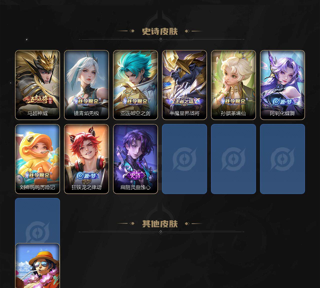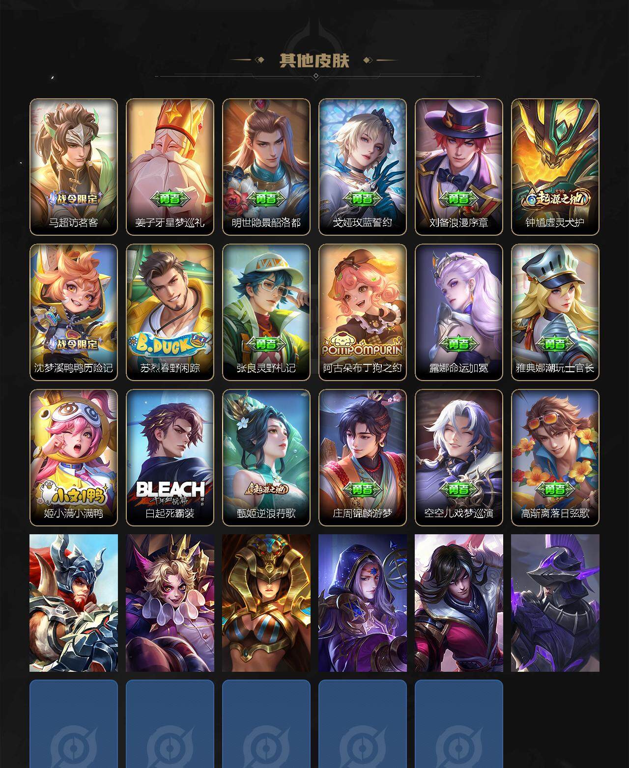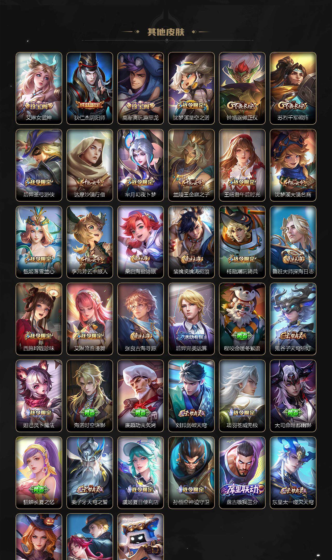 【限定皮肤】:蔡文姬夏日便利店,大乔绒语心约,虞姬夏日便利店,姜子牙天穹之誓,杨戬破阵退雄兵,狄仁杰阴阳师,赵云皇家上将,妲己热情桑巴,庄周高山流水,高渐离玩趣恶龙,钟无艳超时空战士,扁鹊奇幻香踪,芈月幻夜卜梦,元歌无心,甄姬落雪兰心,马可波罗妄想实况,狄仁杰魔术师,达摩沙漠行僧,项羽海滩派对,韩信飞衡,韩信傲雪梅枪,王昭君午后时光,兰陵王金庭之子,娜可露露前尘镜,孙悟空至尊宝,孙悟空零号赤焰,孙悟空孙行者,孙悟空齐天大圣,后羿圣弓游侠,李元芳云中旅人,虞姬启明星使,钟馗驱傩正仪,杨戬潮玩骑兵,干将莫邪真爱魔法,鬼谷子五谷丰年,诸葛亮时雨天司,黄忠火炮绅士,铠青龙志,苏烈千军破阵,百里玄策原初追逐者,百里守约朱雀志,梦奇顽趣,公孙离玉兔公主,沈梦溪星空之诺,沈梦溪大漠名商,裴擒虎李小龙,裴擒虎擒涛扼浪,狂铁电玩高手,云中君纤云弄巧,云中君时之祈愿,李信山海炽霜斩,孙策挚爱之约,上官婉儿梁祝,上官婉儿神器万象笔,嫦娥拒霜思,曜李逍遥 ,曜山海苍雷引,西施玲珑珍味,鲁班大师探海日志,桑启海盐诗旅,戈娅驭风魔法,艾琳女武神,艾琳流音漫舞,司空震地狱燃心,阿古朵江河有灵,张良古海寻踪,蒙犽百解令,蒙恬荣光圣徽,高渐离燃音魔法,妲己灵卜魔法,鬼谷子天穹祈灯,姬小满妄想食味,安琪拉乘龙聚宝船,孙尚香乘龙问璇玑,孙策乘龙淬吴钩,吕布曦玄引,沈梦溪龙舞盛年,鲁班七号蔬乡物语,李元芳蔬乡物语,刘邦剑破天穹,程咬金群星魔术团,镜青焰无极,项羽苍威无极,刘备异域