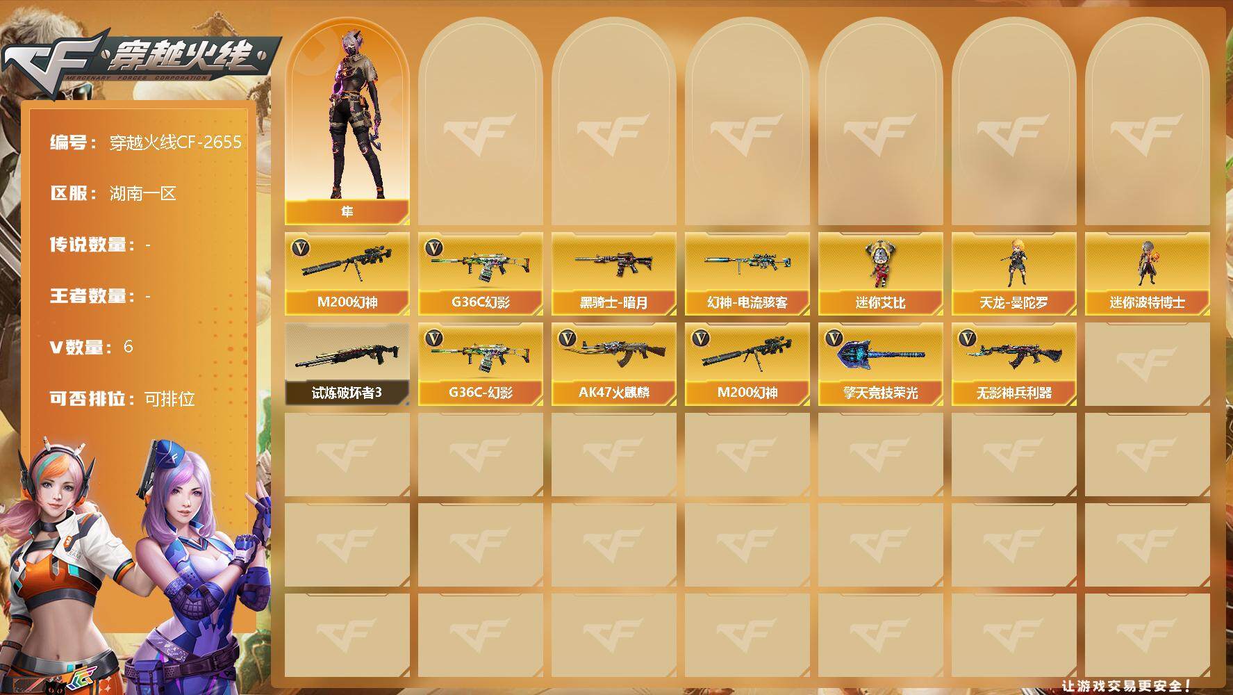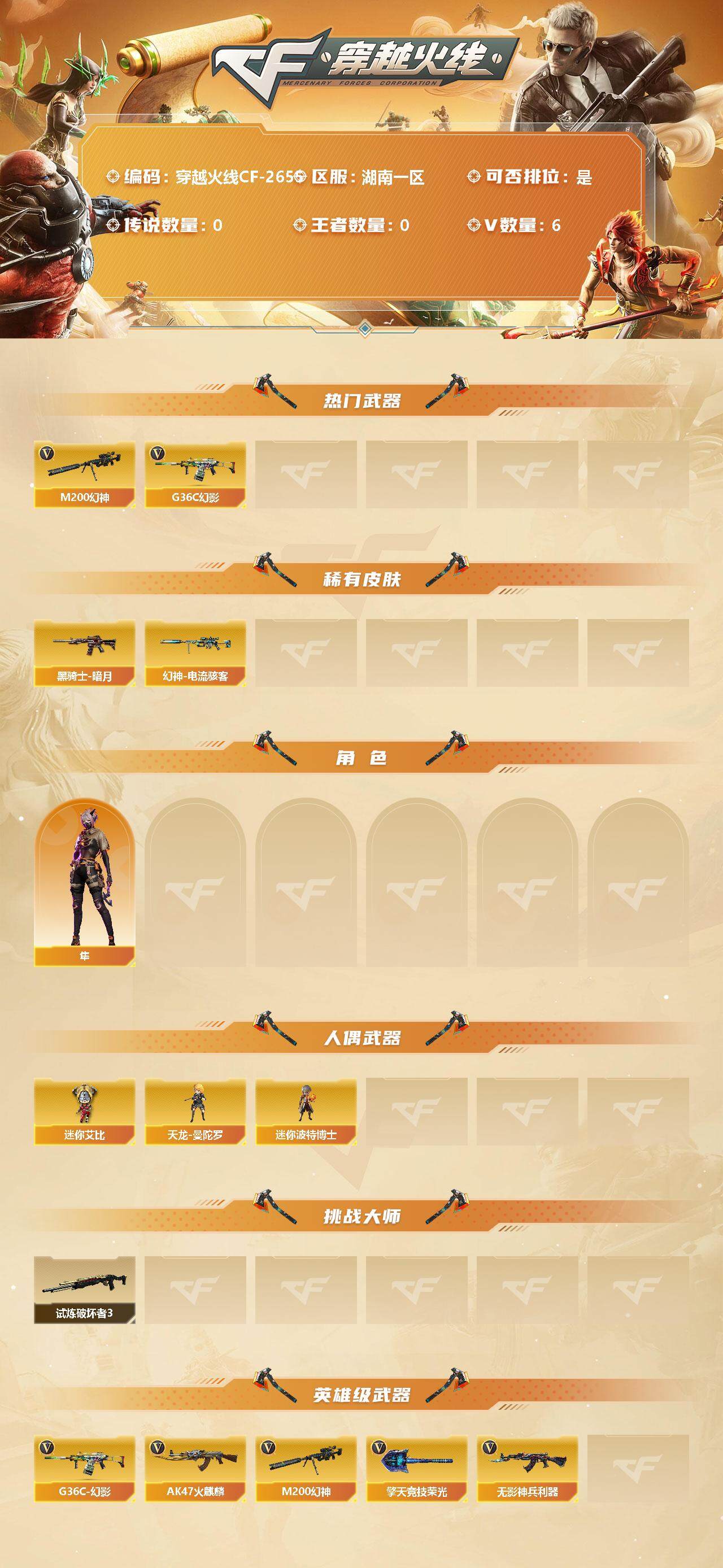 [12335550]【商品标题】:湖南一区-6V-0王者-0炫金 【热门武器】:G36C-幻影,M200-幻神 【稀有皮肤】:幻神-电流骇客 皮肤,黑骑士-暗月 【角色】:隼 【人偶武器】:天龙-曼陀罗,迷你艾比,迷你波特博士*5 【挑战大师】:试炼破坏者III 【英雄级武器】:擎天-竞技荣光,G36C-幻影,无影-神兵利器,AK47-火麒麟,M200-幻神 【特殊枪械】: