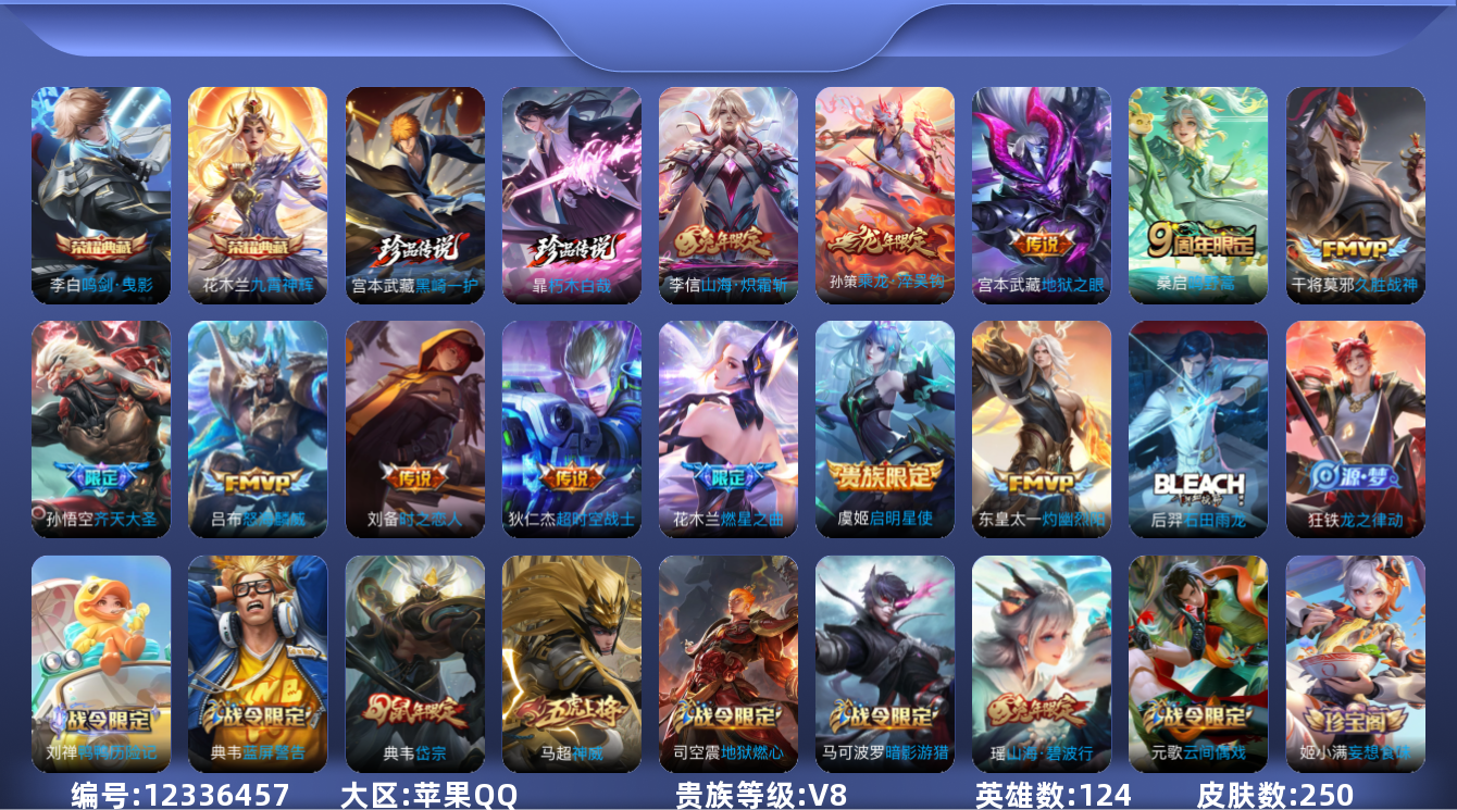 [12336457]【商品标题】:苹果Q-V8-至尊星耀IV段位-124英雄-250皮肤-2典藏-0珍品无双-0无双-2珍品传说-12传说-69史诗