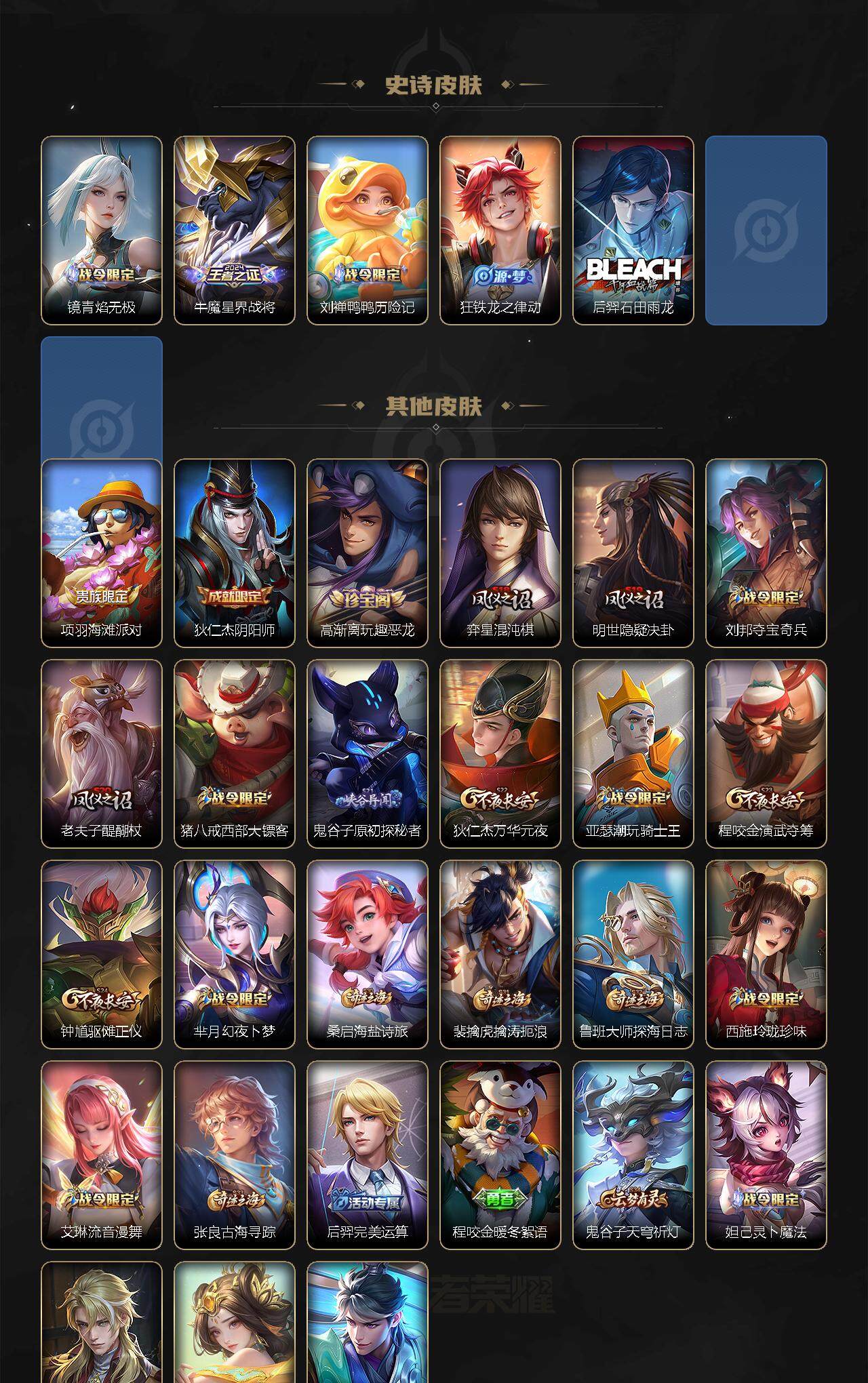 【限定皮肤】:蔡文姬夏日便利店,大乔绒语心约,虞姬夏日便利店,姜子牙天穹之誓,杨戬破阵退雄兵,狄仁杰阴阳师,赵云皇家上将,高渐离玩趣恶龙,阿轲迷踪丽影,芈月幻夜卜梦,元歌云间偶戏,典韦蓝屏警告,典韦岱宗,马可波罗暗影游猎,狄仁杰魔术师,狄仁杰万华元夜,项羽海滩派对,老夫子醍醐杖,程咬金演武夺筹,刘邦夺宝奇兵,花木兰燃星之曲,亚瑟潮玩骑士王,孙悟空齐天大圣,李元芳匿光侦查者,虞姬启明星使,钟馗驱傩正仪,雅典娜黎明之约,蔡文姬繁星吟游,鬼谷子原初探秘者,弈星混沌棋,明世隐疑决卦,裴擒虎李小龙,裴擒虎擒涛扼浪,瑶山海碧波行,云中君纤云弄巧,李信山海炽霜斩,猪八戒西部大镖客,上官婉儿梁祝,嫦娥拒霜思,西施玲珑珍味,蒙犽狂想玩偶喵,鲁班大师探海日志,桑启海盐诗旅,戈娅驭风魔法,艾琳流音漫舞,司空震地狱燃心,阿古朵江河有灵,张良古海寻踪,蒙犽百解令,蒙恬荣光圣徽,高渐离燃音魔法,妲己灵卜魔法,鬼谷子天穹祈灯,伽罗琥珀纪元,姬小满妄想食味,孙策乘龙淬吴钩,沈梦溪龙舞盛年,鲁班七号蔬乡物语,李元芳蔬乡物语,刘邦剑破天穹,程咬金群星魔术团,镜青焰无极,项羽苍威无极,芈月浮光幕影,周瑜熔金海岸