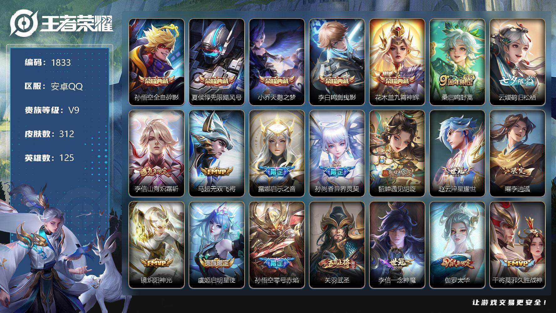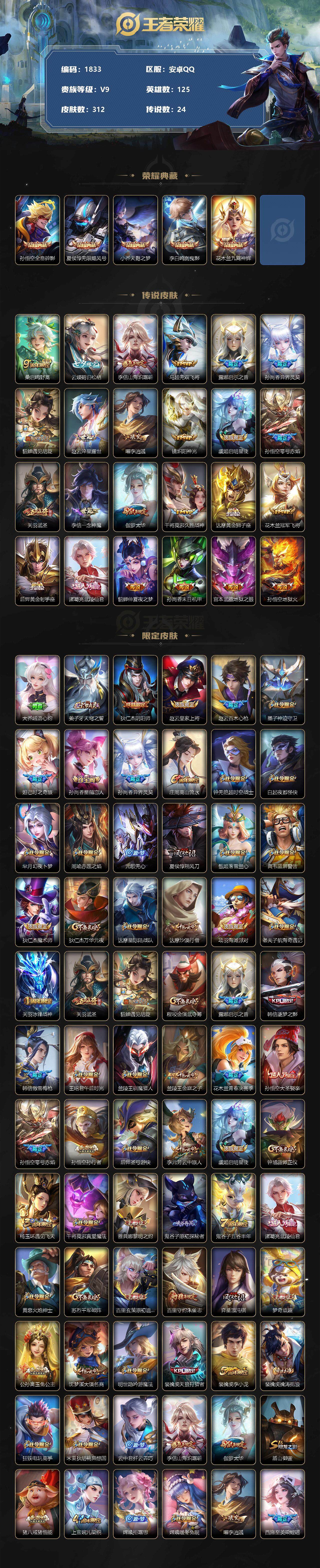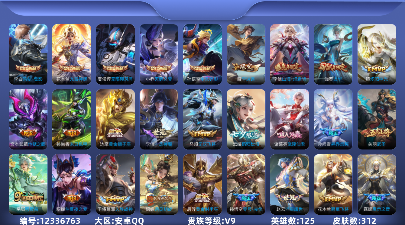 [12336763]【商品标题】:安卓Q-V9-最强王者段位-125英雄-312皮肤-5典藏-0珍品无双-0无双-0珍品传说-24传说-99史诗