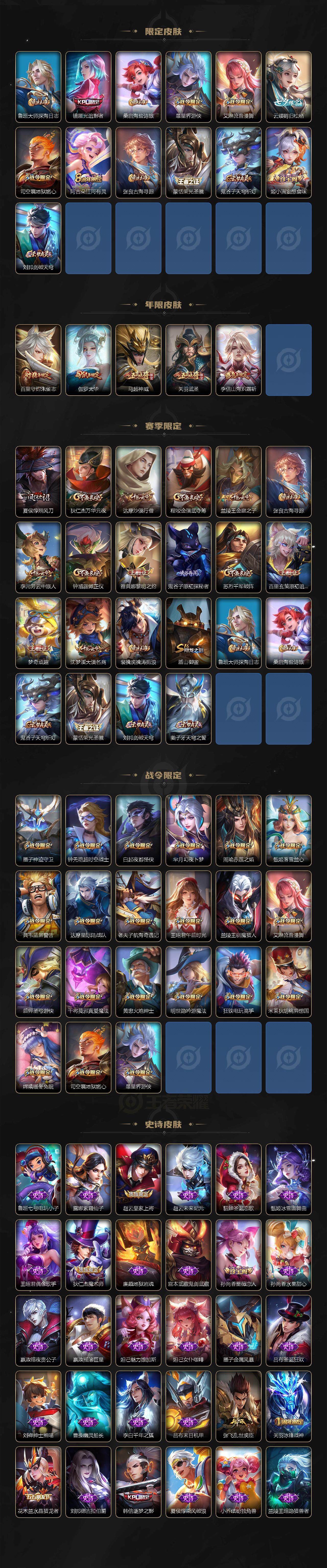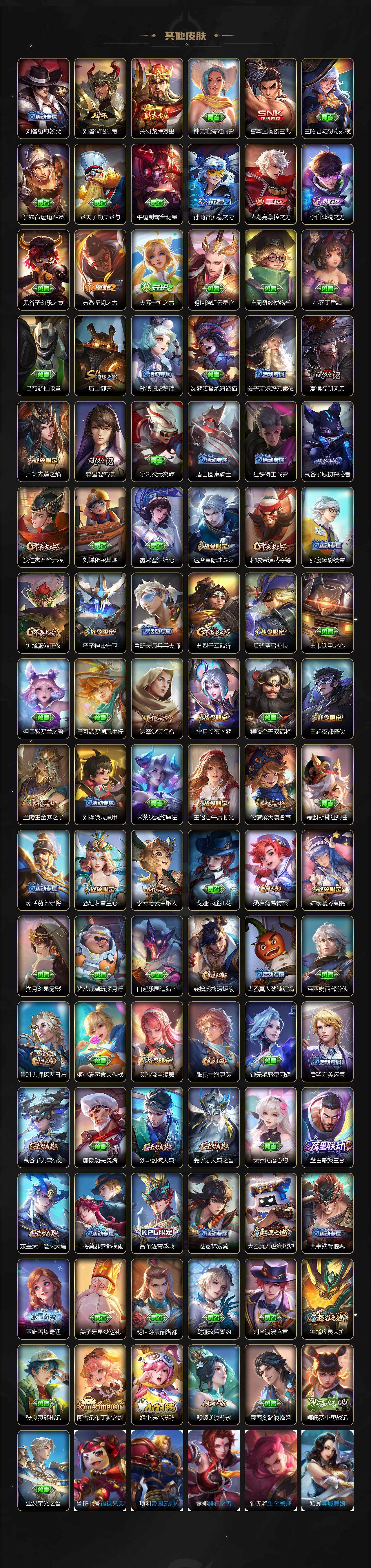 【限定皮肤】:大乔绒语心约,姜子牙天穹之誓,狄仁杰阴阳师,赵云皇家上将,赵云百木心枪,墨子神迹守卫,妲己时之奇旅,孙尚香蔷薇恋人,孙尚香异界灵契,庄周高山流水,钟无艳超时空战士,白起夜都怪侠,芈月幻夜卜梦,周瑜赤莲之焰,元歌无心,夏侯惇朔风刀,甄姬落雪兰心,典韦蓝屏警告,狄仁杰魔术师,狄仁杰万华元夜,达摩星际陆战队,达摩沙漠行僧,项羽海滩派对,老夫子航海奇遇记,关羽冰锋战神,关羽武圣,貂蝉遇见胡旋,程咬金演武夺筹,露娜启示之音,韩信逐梦之影,韩信傲雪梅枪,王昭君午后时光,兰陵王驯魔猎人,兰陵王金庭之子,花木兰青春决赛季,孙悟空大圣娶亲,孙悟空零号赤焰,孙悟空孙行者,后羿圣弓游侠,李元芳云中旅人,虞姬启明星使,钟馗驱傩正仪,杨玉环遇见飞天,干将莫邪真爱魔法,雅典娜黎明之约,鬼谷子原初探秘者,鬼谷子五谷丰年,诸葛亮武陵仙君,黄忠火炮绅士,苏烈千军破阵,百里玄策原初追逐者,百里守约朱雀志,弈星混沌棋,梦奇顽趣,公孙离玉兔公主,沈梦溪大漠名商,明世隐吟游魔法,裴擒虎天狼狩猎者,裴擒虎李小龙,裴擒虎擒涛扼浪,狂铁电玩高手,米莱狄胡桃异想国,云中君纤云弄巧,李信山海炽霜斩,伽罗太华,盾山御銮,猪八戒猪悟能,上官婉儿梁祝,嫦娥拒霜思,嫦娥暖冬兔眠,曜李逍遥 ,西施至美乘鲤谣,鲁班大师探海日志,镜匿光追影者,桑启海盐诗旅,暃星界游侠,艾琳流音漫舞,云缨鹤归松栖,司空震地狱燃心,阿古朵江河有灵,张良古海寻踪,蒙恬荣光圣徽,鬼谷子天穹祈灯,姬小满妄想食味,刘邦剑破天穹