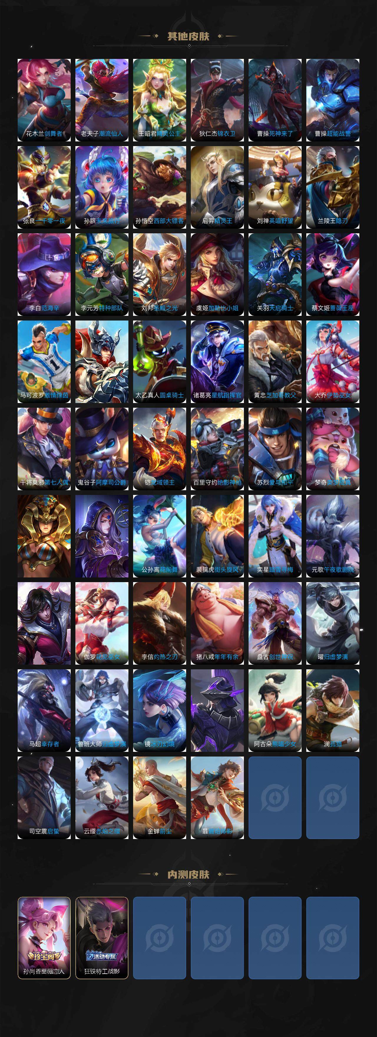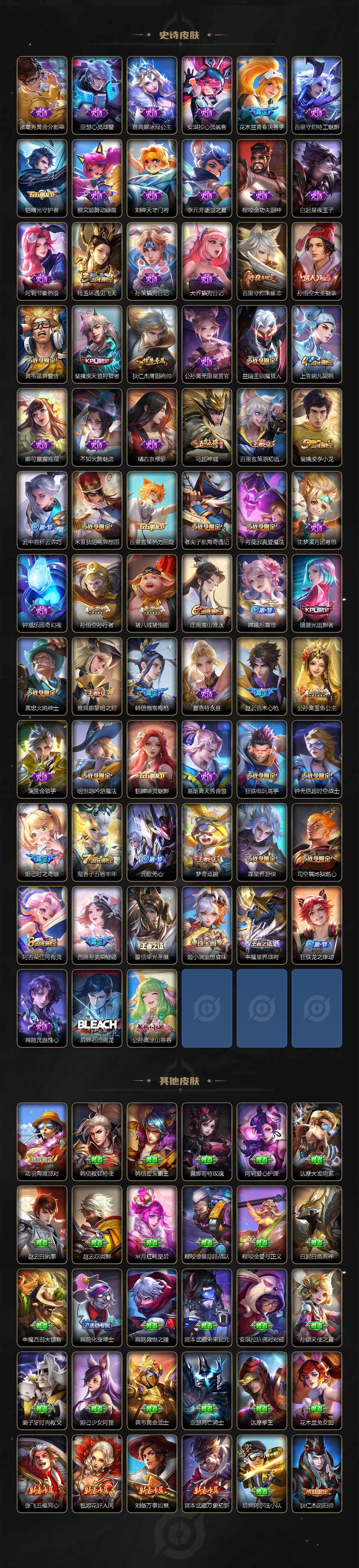 关羽冰锋战神,裴擒虎李小龙,上官婉儿梁祝,关羽武圣,马超神威,伽罗太华,裴擒虎天狼狩猎者,韩信逐梦之影,百里守约朱雀志,孙悟空大圣娶亲,花木兰青春决赛季,猪八戒猪悟能,孙尚香异界灵契,孙悟空孙行者,镜匿光追影者,韩信傲雪梅枪,赵云百木心枪,公孙离玉兔公主,露娜启示之音,妲己时之奇旅,西施至美·乘鲤谣,桑启鸣野蒿