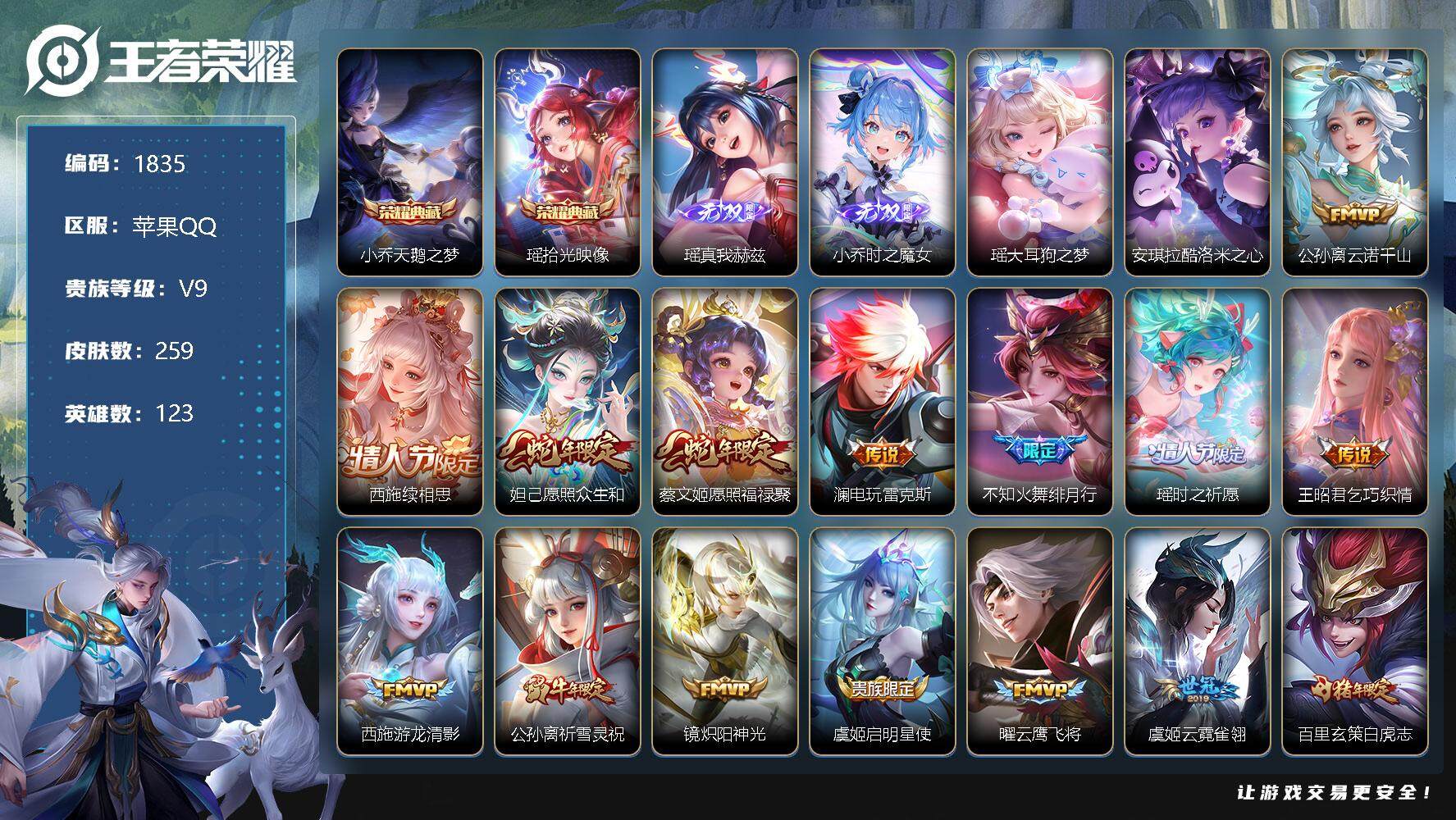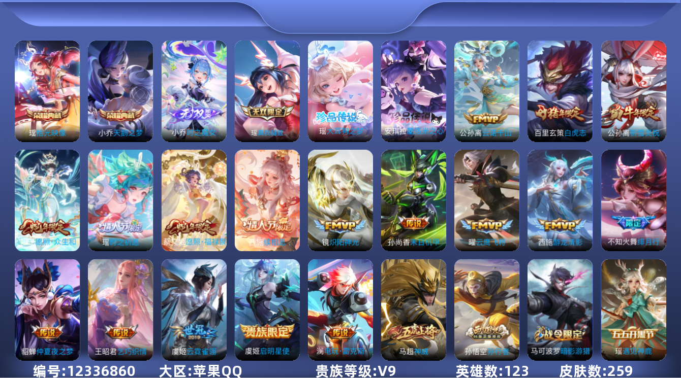 [12336860]【商品标题】:苹果Q-V5-荣耀黄金I段位-123英雄-259皮肤-2典藏-0珍品无双-2无双-2珍品传说-17传说-82史诗