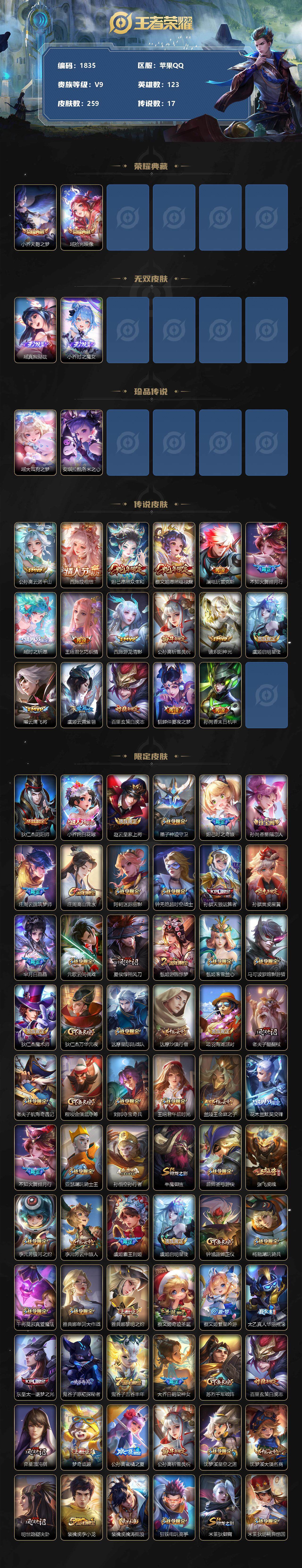 - [11853067]V7 1典藏 1无双 11传说 123英雄 303皮肤 可修改实名 优质装备:弑枪猎影(韩信典藏),碎月剑心(李白无双),黄金狮子座,冠军飞将,末日机甲-孙尚香(绿蚂蚱),时之恋人-刘备(电焊工),末日机甲-孙策,山海·炽霜斩(李信年限),琥珀纪元马超 传说皮:幻光神枪 珍宝阁皮:妄想食味,蔷薇恋人,女武神 限定皮:愿照·九州拓(澜年限),鸣野蒿,至尊宝,太华(伽罗年限),傲雪梅枪,飞衡(韩信年限),遇见飞天,高山流水,五谷丰年,游园惊梦,梁祝,李小龙,逐梦之影,引擎之心,匿光追影者,山海·玄木吟(马可年限) 史诗皮:鸭鸭历险记-刘禅,星界战将,龙之律动,茶境仙,破空之剑,紫霞仙子,黄金分割率,特工魅影,千年之狐,江河有灵,魅语,百解令(蒙犽),高渐离燃音魔法,蒙恬荣光圣徽,冰冠公主,偶像歌手,暗夜猫娘,末日机甲-吕布,猫狗日记-大乔,乱世虎臣,节奏热浪,修罗,女仆咖啡,摇滚巨星,水果甜心,天才门将,星夜王子,心灵骇客,功夫厨神,德古拉伯爵,暗隐猎兽者,幽灵船长,鬼剑武藏,乐园奇幻夜,舞动绿茵,地狱岩魂,纤云弄巧,拒霜思,缤纷独角兽,乘风破浪,逐浪之夏,月团寄思,水晶猎龙者,金属风暴,原初追逐者,圣诞狂欢,圣诞恋歌,鹰眼统帅,暗夜贵公子,黎明之约,无心,未来纪元-赵云