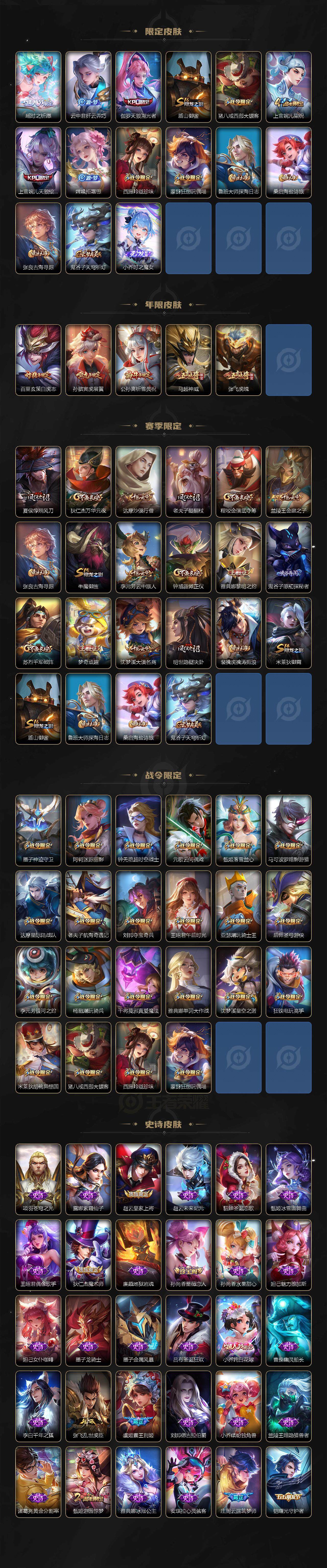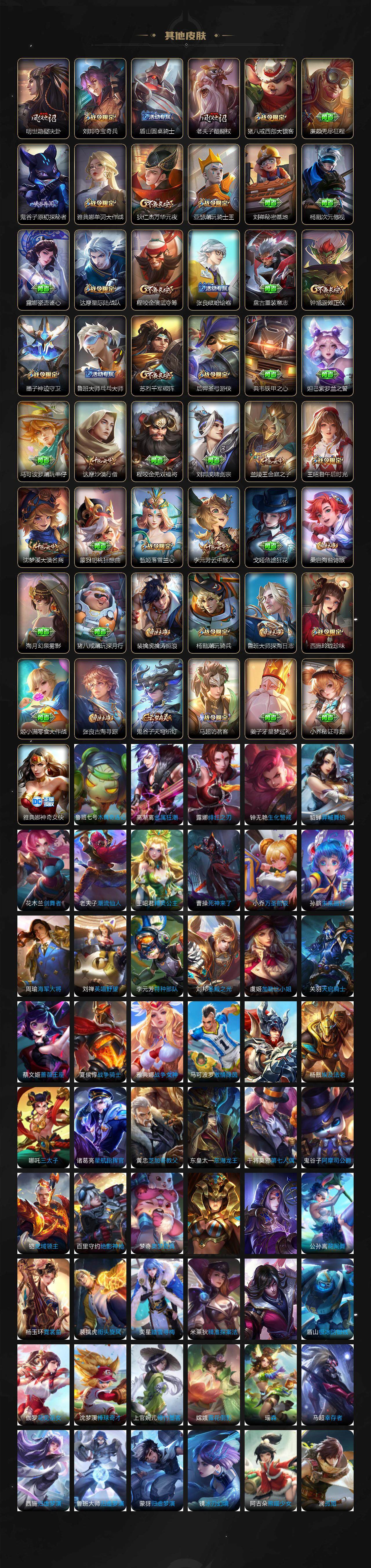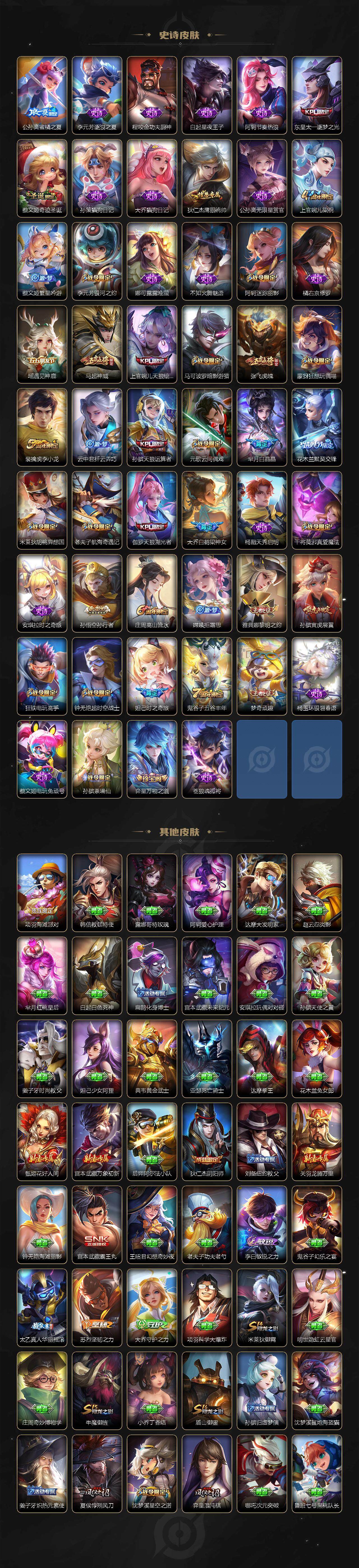 【限定皮肤】:狄仁杰阴阳师,小乔纯白花嫁,赵云皇家上将,墨子神迹守卫,妲己时之奇旅,孙尚香蔷薇恋人,庄周云端筑梦师,庄周高山流水,阿轲迷踪丽影,钟无艳超时空战士,孙膑天狼运算者,孙膑寅虎展翼,芈月白晶晶,元歌云间偶戏,夏侯惇朔风刀,甄姬游园惊梦,甄姬落雪兰心,马可波罗暗影游猎,狄仁杰魔术师,狄仁杰万华元夜,达摩星际陆战队,达摩沙漠行僧,项羽海滩派对,老夫子醍醐杖,老夫子航海奇遇记,程咬金演武夺筹,刘邦夺宝奇兵,王昭君午后时光,兰陵王金庭之子,花木兰默契交锋,不知火舞绯月行,亚瑟潮玩骑士王,孙悟空孙行者,牛魔御旌,后羿圣弓游侠,张飞虎魄,李元芳银河之约,李元芳云中旅人,虞姬霸王别姬,虞姬启明星使,钟馗驱傩正仪,杨戬潮玩骑兵,干将莫邪真爱魔法,雅典娜单词大作战,雅典娜黎明之约,蔡文姬奇迹圣诞,蔡文姬繁星吟游,太乙真人华丽摇滚,东皇太一逐梦之光,鬼谷子原初探秘者,鬼谷子五谷丰年,大乔白鹤梁神女,苏烈千军破阵,百里玄策白虎志,弈星混沌棋,梦奇顽趣,公孙离蜜橘之夏,公孙离祈雪灵祝,沈梦溪星空之诺,沈梦溪大漠名商,明世隐疑决卦,裴擒虎李小龙,裴擒虎擒涛扼浪,狂铁电玩高手,米莱狄御霄,米莱狄胡桃异想国,瑶时之祈愿,云中君纤云弄巧,伽罗天狼溯光者,盾山御銮,猪八戒西部大镖客,上官婉儿梁祝,上官婉儿天狼绘梦者,嫦娥拒霜思,西施玲珑珍味,蒙犽狂想玩偶喵,鲁班大师探海日志,桑启海盐诗旅,张良古海寻踪,鬼谷子天穹祈灯,小乔时之魔女