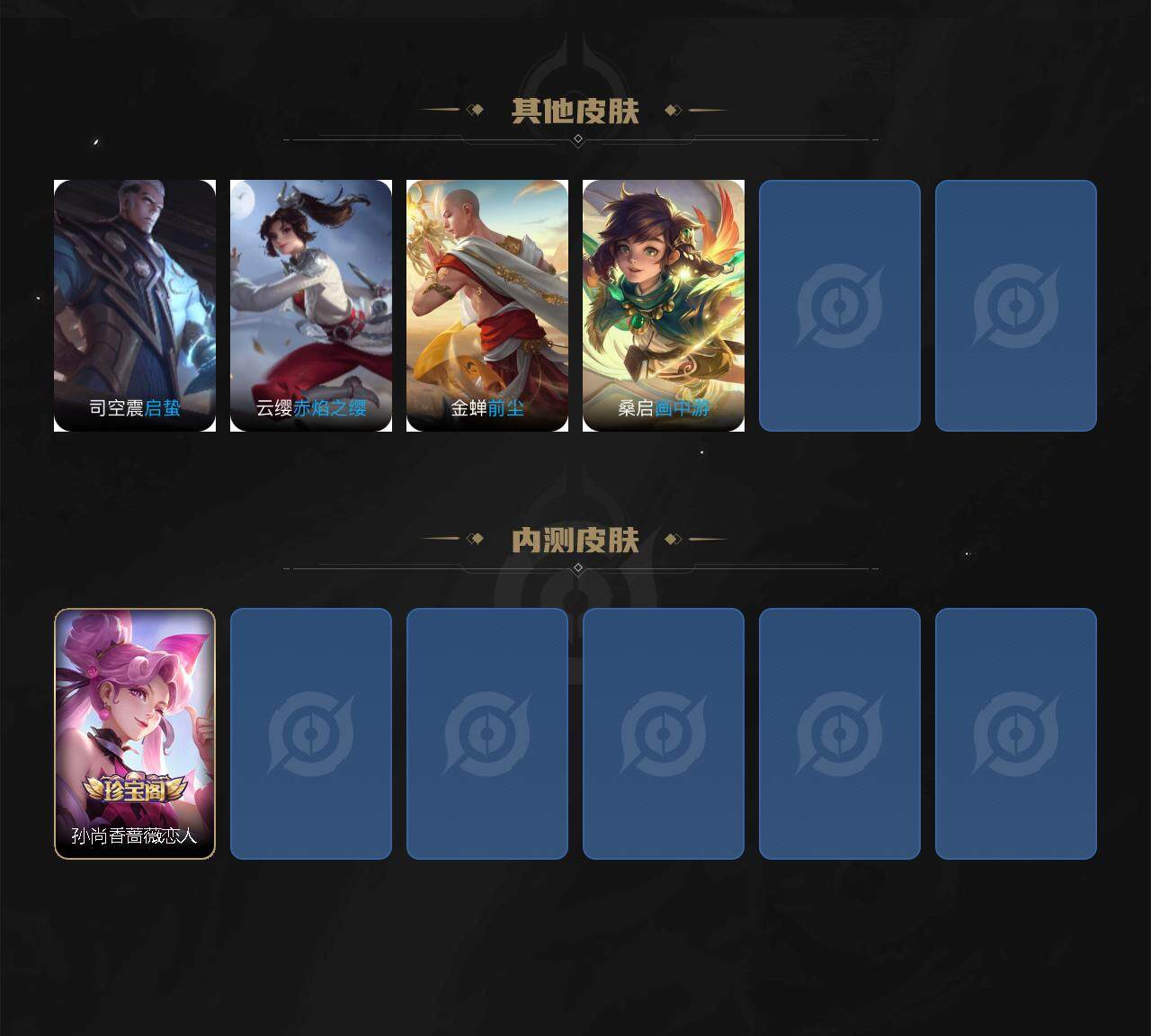 米莱狄御霄,牛魔御旌,盾山御銮,夏侯惇朔风刀,明世隐疑决卦,老夫子醍醐杖,鬼谷子原初探秘者,狄仁杰万华元夜,程咬金演武夺筹,钟馗驱傩正仪,苏烈千军破阵,沈梦溪星空之诺,李元芳银河之约,刘邦夺宝奇兵,马可波罗暗影游猎,蒙犽狂想玩偶喵,元歌云间偶戏,弈星混沌棋,达摩沙漠行僧,兰陵王金庭之子,沈梦溪大漠名商,李元芳云中旅人,桑启海盐诗旅,裴擒虎擒涛扼浪,鲁班大师探海日志,张良古海寻踪