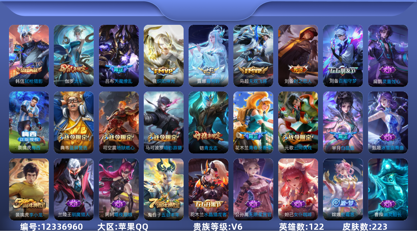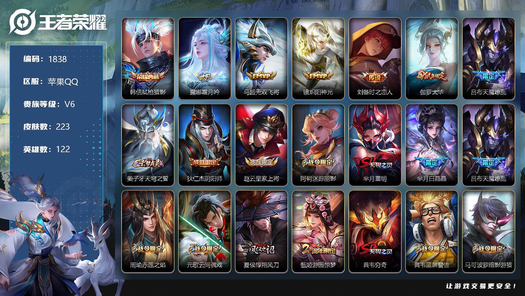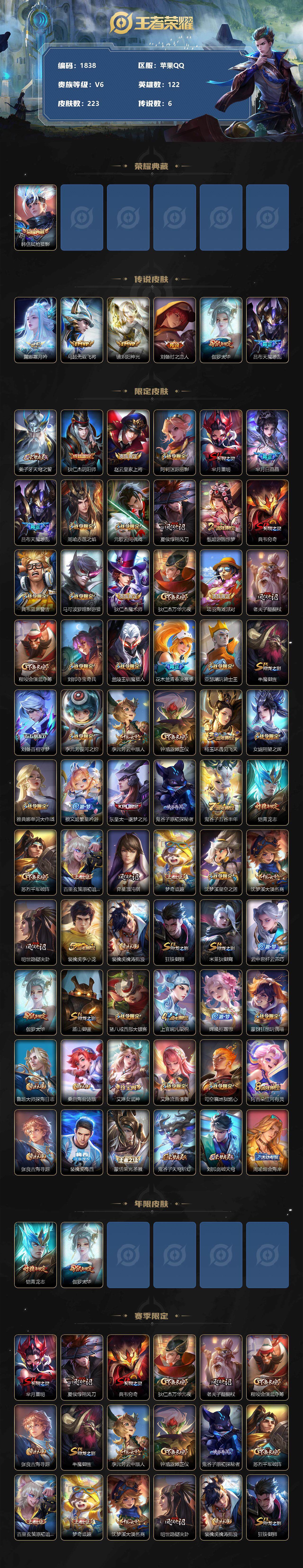 [12336960]【商品标题】:苹果Q-V2-永恒钻石I段位-122英雄-223皮肤-1典藏-0珍品无双-0无双-0珍品传说-6传说-55史诗
