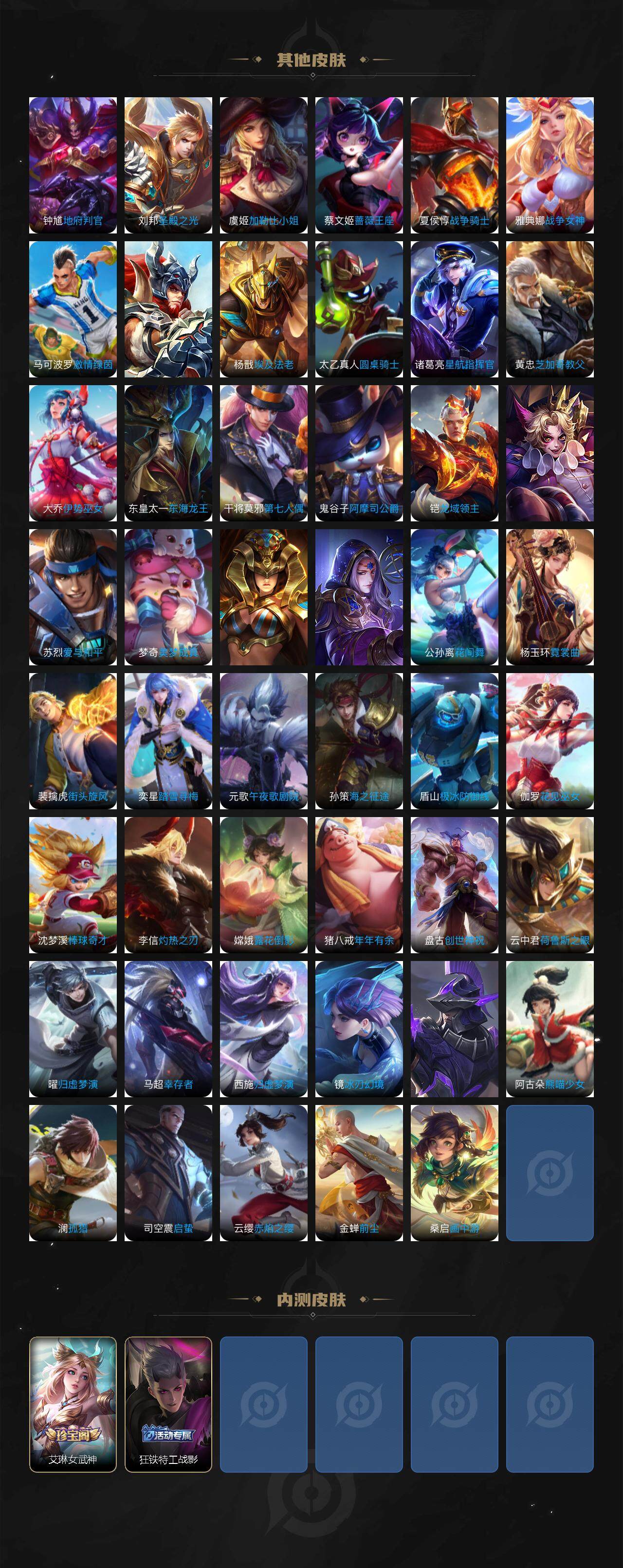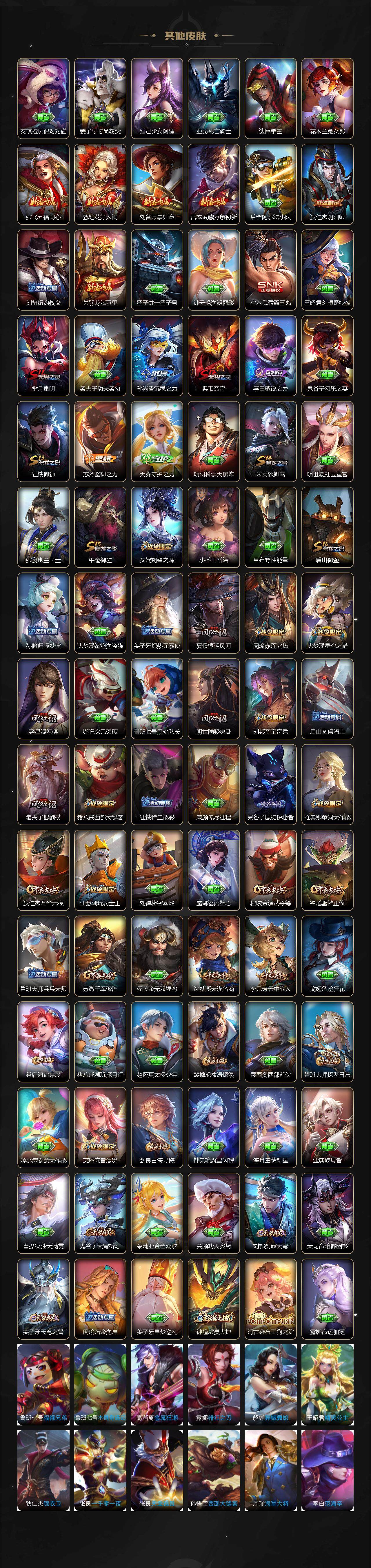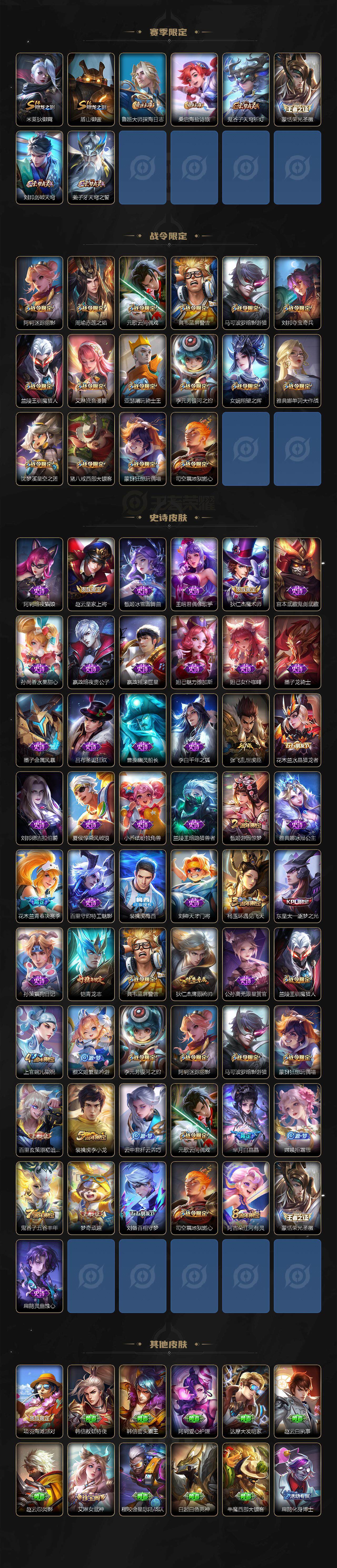 【限定皮肤】:姜子牙天穹之誓,狄仁杰阴阳师,赵云皇家上将,阿轲迷踪丽影,芈月重明,芈月白晶晶,吕布天魔缭乱,周瑜赤莲之焰,元歌云间偶戏,夏侯惇朔风刀,甄姬游园惊梦,典韦穷奇,典韦蓝屏警告,马可波罗暗影游猎,狄仁杰魔术师,狄仁杰万华元夜,项羽海滩派对,老夫子醍醐杖,程咬金演武夺筹,刘邦夺宝奇兵,兰陵王驯魔猎人,花木兰青春决赛季,亚瑟潮玩骑士王,牛魔御旌,刘备百相守梦,李元芳银河之约,李元芳云中旅人,钟馗驱傩正仪,杨玉环遇见飞天,女娲朔望之晖,雅典娜单词大作战,蔡文姬繁星吟游,东皇太一逐梦之光,鬼谷子原初探秘者,鬼谷子五谷丰年,铠青龙志,苏烈千军破阵,百里玄策原初追逐者,弈星混沌棋,梦奇顽趣,沈梦溪星空之诺,沈梦溪大漠名商,明世隐疑决卦,裴擒虎李小龙,裴擒虎擒涛扼浪,狂铁御狮,米莱狄御霄,云中君纤云弄巧,伽罗太华,盾山御銮,猪八戒西部大镖客,上官婉儿梁祝,嫦娥拒霜思,蒙犽狂想玩偶喵,鲁班大师探海日志,桑启海盐诗旅,艾琳女武神,艾琳流音漫舞,司空震地狱燃心,阿古朵江河有灵,张良古海寻踪,裴擒虎梅西,蒙恬荣光圣徽,鬼谷子天穹祈灯,刘邦剑破天穹,周瑜熔金海岸