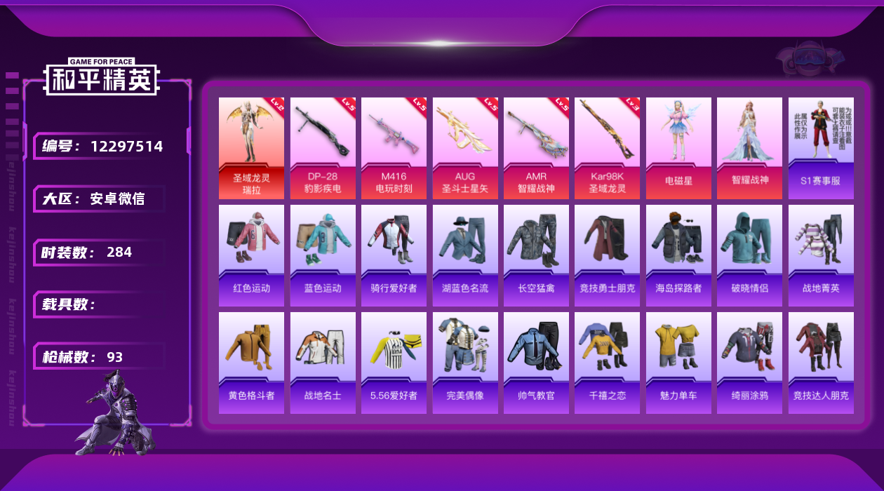 [12297514]1红装 2粉装 5特效枪 5印记 可二次 可修改实名 优质装备:圣域龙灵-瑞拉,二级圣域龙灵-瑞拉(2级瑞拉),M416电玩时刻,Kar98K-圣域龙灵,智耀战神,AMR-智耀战神,AUG-圣斗士星矢 时装数:284 枪械数:93 战备数:0 热门装扮:电磁星,S1赛事上衣 稀有枪皮:DP-28-豹影疾电 五级特效枪:五级DP-28-豹影疾电,五级AMR-智耀战神,五级AUG-圣斗士星矢,五级M416-电玩时刻 三级特效枪:三级Kar98K-圣域龙灵 紫色装扮:SS31特训套装,云朵鹅,雪绒豹,SS33特训套装,顶瓜瓜,北国孤狼,千禧之恋,完美偶像,帅气教官,战地名士,5.56爱好者,S4赛事,SS2特训,SS3特训,瑞龙福将,团圆交子,醒狮腾龙,SS17特训,潮流游乐家,战地菁英,骑行爱好者,魅力单车,黄色格斗者,龟仙人,都市魅力,酷潮明星,长空猛禽,霓虹街区,无面战甲,湖蓝色名流,牛气满满,格斗先锋,海岛探路者,跃动心情,绮丽涂鸦,缤纷果语,红色运动,蓝色运动,破晓情侣,破蛋小黄鸡,碟中谍A款,福星高照,空岛之星,竞技勇士朋克,竞技达人朋克,SS29特训,粉雾星云,SS28特训,听雨铃兰,纯真浪花,异域银装,热情海星,白光莹,童真绒兔,焰鹰斗篷,幻羽潜行,SS27特训,湖雨初晴,SS9特训,耀粉歌者,大橘大利,星影赞美诗,SS32特训服(SS32特训套装),紫幽梦,蓝冰羽 优质战备:龙翔九天飞行器,精灵梦叶罗丽降落伞,巴啦啦小魔仙降落伞,江南烟雨降落伞,星之彼岸降落伞,镜域双华降落伞,镜域双华-灵镜之阶,冷漠罗丽降落伞,智耀战神降落伞,圣域龙灵降落伞,圣域金龙飞行器,飞行器-齐天大圣