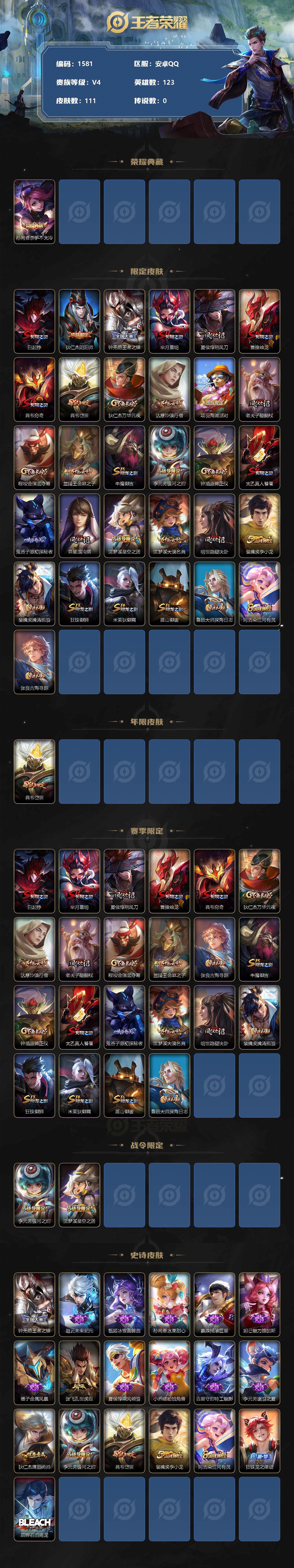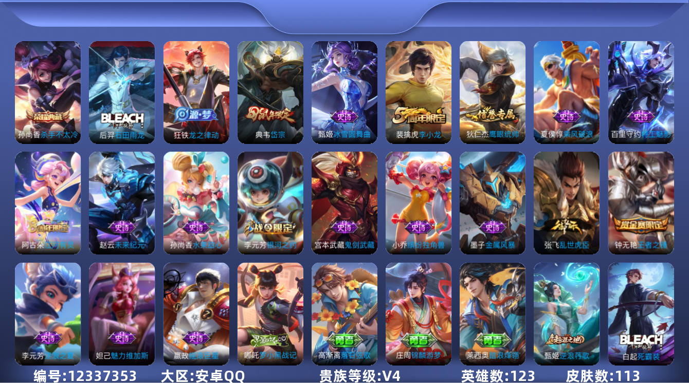 [12337353]【商品标题】:安卓Q-V4-最强王者段位-123英雄-111皮肤-1典藏-0珍品无双-0无双-0珍品传说-0传说-19史诗