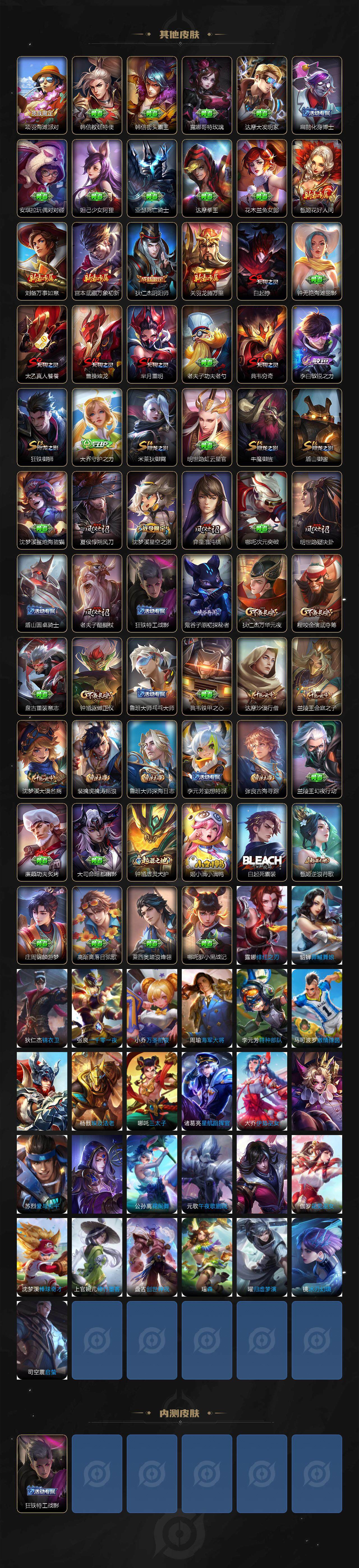 【其他皮肤】:项羽海滩派对,韩信教廷特使,韩信街头霸王,露娜哥特玫瑰,达摩大发明家,扁鹊化身博士,安琪拉玩偶对对碰,妲己少女阿狸,亚瑟死亡骑士,达摩拳王,花木兰兔女郎,甄姬花好人间,刘备万事如意,宫本武藏万象初新,狄仁杰阴阳师,关羽龙腾万里,白起狰,钟无艳海滩丽影,太乙真人饕餮,曹操烛龙,芈月重明,老夫子功夫老勺,典韦穷奇,李白敏锐之力,狂铁御狮,大乔守护之力,米莱狄御霄,明世隐虹云星官,牛魔御旌,盾山御銮,沈梦溪鲨炮海盗猫,夏侯惇朔风刀,沈梦溪星空之诺,弈星混沌棋,哪吒次元突破,明世隐疑决卦,盾山圆桌骑士,老夫子醍醐杖,狂铁特工战影,鬼谷子原初探秘者,狄仁杰万华元夜,程咬金演武夺筹,盘古重装意志,钟馗驱傩正仪,鲁班大师乓乓大师,典韦铁甲之心,达摩沙漠行僧,兰陵王金庭之子,沈梦溪大漠名商,裴擒虎擒涛扼浪,鲁
