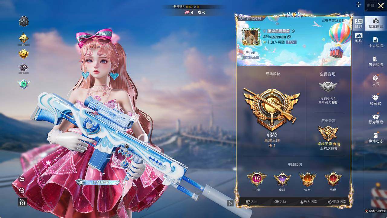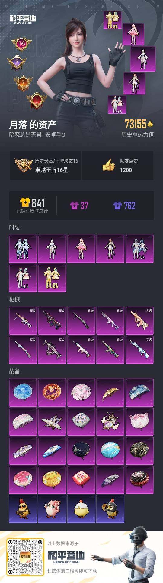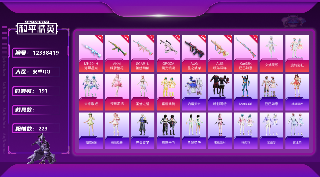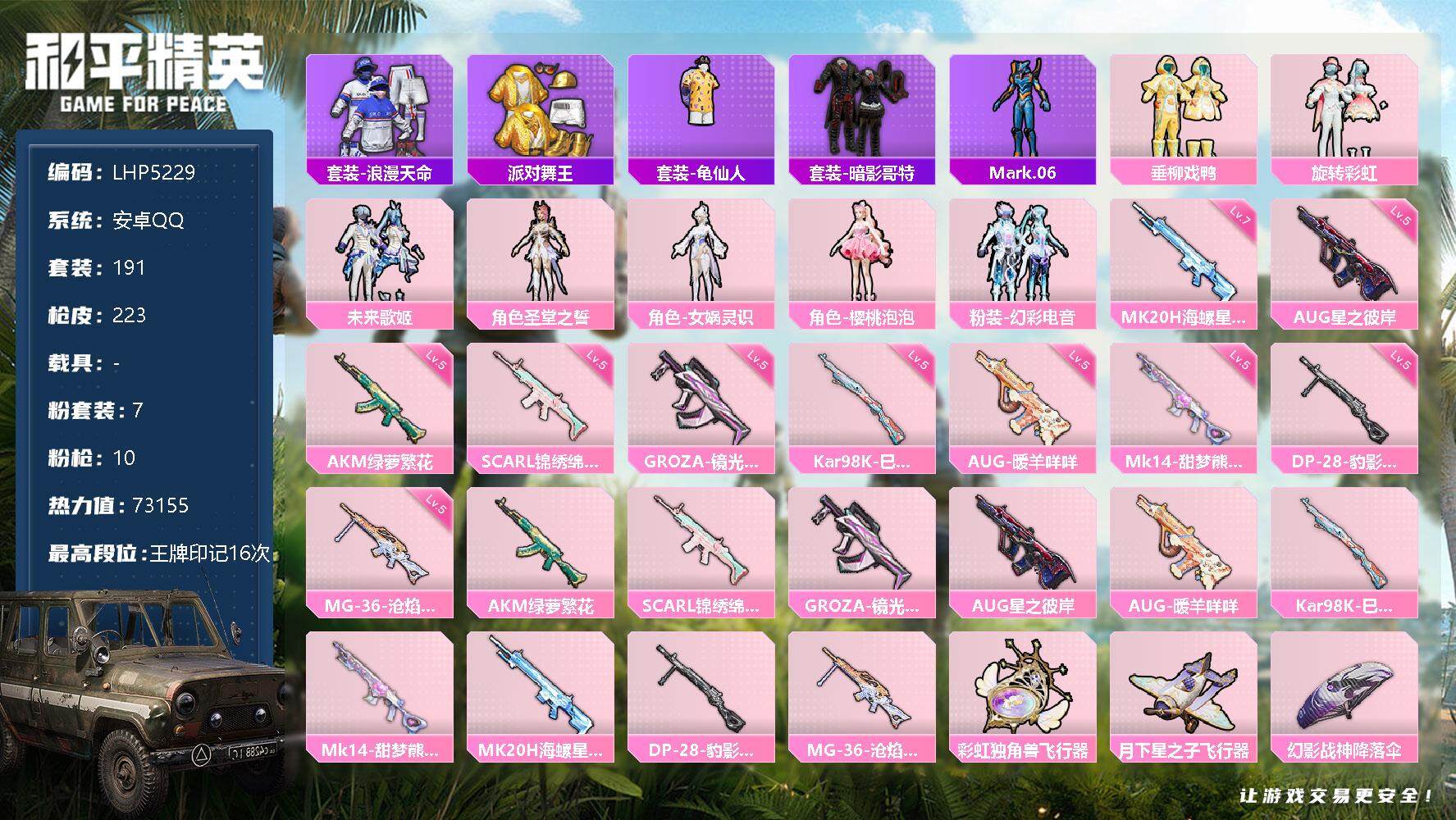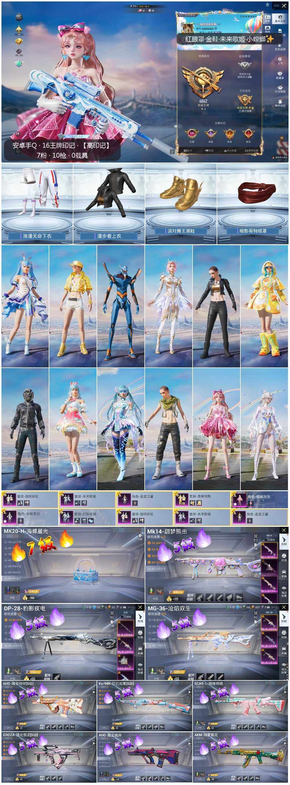 [12338419]素材身法号/地铁满天赋【特价急出/详情看图】:安卓 手Q-7粉装-10特效枪-2粉色飞行器-7.3w热力值-16王牌印记-191套装-223枪皮【热门品类】:套装-浪漫天命,套装-派对舞王,套装-龟仙人,套装-暗影哥特,角色-Mark.06【粉色套装】:粉装-垂柳戏鸭,粉装-旋转彩虹,粉装-未来歌姬,角色-圣堂之誓,角色-女娲灵识,角色-樱桃泡泡,粉装-幻彩电音【粉色枪皮等级】:AKM-绿萝繁花(五级),SCAR-L-锦绣绵绵(五级),GROZA-镜光银凌(五级),AUG-星之彼岸(五级),AUG-暖羊咩咩(五级),Kar98K-巳巳如意(五级),Mk14-甜梦熊击(五级),MK20-H-海螺星光(七级),DP-28-豹影疾电(五级),MG-36-沧焰双生(五级)【粉色飞行器】:彩虹独角兽飞行器,月下星之子飞行器