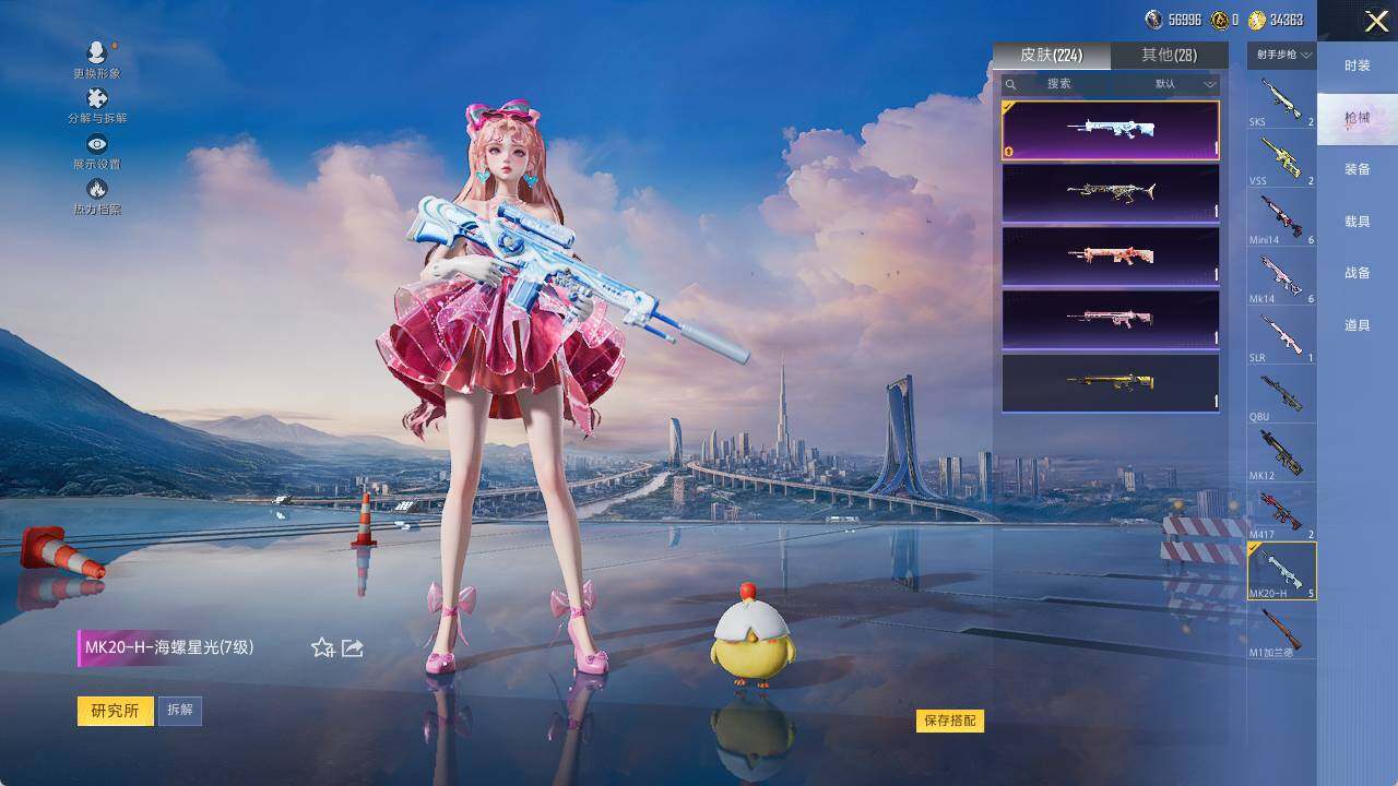 AKM-绿萝繁花,GROZA-镜光银凌,AUG-星之彼岸,AUG-暖羊咩咩,Kar98K-巳巳如意,MK20-H-海螺星光