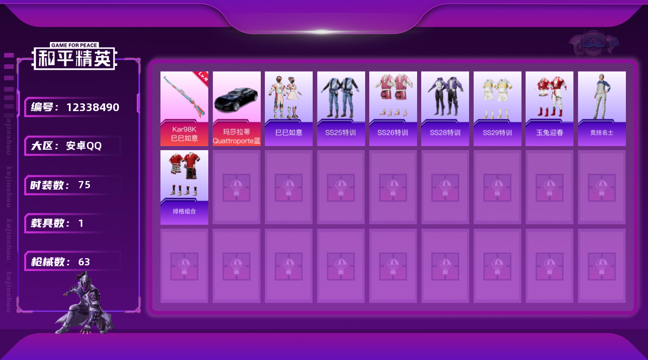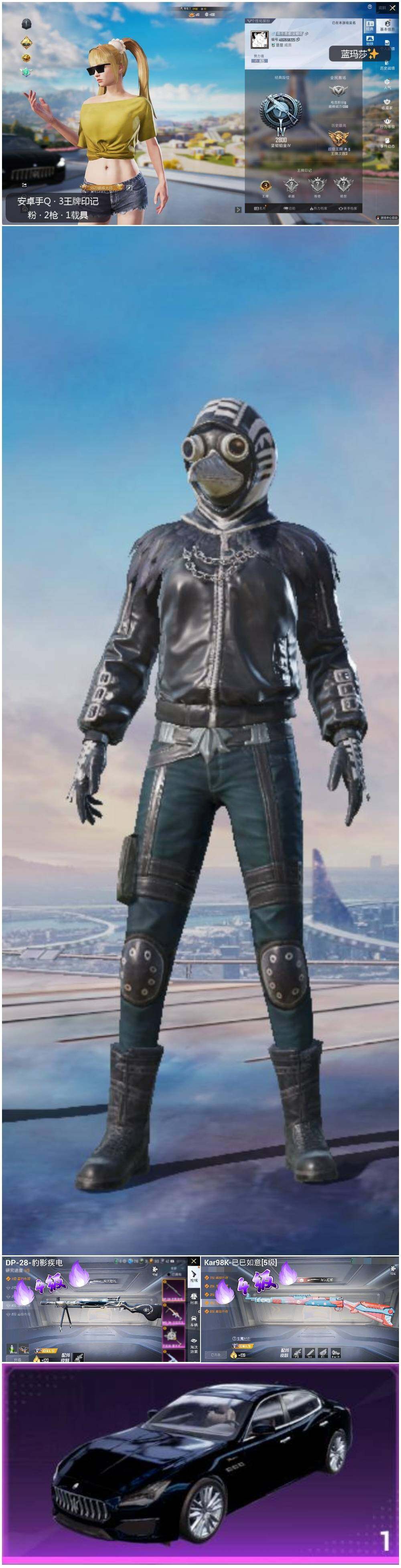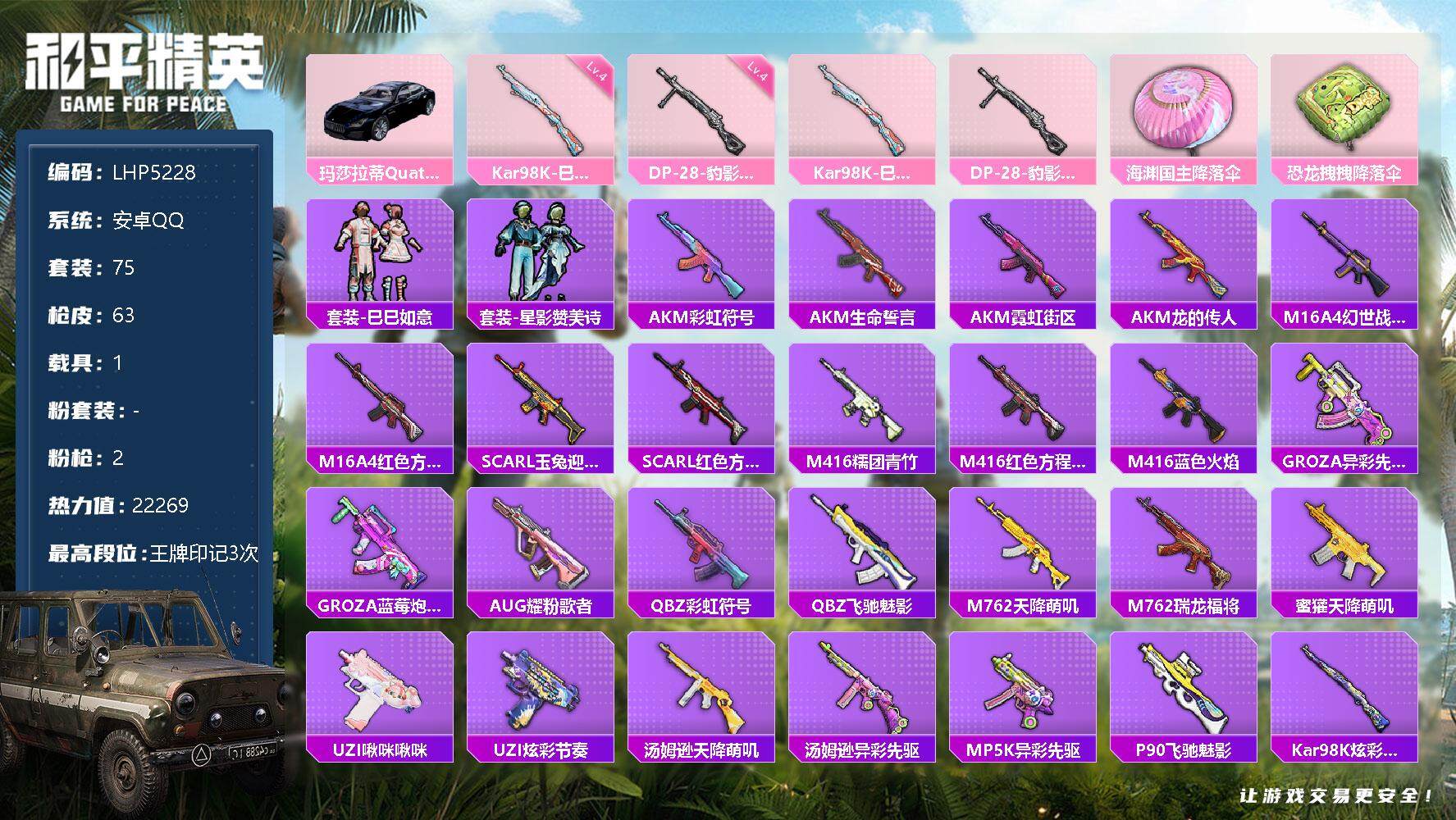 [12338490]【特价急出/详情看图】:安卓 手Q-2特效枪-1载具-2.2w热力值-3王牌印记-75套装-63枪皮【粉色载具】:玛莎拉蒂Quattroporte(夜幕蓝)【粉色枪皮等级】:Kar98K-巳巳如意(四级),DP-28-豹影疾电(四级)