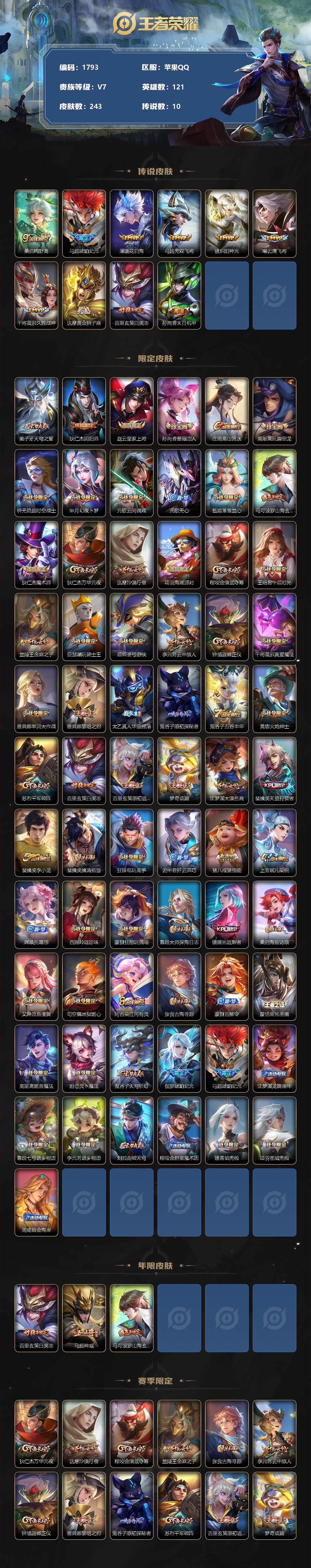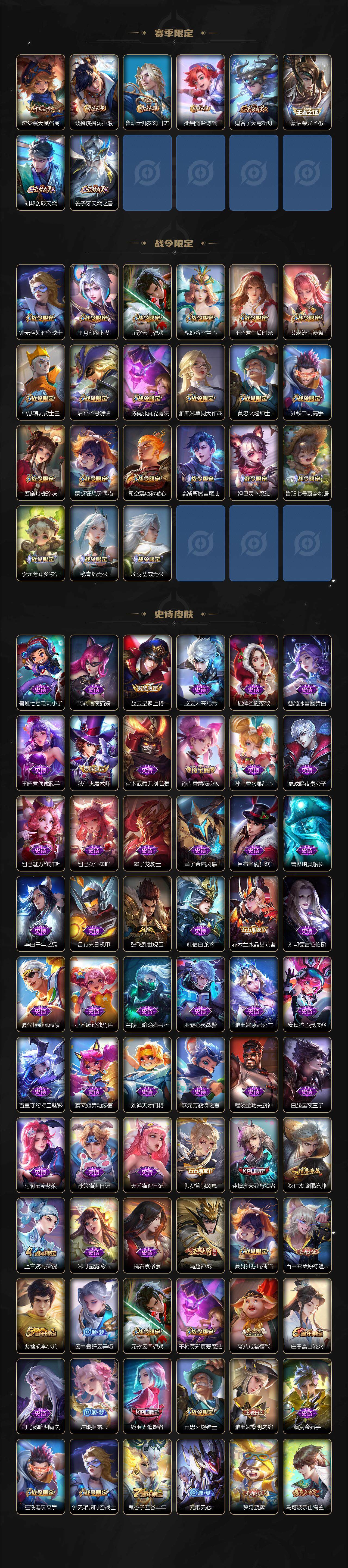 【限定皮肤】:姜子牙天穹之誓,狄仁杰阴阳师,赵云皇家上将,孙尚香蔷薇恋人,庄周高山流水,高渐离玩趣恶龙,钟无艳超时空战士,芈月幻夜卜梦,元歌云间偶戏,元歌无心,甄姬落雪兰心,马可波罗山海玄木吟,狄仁杰魔术师,狄仁杰万华元夜,达摩沙漠行僧,项羽海滩派对,程咬金演武夺筹,王昭君午后时光,兰陵王金庭之子,亚瑟潮玩骑士王,后羿圣弓游侠,李元芳云中旅人,钟馗驱傩正仪,干将莫邪真爱魔法,雅典娜单词大作战,雅典娜黎明之约,太乙真人华丽摇滚,鬼谷子原初探秘者,鬼谷子五谷丰年,黄忠火炮绅士,苏烈千军破阵,百里玄策白虎志,百里玄策原初追逐者,梦奇顽趣,沈梦溪大漠名商,裴擒虎天狼狩猎者,裴擒虎李小龙,裴擒虎擒涛扼浪,狂铁电玩高手,云中君纤云弄巧,猪八戒猪悟能,上官婉儿梁祝,嫦娥拒霜思,西施玲珑珍味,蒙犽狂想玩偶喵,鲁班大师探海日志,镜匿光追影者,桑启海盐诗旅,艾琳流音漫舞,司空震地狱燃心,阿古朵江河有灵,张良古海寻踪,蒙犽百解令,蒙恬荣光圣徽,高渐离燃音魔法,妲己灵卜魔法,鬼谷子天穹祈灯,伽罗琥珀纪元,马超琥珀纪元,沈梦溪龙舞盛年,鲁班七号蔬乡物语,李元芳蔬乡物语,刘邦剑破天穹,程咬金群星魔术团,镜青焰无极,项羽苍威无极,周瑜熔金海岸