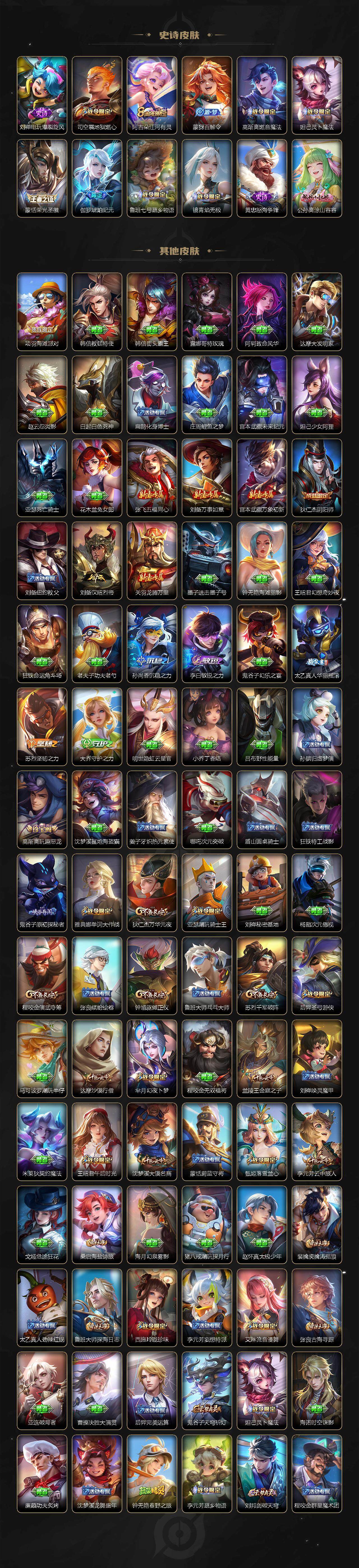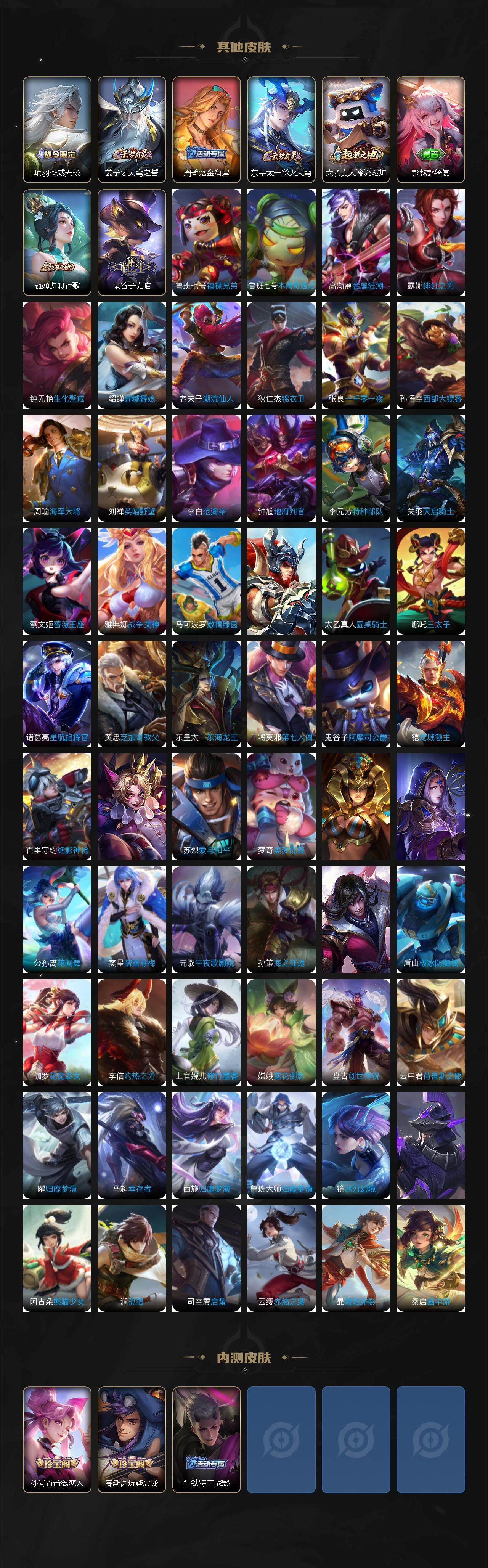 娜可露露晚萤,伽罗箭羽风息,李元芳逐浪之夏,大乔猫狗日记,孙策猫狗日记,阿轲节奏热浪,王昭君偶像歌手,韩信白龙吟,阿轲暗夜猫娘,雅典娜冰冠公主,吕布末日机甲,鲁班七号电玩小子,橘右京修罗,墨子龙骑士,刘禅天才门将,白起星夜王子,安琪拉心灵骇客,程咬金功夫厨神,刘邦德古拉伯爵,兰陵王暗隐猎兽者,曹操幽灵船长,宫本武藏鬼剑武藏,司马懿暗渊魔法,亚瑟心灵战警,蔡文姬舞动绿茵,小乔缤纷独角兽,夏侯惇乘风破浪,花木兰水晶猎龙者,墨子金属风暴,百里玄策原初追逐者,吕布圣诞狂欢,貂蝉圣诞恋歌,百里守约特工魅影,嬴政暗夜贵公子,嫦娥拒霜思,雅典娜黎明之约,李白千年之狐,澜赏金猎手,刘禅电玩·爆裂旋风,蒙犽百解令,高渐离燃音魔法,伽罗琥珀纪元