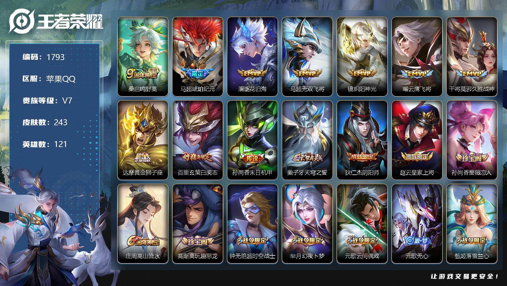 [12338439]【商品标题】:苹果Q-V7-尊贵铂金IV段位-121英雄-243皮肤-0典藏-0珍品无双-0无双-0珍品传说-10传说-77史诗 【传说皮肤】:桑启鸣野蒿,马超琥珀纪元,澜逐花归海,马超无双飞将,镜炽阳神光,曜云鹰飞将,干将莫邪久胜战神,达摩黄金狮子座,百里玄策白虎志,孙尚香末日机甲 【限定皮肤】:姜子牙天穹之誓,狄仁杰阴阳师,赵云皇家上将,孙尚香蔷薇恋人,庄周高山流水,高渐离玩趣恶龙,钟无艳超时空战士,芈月幻夜卜梦,元歌云间偶戏,元歌无心,甄姬落雪兰心,马可波罗山海玄木吟,狄仁杰魔术师,狄仁杰万华元夜,达摩沙漠行僧,项羽海滩派对,程咬金演武夺筹,王昭君午后时光,兰陵王金庭之子,亚瑟潮玩骑士王,后羿圣弓游侠,李元芳云中旅人,钟馗驱傩正仪,干将莫邪真爱魔法,雅典娜单词大作战,雅典娜黎明之约,太乙真人华丽摇滚,鬼谷子原初探秘者,鬼谷子五谷丰年,黄忠火炮绅士,苏烈千军破阵,百里玄策白虎志,百里玄策原初追逐者,梦奇顽趣,沈梦溪大漠名商,裴擒虎天狼狩猎者,裴擒虎李小龙,裴擒虎擒涛扼浪,狂铁电玩高手,云中君纤云弄巧,猪八戒猪悟能,上官婉儿梁祝,嫦娥拒霜思,西施玲珑珍味,蒙犽狂想玩偶喵,鲁班大师探海日志,镜匿光追影者,桑启海盐诗旅,艾琳流音漫舞,司空震地狱燃心,阿古朵江河有灵,张良古海寻踪,蒙犽百解令,蒙恬荣光圣徽,高渐离燃音魔法,妲己灵卜魔法,鬼谷子天穹祈灯,伽罗琥珀纪元,马超琥珀纪元,沈梦溪龙舞盛年,鲁班七号蔬乡物语,李元芳蔬乡物语,刘邦剑破天穹,程咬金群星魔术团,镜青焰无极,项羽苍威无极,周瑜熔金海岸 【年限皮肤】:百里玄策白虎志,马超神威,马可波罗山海玄木吟 【赛季限定】:狄仁杰万华元夜,达摩沙漠行僧,程咬金演武夺筹,兰陵王金庭之子,张良古海寻踪,李元芳云中旅人,钟馗驱傩正仪,雅典娜黎明之约,鬼谷子原初探秘者,苏烈千军破阵,百里玄策原初追逐者,梦奇顽趣,沈梦溪大漠名商,裴擒虎擒涛扼浪,鲁班大师探海日志,桑启海盐诗旅,鬼谷子天穹祈灯,蒙恬荣光圣徽,刘邦剑破天穹,姜子牙天穹之誓 【战令限定】:钟无艳超时空战士,芈月幻夜卜梦,元歌云间偶戏,甄姬落雪兰心,王昭君午后时光,艾琳流音漫舞,亚瑟潮玩骑士王,后羿圣弓游侠,干将莫邪真爱魔法,雅典娜单词大作战,黄忠火炮绅士,狂铁电玩高手,西施玲珑珍味,蒙犽狂想玩偶喵,司空震地狱燃心,高渐离燃音魔法,妲己灵卜魔法,鲁班七号蔬乡物语,李元芳蔬