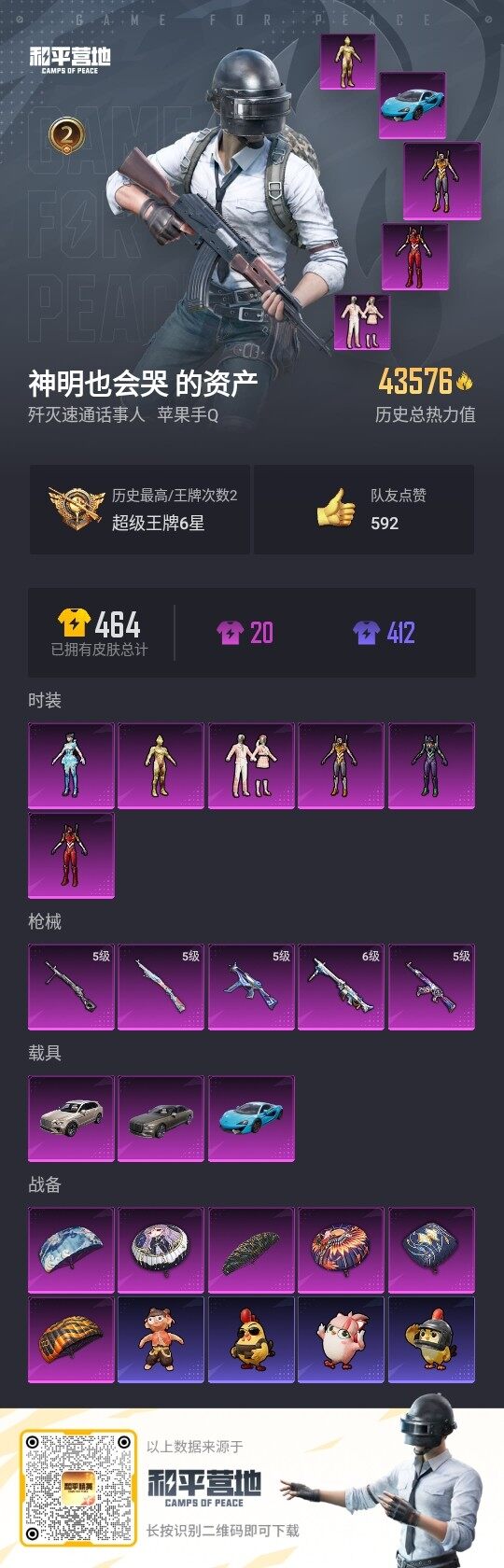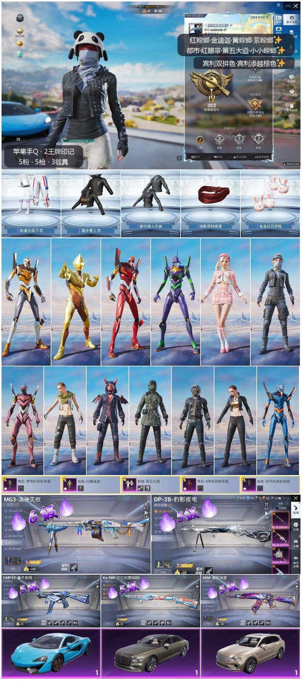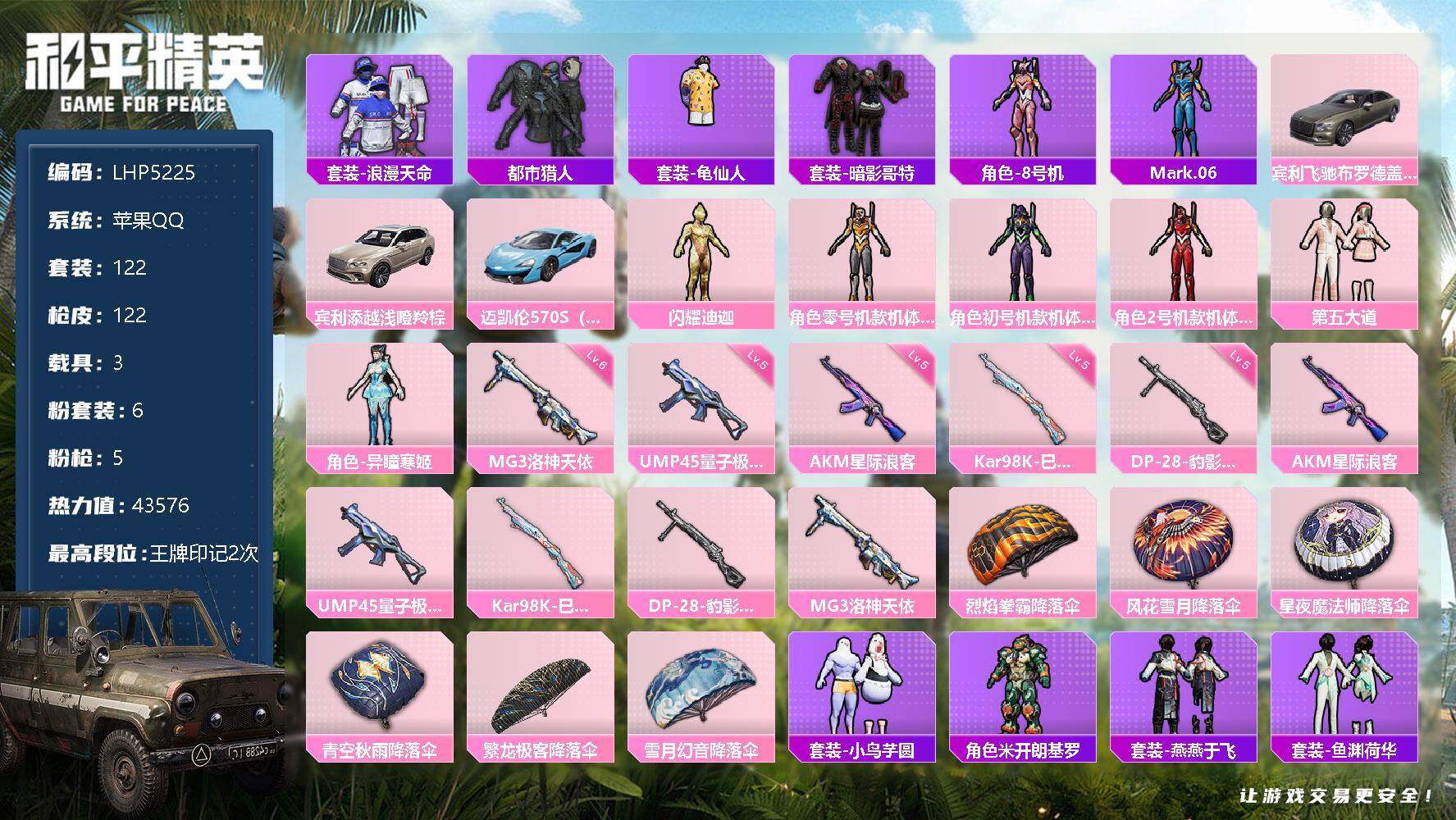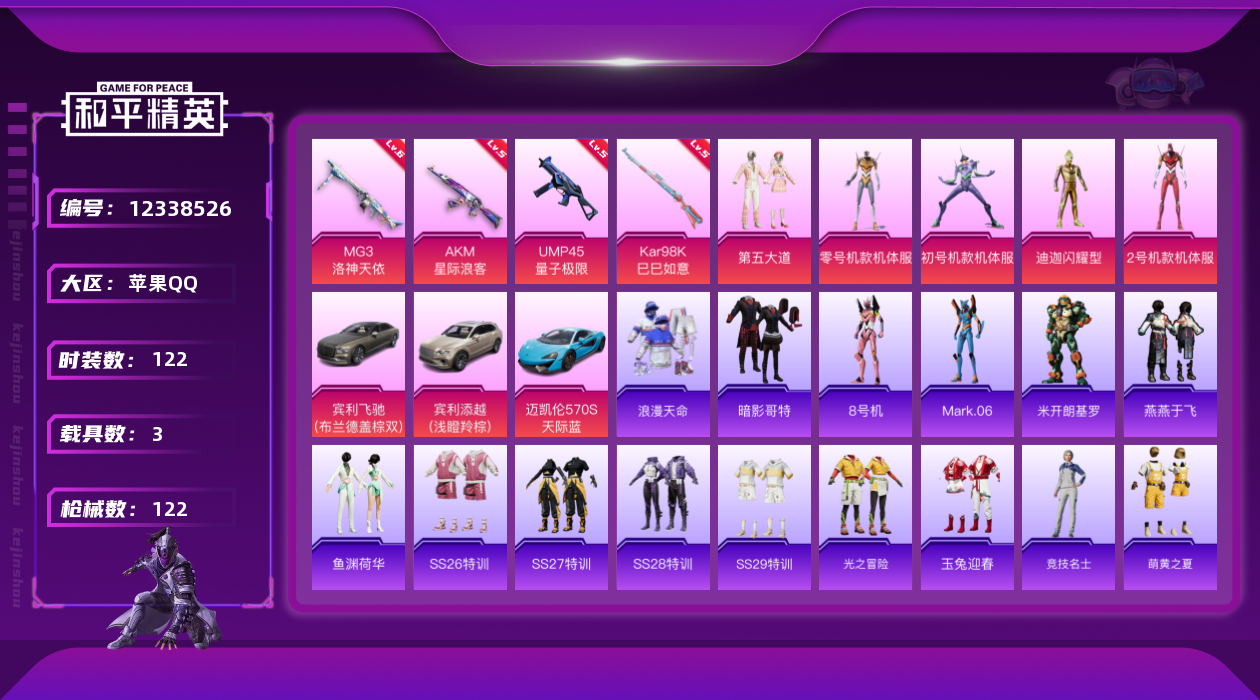 [12338526]素材身法号【特价急出/详情看图】:苹果 手Q-6粉装-5特效枪-3载具-4.3w热力值-2王牌印记-122套装-122枪皮【热门品类】:套装-浪漫天命,套装-都市猎人,套装-龟仙人,套装-暗影哥特,角色-8号机,角色-Mark.06【粉色载具】:宾利飞驰(布罗德盖棕双色),宾利添越(浅瞪羚棕),迈凯伦570S(天际蓝)【粉色套装】:角色-闪耀迪迦,角色-零号机款机体服,角色-初号机款机体服,角色-2号机款机体服,粉装-第五大道,角色-异瞳寒姬【粉色枪皮等级】:AKM-星际浪客(五级),UMP45-量子极限(五级),Kar98K-巳巳如意(五级),DP-28-豹影疾电(五级),MG3-洛神天依(六级)