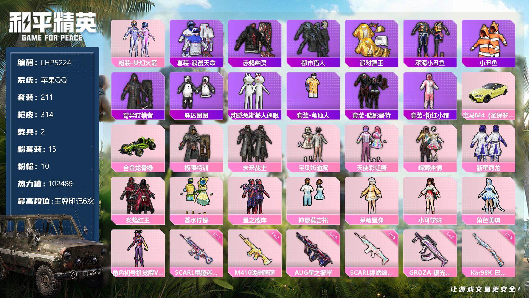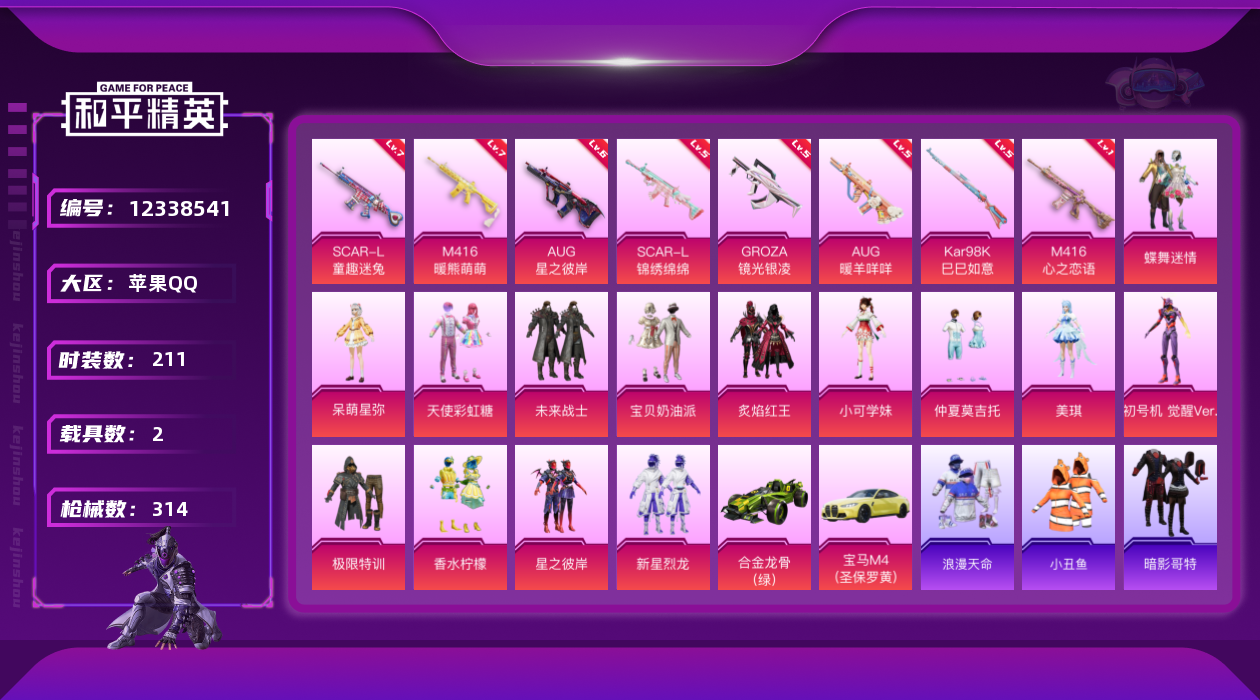 [12338541]素材身法号/地铁满天赋【特价急出/详情看图】:苹果 手Q-15粉装-10特效枪-2载具-7粉色飞行器-10.2w热力值-6王牌印记-211套装-314枪皮【热门品类】:粉装-梦幻火箭,套装-浪漫天命,套装-赤蝎幽灵,套装-都市猎人,套装-派对舞王,套装-深海小丑鱼,套装-小丑鱼,套装-奇异狩猎者,套装-胖达圆圆,套装-动感兔斯基人偶服,套装-龟仙人,套装-暗影哥特,套装-粉红小猪【粉色载具】:宝马M4(圣保罗黄),合金龙骨(绿)【粉色套装】:粉装-极限特训,粉装-未来战士,粉装-宝贝奶油派,粉装-天使彩虹糖,粉装-蝶舞迷情,粉装-梦幻火箭,粉装-新星烈龙,粉装-炙焰红王,粉装-香水柠檬,粉装-星之彼岸,粉装-仲夏莫吉托,角色-呆萌星弥,角色-小可学妹,角色-美琪,角色-初号机 觉醒Ver.【粉色枪皮等级】:SCAR-L-童趣迷兔(七级),SCAR-L-锦绣绵绵(五级),M416-心之恋语(一级),M416-暖熊萌萌(七级),GROZA-镜光银凌(五级),AUG-星之彼岸(六级),AUG-暖羊咩咩(五级),Kar98K-巳巳如意(五级),Mk14-甜梦熊击(五级),DP-28-豹影疾电(五级)【粉色飞行器】:星之彼岸飞行器,闪光银龙飞行器,超新星飞行器,沙丘之主天马,繁龙极客飞行器,镜域双华-灵镜之阶,圣域金龙飞行器