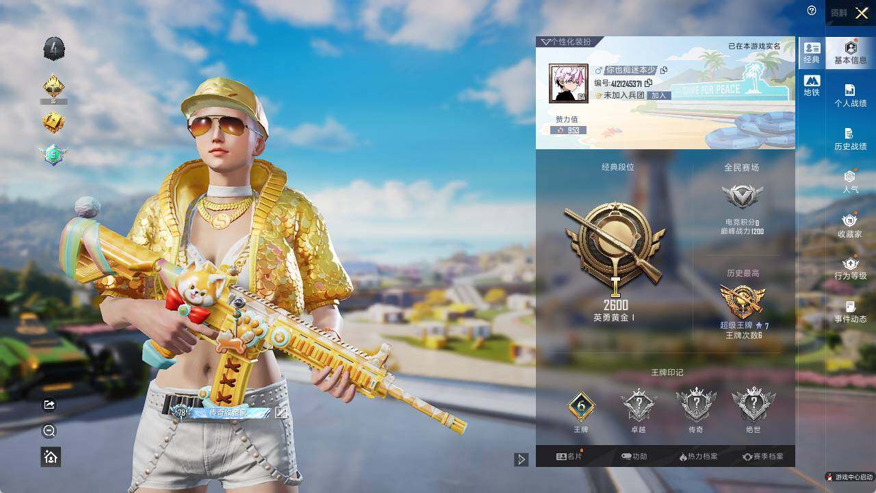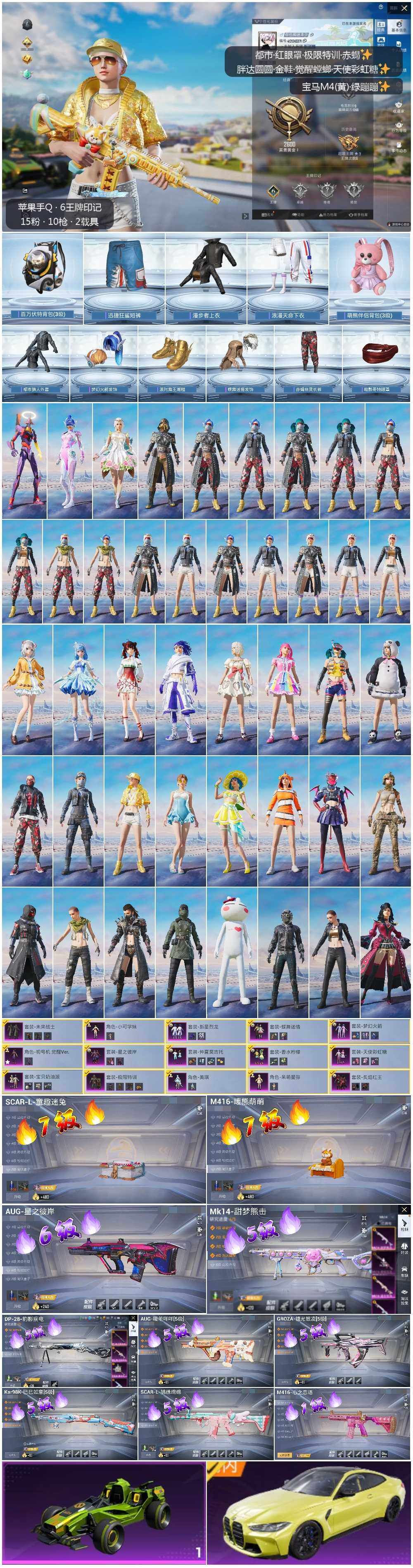 - [12144561]5粉装 1特效枪 1载具 1印记 可二次 可修改实名 优质装备:宾利飞驰(布罗德盖棕双色),Kar98K-巳巳如意 热门装扮:牧神之羯,暖暖奶龙,蜜语绒猫,美雪,美琪,浪漫波比 五级特效枪:五级Kar98K-巳巳如意 紫色装扮:SS22特训,SS21特训,SS20特训,冰爽海盐,治愈之星,科技之星,SS14特训,豚鼠丹丹,吉莉礼服,雪兔飞飞,酷萌兔限定,长空猛禽,霓虹街区,缤纷果语,绛羽幽主,魅力单车,黑色伏地魔,龙的传人,龟仙人,冰河战士,龙魂突击队,海岛探路者,幻世战舞者,探宝勇士,湖蓝色名流,疯狂小兔子,白色伏地魔,破蛋小黄鸡,空岛之星,空投萌叽,甜蜜熊情侣,牛气冲天,牛气满满,创世·幻影,纯真浪花,热情海星,SS28特训,巳巳如意,竞技名士,情公主,SS25特训,粉红小猪,焰鹰斗篷,幻羽潜行,幽夜迷踪,SS27特训,无暇誓言,雪晶战甲,小丑鱼,晨曦薄雾,SS26特训,春光漫游,快闪甜心,贝斯之夜,耀粉歌者,萌黄之夏 优质战备:圣堂之誓降落伞,精灵梦叶罗丽降落伞,忍者神龟降落伞,莲影清波降落伞,绝色倾城飞行器