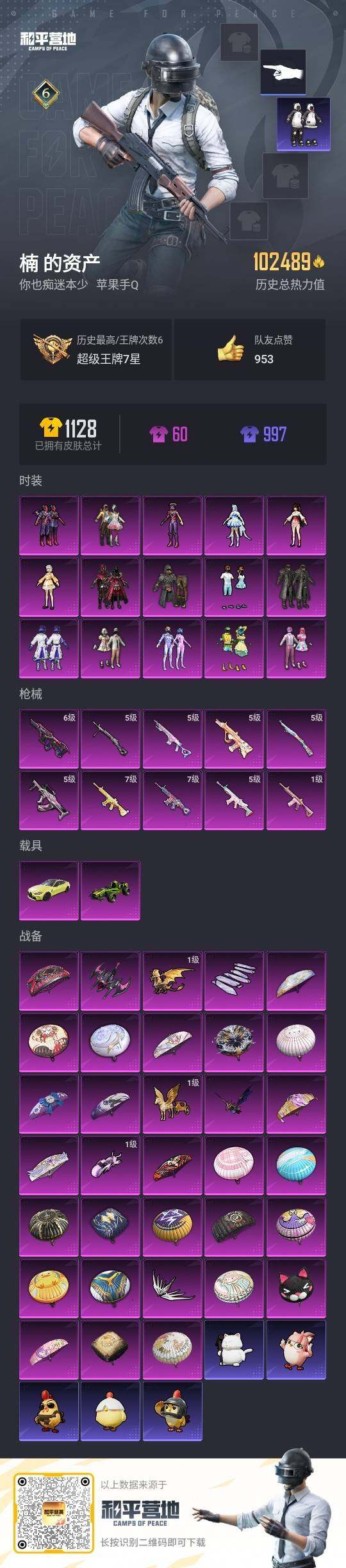 - PX_2102971- 苹果手Q-10王牌印记-10粉装-7特效枪-1载具-84921热力值-221套装-261枪皮-0卓越印记-0传奇印记 【10粉装】,梦幻火箭,千金淑猫,蓝莓炮弹,甜心娃娃,精灵娃娃,酣梦娃娃,冰霜白皇,炙焰红王,青葱仙萝,星之彼岸 【7特效枪】SCAR-L-童趣迷兔-6级 M416-暖熊萌萌-7级 M416-风花雪月-1级 M762-甜蜜誓约-7级 M762-甜心娃娃-1级