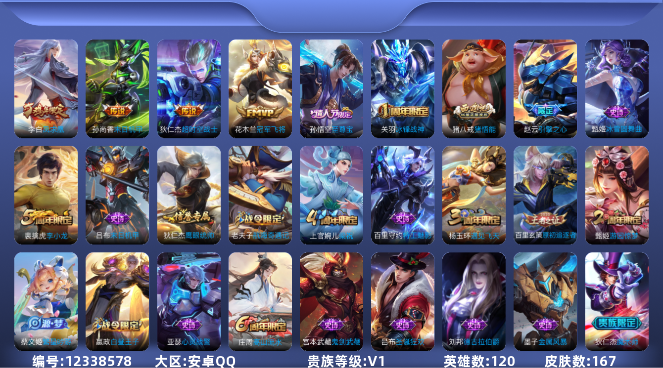 [12338578]【特价急出/详情看图】:安卓Q-V0-尊贵铂金III段位-120英雄-167皮肤-4传说-33史诗