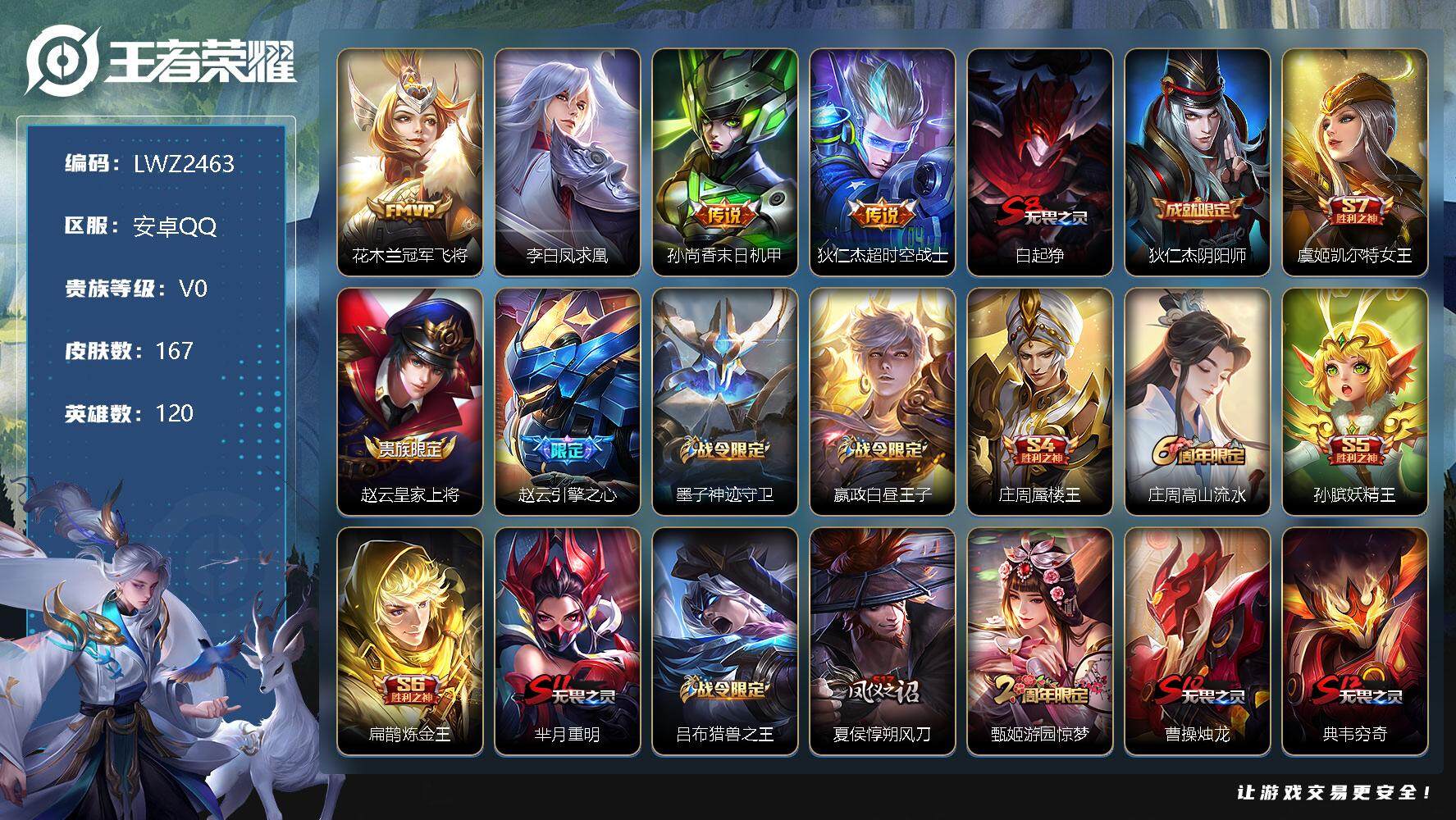[12338578]【特价急出/详情看图】:安卓Q-V0-尊贵铂金III段位-120英雄-167皮肤-4传说-33史诗 【传说皮肤】:花木兰冠军飞将,李白凤求凰,孙尚香末日机甲,狄仁杰超时空战士 【限定皮肤】:白起狰,狄仁杰阴阳师,虞姬凯尔特女王,赵云皇家上将,赵云引擎之心,墨子神迹守卫,嬴政白昼王子,庄周蜃楼王,庄周高山流水,孙膑妖精王,扁鹊炼金王,芈月重明,吕布猎兽之王,夏侯惇朔风刀,甄姬游园惊梦,曹操烛龙,典韦穷奇,狄仁杰魔术师,狄仁杰万华元夜,达摩沙漠行僧,项羽海滩派对,老夫子醍醐杖,老夫子航海奇遇记,关羽冰锋战神,程咬金演武夺筹,兰陵王金庭之子,亚瑟狮心王,孙悟空至尊宝,牛魔御旌,钟馗驱傩正仪,杨玉环遇见飞天,蔡文姬繁星吟游,太乙真人饕餮,东皇太一逐梦之光,鬼谷子原初探秘者,苏烈千军破阵,百里玄策原初追逐者,弈星混沌棋,沈梦溪大漠名商,明世隐疑决卦,裴擒虎李小龙,狂铁御狮,米莱狄御霄,盾山御銮,猪八戒猪悟能,上官婉儿梁祝 【年限皮肤】:李白凤求凰 【赛季限定】:庄周蜃楼王,孙膑妖精王,扁鹊炼金王,白起狰,芈月重明,夏侯惇朔风刀,曹操烛龙,典韦穷奇,狄仁杰万华元夜,达摩沙漠行僧,老夫子醍醐杖,程咬金演武夺筹,兰陵王金庭之子,亚瑟狮心王,牛魔御旌,虞姬凯尔特女王,钟馗驱傩正仪,太乙真人饕餮,鬼谷子原初探秘者,苏烈千军破阵,百里玄策原初追逐者,弈星混沌棋,沈梦溪大漠名商,明世隐疑决卦,狂铁御狮,米莱狄御霄,盾山御銮 【战令限定】:墨子神迹守卫,嬴政白昼王子,吕布猎兽之王,老夫子航海奇遇记 【史诗皮肤】:赵云皇家上将,貂蝉圣诞恋歌,甄姬冰雪圆舞曲,狄仁杰魔术师,廉颇地狱岩魂,宫本武藏鬼剑武藏,嬴政摇滚巨星,妲己魅力维加斯,墨子金属风暴,吕布圣诞狂欢,刘禅绅士熊喵,吕布末日机甲,张飞乱世虎臣,关羽冰锋战神,孙悟空至尊宝,赵云引擎之心,刘邦德古拉伯爵,甄姬游园惊梦,亚瑟心灵战警,百里守约特工魅影,刘禅天才门将,李元芳逐浪之夏,杨玉环遇见飞天,东皇太一逐梦之光,嬴政白昼王子,狄仁杰鹰眼统帅,上官婉儿梁祝,蔡文姬繁星吟游,百里玄策原初追逐者,裴擒虎李小龙,老夫子航海奇遇记,猪八戒猪悟能,庄周高山流水 【其他皮肤】:项羽海滩派对,韩信教廷特使,韩信街头霸王,露娜哥特玫瑰,阿轲致命风华,阿轲爱心护理,达摩大发明家,赵云忍炎影,程咬金星际陆战队,扁鹊化身博士,宫本武藏未来纪元,安琪拉玩偶对对碰,