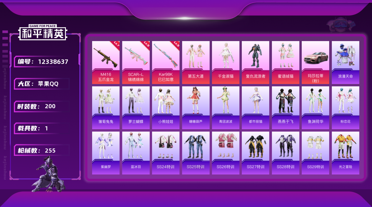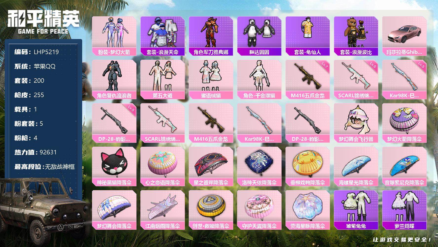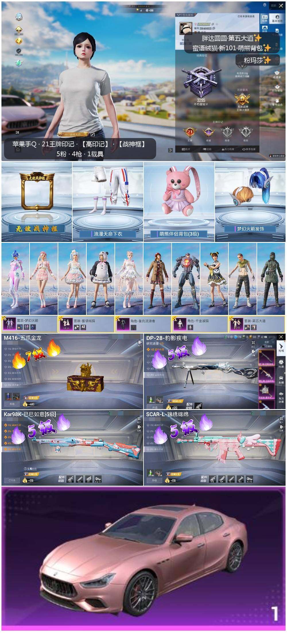 [12338637]素材身法号/无敌战神框1【特价急出/详情看图】:苹果 手Q-无敌战神框-5粉装-4特效枪-1载具-1粉色飞行器-9.2w热力值-21王牌印记-200套装-255枪皮【热门品类】:粉装-梦幻火箭,套装-浪漫天命,角色-军刀雅典娜,套装-胖达圆圆,套装-龟仙人,套装-浪漫波比【粉色载具】:玛莎拉蒂Ghibli(粉)【粉色套装】:粉装-梦幻火箭,角色-复仇流浪者,粉装-第五大道,粉装-蜜语绒猫,角色-千金淑猫【粉色枪皮等级】:SCAR-L-锦绣绵绵(五级),M416-五爪金龙(七级),Kar98K-巳巳如意(五级),DP-28-豹影疾电(五级)【粉色飞行器】:梦幻舞会飞行器