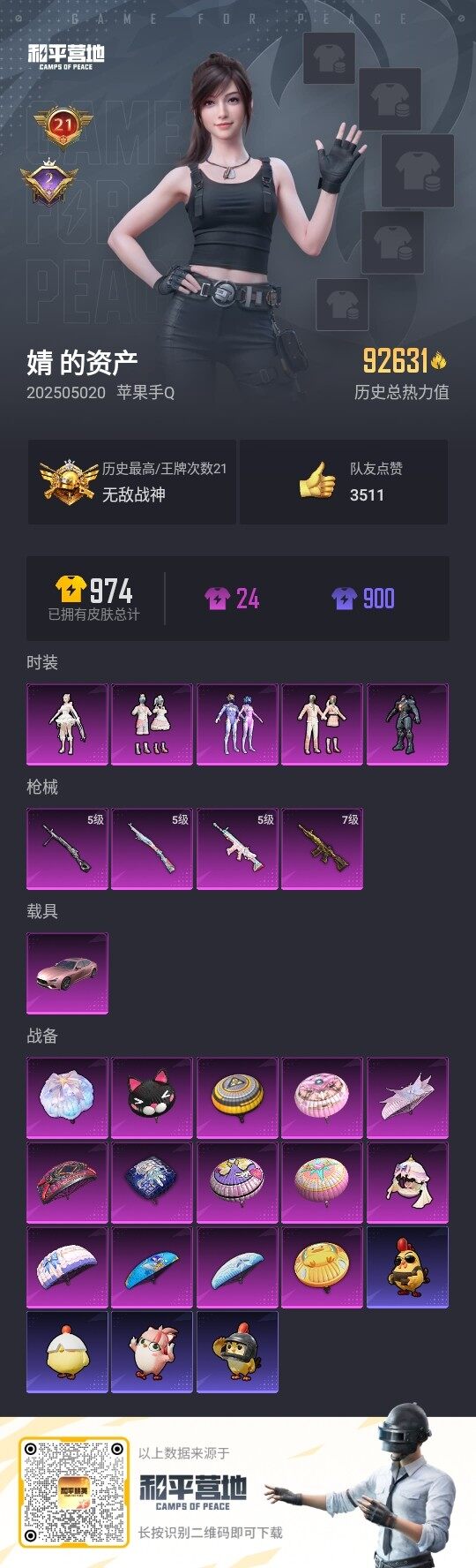 - PX_2090159- 苹果手Q-3王牌印记-1粉装-3特效枪-1载具-32110热力值-80套装-104枪皮-0卓越印记-0传奇印记 【1粉装】,蝶舞迷情 【3特效枪】Kar98K-巳巳如意-3级 AMR-智耀战神-4级 汤姆逊-怪笑疯兔-6级 【1稀有载具】,玛莎拉蒂Ghibli(蓝), 【80稀有时装】,SS31特训,SS33特训,SS32特训,蓝冰羽,紫幽梦,大橘大利,顶瓜瓜,白糯汤圆,