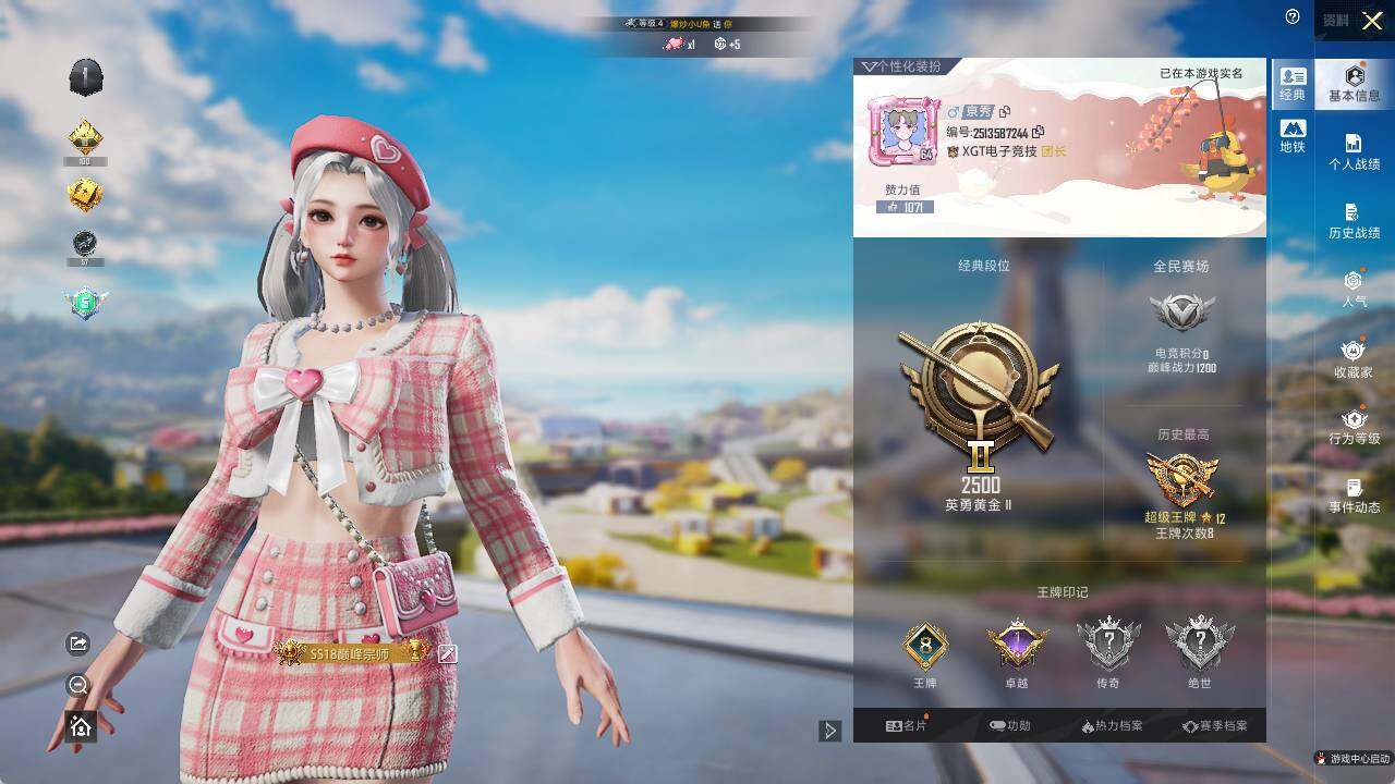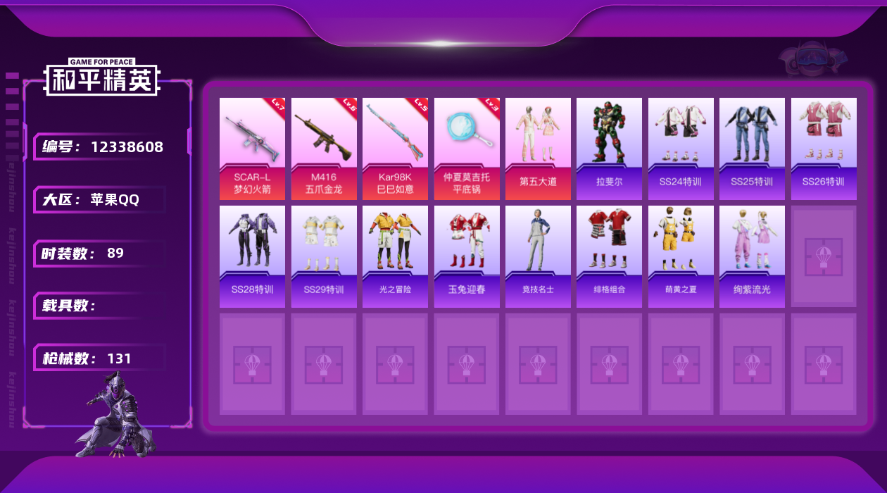 - [11433067]1粉装 6特效枪 1载具 3印记 可二次 可修改实名 身法装备:暗影哥特(红眼罩),萌熊伴侣背包(粉熊背包) 优质装备:路特斯ELETRE(冰川蓝),萌熊伴侣背包(粉熊背包),绚金战神,M416风花雪月,SCAR-L青春物语,GROZA-镜光银凌,AUG-暖羊咩咩,Kar98K-巳巳如意 热门装扮:鹰眼刺客 稀有枪皮:DP-28-豹影疾电 六级特效枪:六级SCAR-L-青春物语 五级特效枪:五级GROZA-镜光银凌,五级Kar98K-巳巳如意,五级AUG-暖羊咩咩,五级M416-风花雪月 四级特效枪:四级DP-28-豹影疾电 紫色装扮:娇憨猪猪,萌趣咩咩,SS21特训,SS31特训套装,冷焰舞者,SS30特训套装,SS33特训套装,SS20特训,时空追击者,暴风机械师,银白舞王,SS14特训,怪笑疯兔,萌趣颜团子,特种颜团子,SS19特训,甜心亚梦,虚音幻奏,电音精灵,SS17特训,SS18特训,长空猛禽,缤纷果语,街头潮人,骑行爱好者,魅力单车,鹤鸣,黄色伏地魔,黄色名流,黑色伏地魔,沙漠兵团,海岛探路者,幻影武者,夏日音浪,完美偶像,帅气教官,幻世战舞者,探宝勇士,湖蓝色名流,绮丽涂鸦,疯狂小兔子,白色伏地魔,破晓战魂,甜蜜告白,牛气冲天,灰色格斗者,炫蓝之夏,猛禽,特殊使命,特训学院,猎鹰,镭射皇者,鱼渊荷华,玉兔迎春,燕燕于飞,巳巳如意,竞技名士,暗影哥特(红眼罩),裁决冥王,大橘大利,SS12特训,蓝冰羽,紫幽梦,SS32特训服(SS32特训套装),猎影月神,青玉碎影,萌黄之夏,恋语绒绒,金耀舞者,蓝调潮人 优质战备:星途旅人降落伞,鬼刀降落伞,阿狸红降落伞