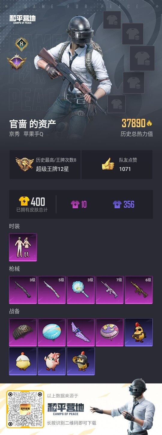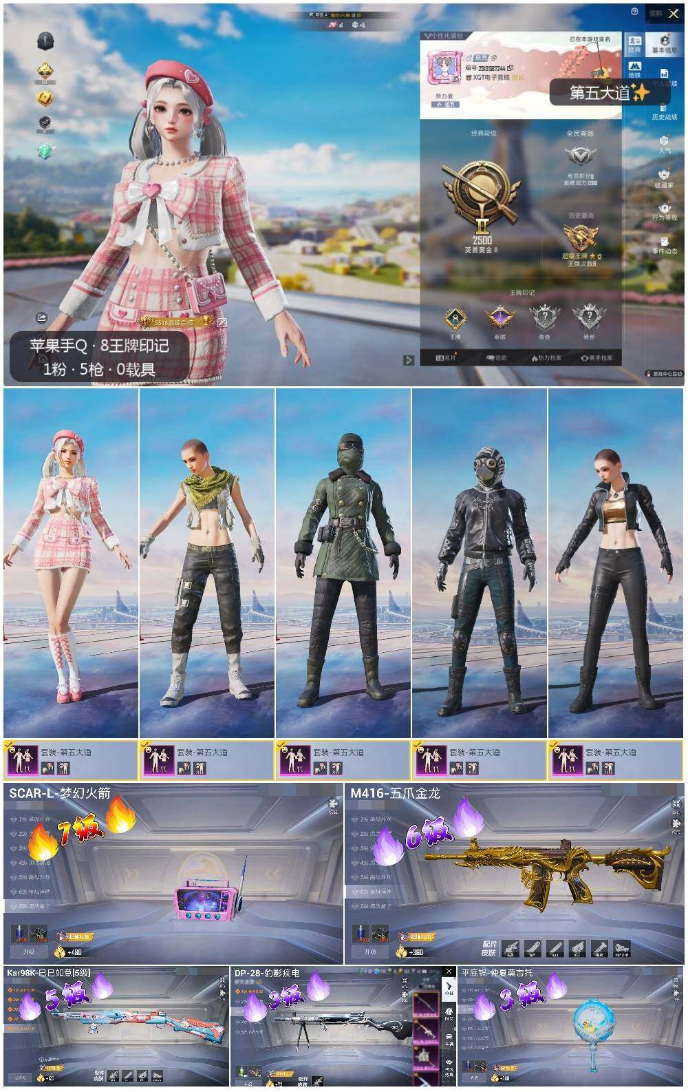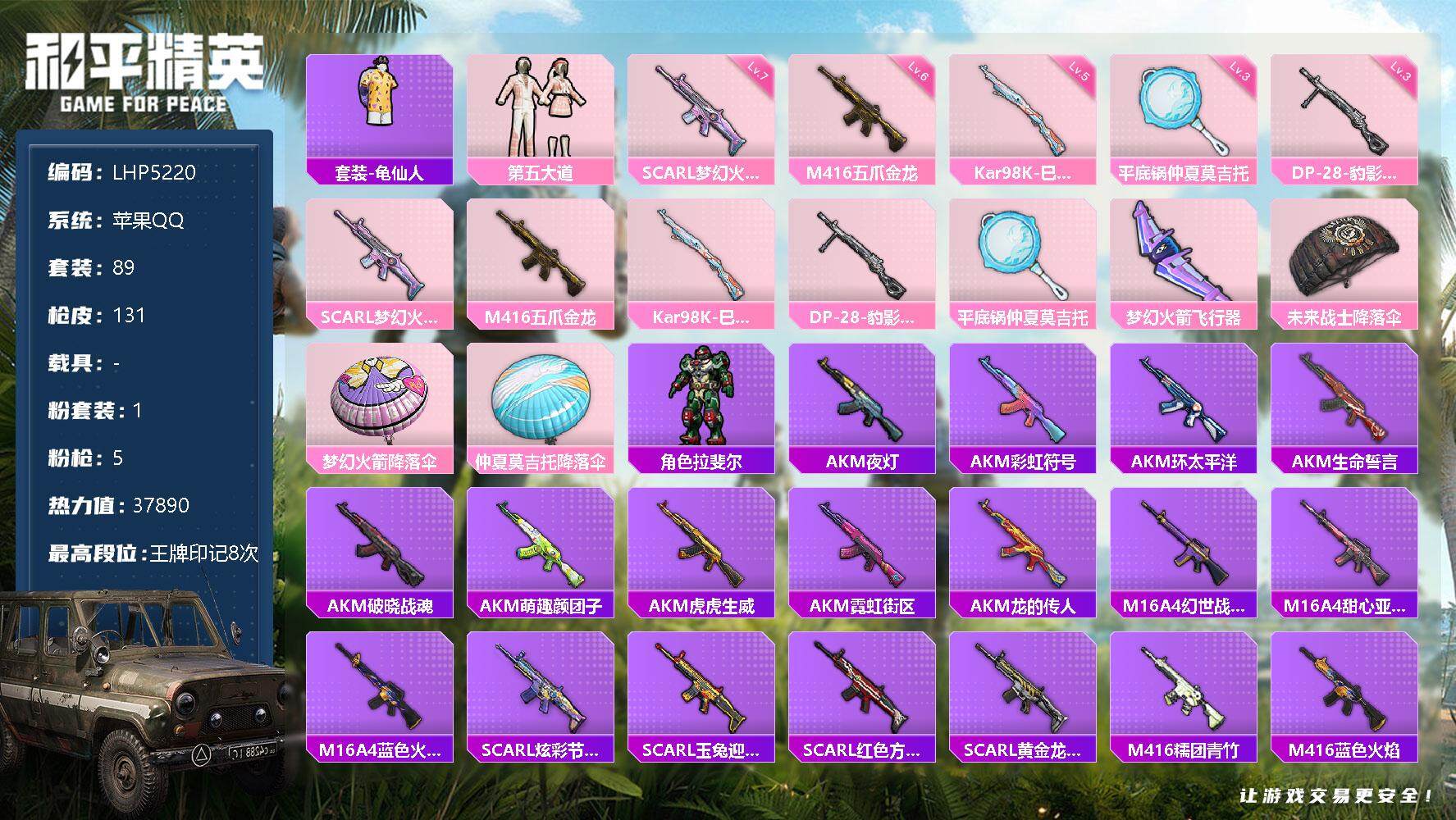 [12338608]【特价急出/详情看图】:苹果 手Q-1粉装-5特效枪-1粉色飞行器-3.7w热力值-8王牌印记-89套装-131枪皮【热门品类】:套装-龟仙人【粉色套装】:粉装-第五大道【粉色枪皮等级】:SCAR-L-梦幻火箭(七级),M416-五爪金龙(六级),Kar98K-巳巳如意(五级),DP-28-豹影疾电(三级),平底锅-仲夏莫吉托(三级)【粉色飞行器】:梦幻火箭飞行器