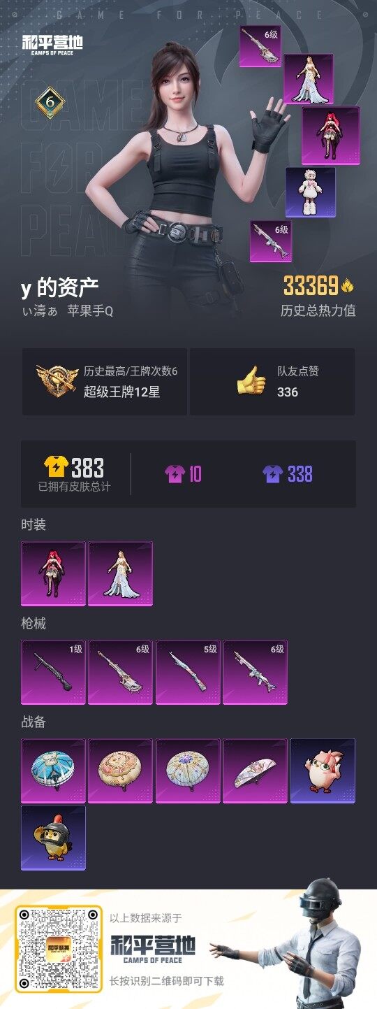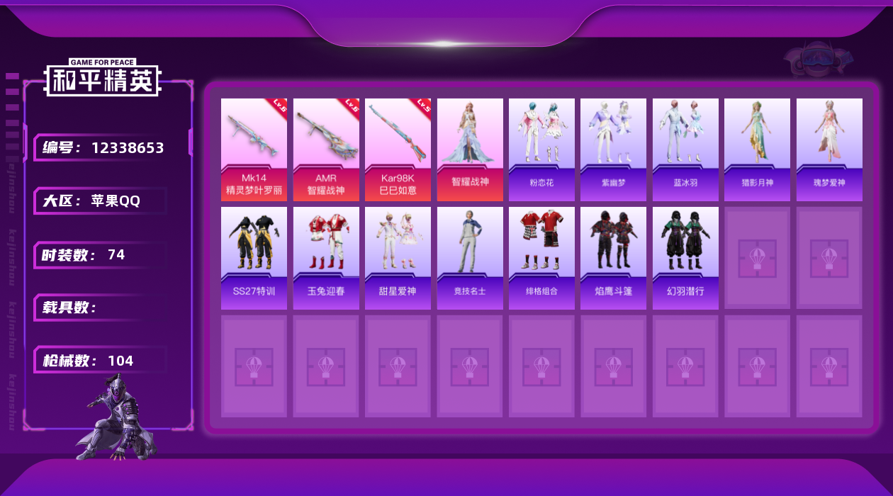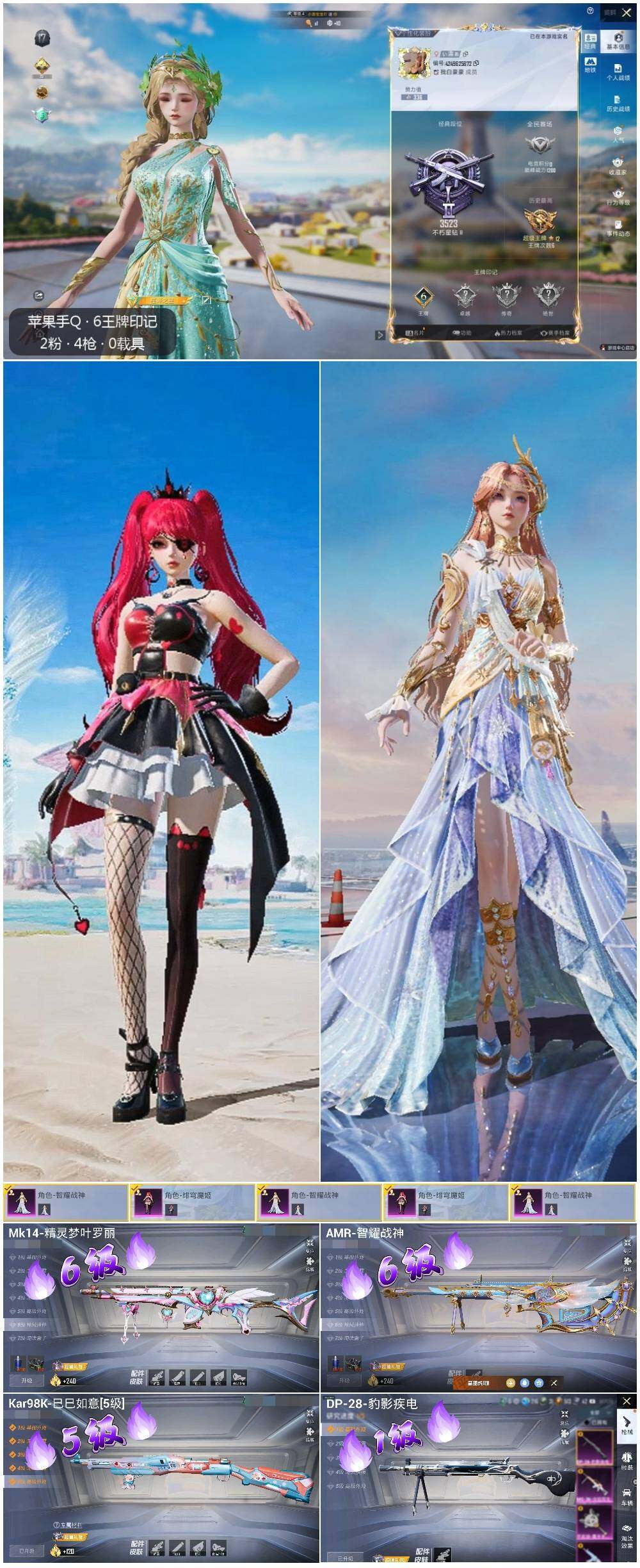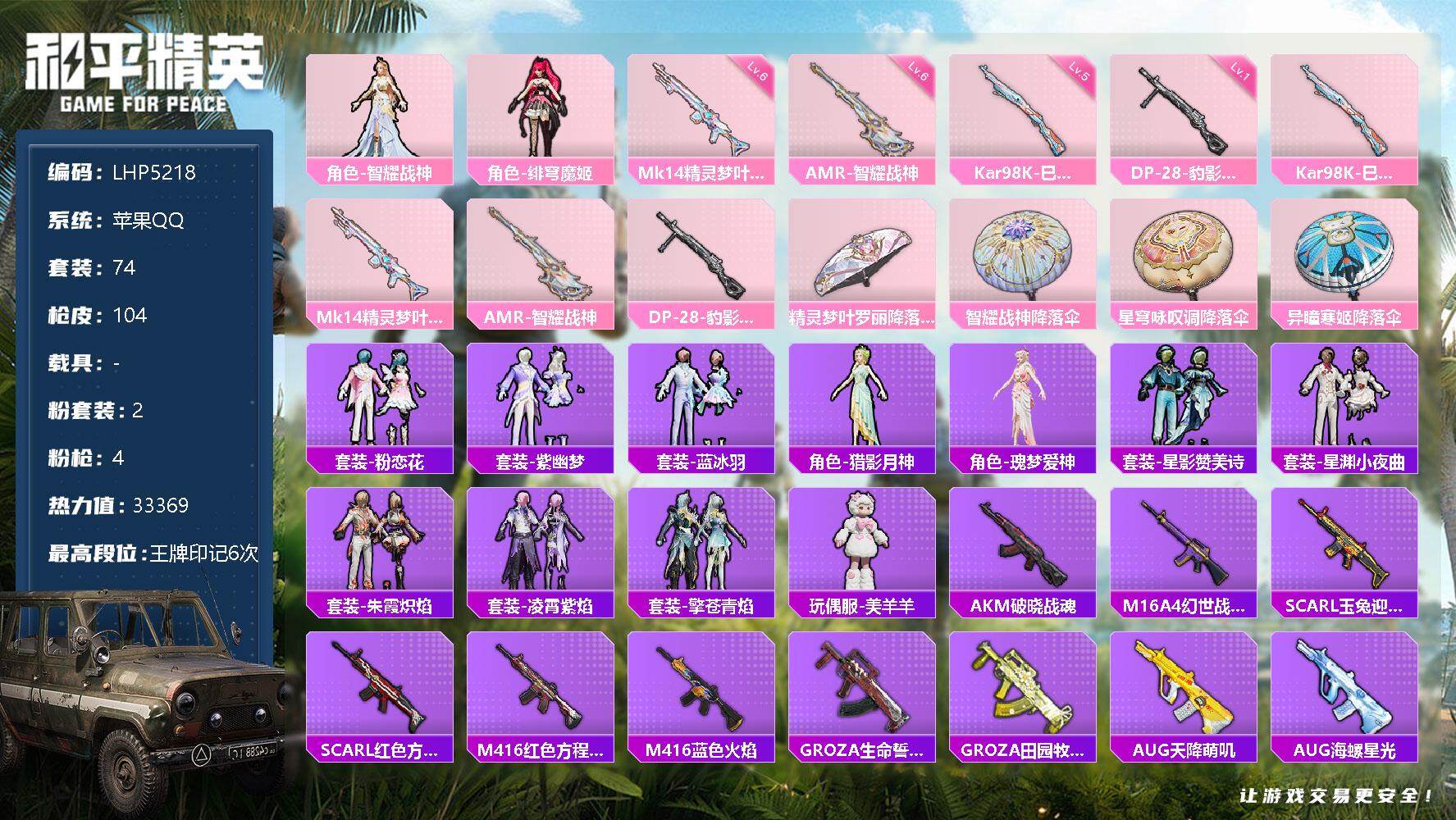 [12338653]【特价急出/详情看图】:苹果 手Q-2粉装-4特效枪-3.3w热力值-6王牌印记-74套装-104枪皮【粉色套装】:角色-智耀战神,角色-绯穹魔姬【粉色枪皮等级】:Kar98K-巳巳如意(五级),Mk14-精灵梦叶罗丽(六级),AMR-智耀战神(六级),DP-28-豹影疾电(一级)