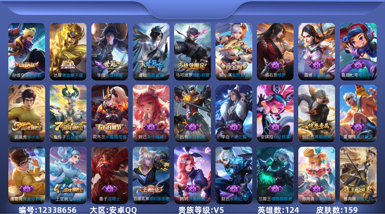 [12338656]【特价急出/详情看图】:安卓Q-V5-尊贵铂金I段位-123英雄-159皮肤-1典藏-3传说-36史诗