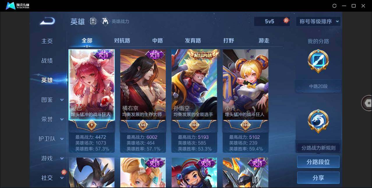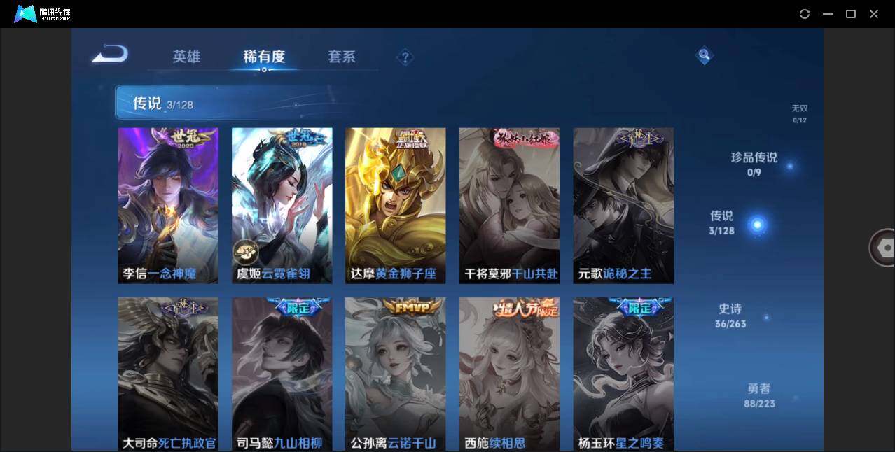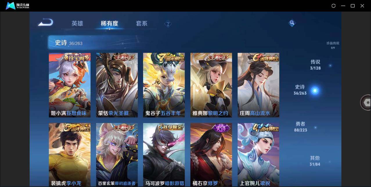 - [36856]英雄数: 124 勇者皮肤数: 109 史诗皮肤数: 33 传说皮肤数: 1 稀有英雄: 嬴政,韩信,夏洛特,艾琳,橘右京,娜可露露,不知火舞,赵云,金蝉,桑启,戈娅 当前段位: 铂金 限定皮肤: 遇见飞天,李小龙,游园惊梦,高山流水,猪悟能,五谷丰年 内测皮肤: 优雅恋人,女武神 史诗皮肤: 偶像歌手,冰冠公主,逐浪之夏,节奏热浪,摇滚巨星,水果甜心,天才门将,德古拉伯爵,暗隐猎兽者,鬼剑武藏,舞动绿茵,繁星吟游,缤纷独角兽,水晶猎龙者,曙光守护者,金属风暴,圣诞恋歌,热浪节奏(弃用),时之奇旅,拒霜思 赛季/战令皮肤: 疑决卦,醍醐杖,原初探秘者,万华元夜,演武夺筹,驱傩正仪,千军破阵,圣弓游侠,真爱魔法,沙漠行僧,金庭之子,大漠名商,云中旅人,海盐诗旅 普通皮肤: 五福同心,龙腾万里,花好人间,归虚梦演(蒙犽),归虚梦演(孙膑),归虚梦演(曜),海滩派对,海滩丽影,沉稳之力,守护之力,坚韧之力,敏锐之力,化身博士,炽热元素使,缤纷绘卷,纽约教父,特工战影,圆桌骑士(盾山),乓乓大师,万象初新,黄金武士,次元突破,大发明家,功夫老勺,鲨炮海盗猫,红桃皇后,教廷特使,阴阳师,汉昭烈帝,兔女郎,死亡骑士,少女阿狸,忍·炎影,丁香结,白执事,奇妙博物学,秘密基地,爱心护理,紫罗兰之誓,白色死神,野性能量,冰雪圆舞曲,铁甲之心,未来纪元(宫本武藏),拳王,玩偶对对碰,瓷语鉴心,街头霸王,制霸全明星,次元傲视,幻乐之宴,虹云星官,重装意志,圆桌骑士(太乙真人),孤猎,露花倒影,修竹墨客,幸存者,荷鲁斯之眼,冰刃幻境,伊势巫女,花见巫女,踏雪寻梅,未来旅行,三太子,龙域领主,第七人偶,地府判官,埃及法老,圣殿之光,生化警戒,金属狂潮,蔷薇王座,万圣前夜,异域舞娘,潮流仙人,东海龙王,星航指挥官,战争女神,激情绿茵,精灵王,加勒比小姐,死神来了,熊喵少女,芝加哥教父,赤焰之缨,美梦成真,启蛰,秩序猎龙将,森,创世神祝,年年有余,极冰防御线,魇语军师,海之征途,午夜歌剧院,精准探案法,街头旋风,霓裳曲,花间舞,绝影神枪,战争骑士,天启骑士,特种部队,范海辛,隐刃,绯红之刃,木偶奇遇记,西部大镖客(孙悟空),海军大将,帝国元帅,精灵公主,锦衣卫,一千零一夜,时尚教父,超能战警,英喵野望,前尘,碧珀绯影,无双福将,画中游,唤灵魔甲,契约魔法,蔚蓝守将,潮玩探月行