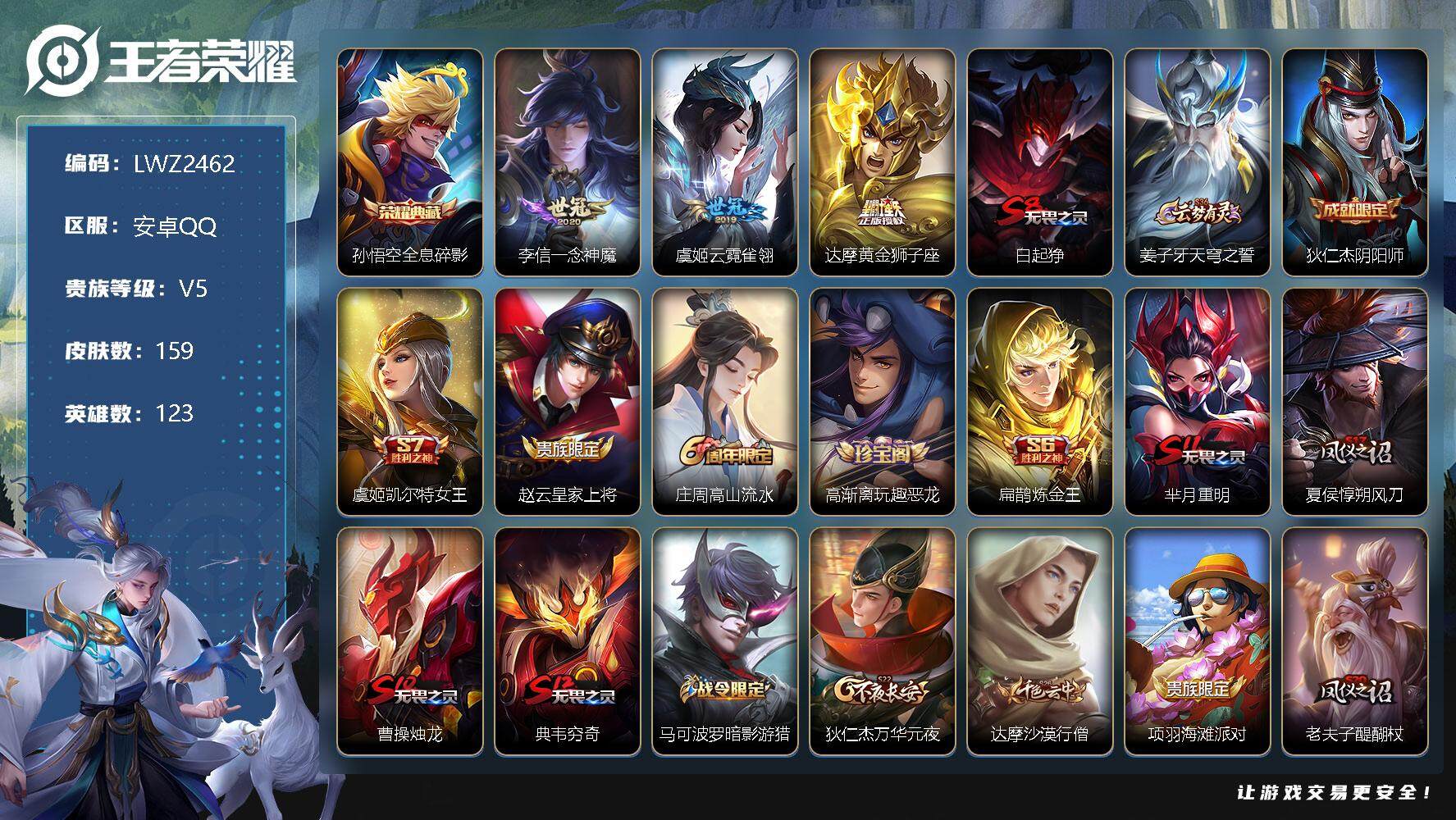 [12338656]【特价急出/详情看图】:安卓Q-V5-尊贵铂金I段位-123英雄-159皮肤-1典藏-3传说-36史诗 【荣耀典藏】:孙悟空全息碎影 【传说皮肤】:李信一念神魔,虞姬云霓雀翎,达摩黄金狮子座 【限定皮肤】:白起狰,姜子牙天穹之誓,狄仁杰阴阳师,虞姬凯尔特女王,赵云皇家上将,庄周高山流水,高渐离玩趣恶龙,扁鹊炼金王,芈月重明,夏侯惇朔风刀,曹操烛龙,典韦穷奇,马可波罗暗影游猎,狄仁杰万华元夜,达摩沙漠行僧,项羽海滩派对,老夫子醍醐杖,程咬金演武夺筹,兰陵王金庭之子,牛魔御旌,李元芳云中旅人,钟馗驱傩正仪,雅典娜黎明之约,太乙真人饕餮,鬼谷子原初探秘者,鬼谷子五谷丰年,苏烈千军破阵,百里玄策原初追逐者,弈星混沌棋,沈梦溪大漠名商,明世隐疑决卦,裴擒虎李小龙,裴擒虎擒涛扼浪,狂铁御狮,米莱狄御霄,盾山御銮,猪八戒西部大镖客,上官婉儿梁祝,桑启海盐诗旅,蒙恬荣光圣徽,鬼谷子天穹祈灯,姬小满妄想食味,周瑜熔金海岸 【赛季限定】:扁鹊炼金王,白起狰,芈月重明,夏侯惇朔风刀,曹操烛龙,典韦穷奇,狄仁杰万华元夜,达摩沙漠行僧,老夫子醍醐杖,程咬金演武夺筹,兰陵王金庭之子,牛魔御旌,李元芳云中旅人,虞姬凯尔特女王,钟馗驱傩正仪,雅典娜黎明之约,太乙真人饕餮,鬼谷子原初探秘者,苏烈千军破阵,百里玄策原初追逐者,弈星混沌棋,沈梦溪大漠名商,明世隐疑决卦,裴擒虎擒涛扼浪,狂铁御狮,米莱狄御霄,盾山御銮,桑启海盐诗旅,鬼谷子天穹祈灯,蒙恬荣光圣徽,姜子牙天穹之誓 【战令限定】:马可波罗暗影游猎,猪八戒西部大镖客 【史诗皮肤】:鲁班七号电玩小子,露娜紫霞仙子,赵云皇家上将,赵云未来纪元,貂蝉圣诞恋歌,孙尚香水果甜心,妲己女仆咖啡,墨子龙骑士,墨子金属风暴,吕布圣诞狂欢,刘禅绅士熊喵,李白千年之狐,吕布末日机甲,张飞乱世虎臣,韩信白龙吟,花木兰水晶猎龙者,刘邦德古拉伯爵,夏侯惇乘风破浪,小乔缤纷独角兽,兰陵王暗隐猎兽者,诸葛亮黄金分割率,安琪拉心灵骇客,李元芳逐浪之夏,程咬金功夫厨神,阿轲节奏热浪,狄仁杰鹰眼统帅,上官婉儿梁祝,橘右京修罗,马可波罗暗影游猎,百里玄策原初追逐者,裴擒虎李小龙,庄周高山流水,雅典娜黎明之约,鬼谷子五谷丰年,蒙恬荣光圣徽,姬小满妄想食味 【其他皮肤】:项羽海滩派对,韩信教廷特使,露娜哥特玫瑰,阿轲致命风华,达摩大发明家,赵云忍炎影,扁鹊化身博士,宫本武藏未来纪元,安