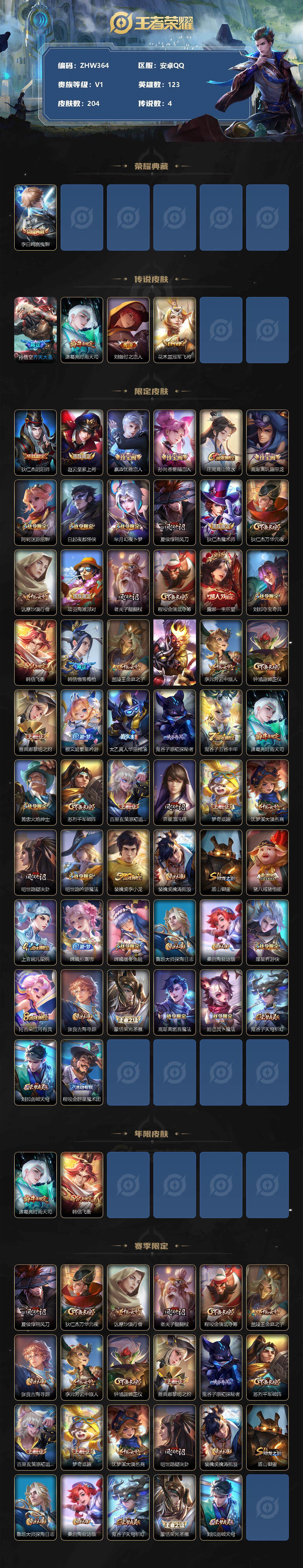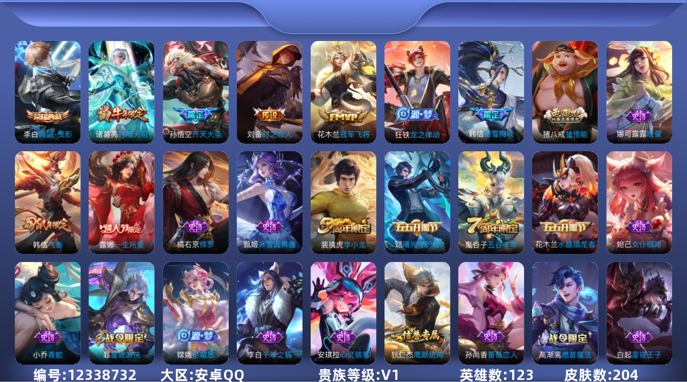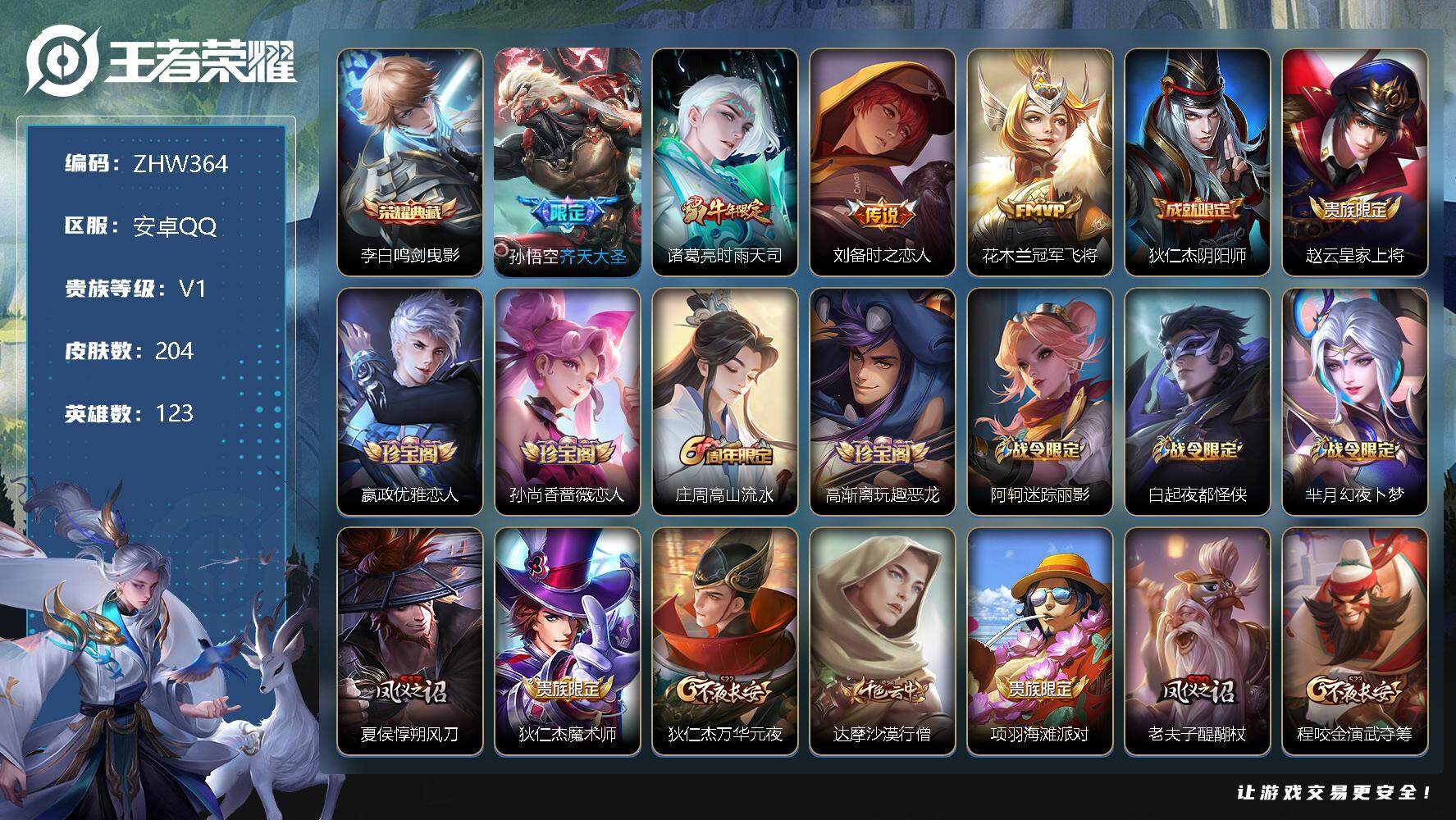 [12338732]【特价急出/详情看图】:安卓Q-V1-最强王者段位-123英雄-204皮肤-1典藏-0珍品无双-0无双-0珍品传说-4传说-56史诗